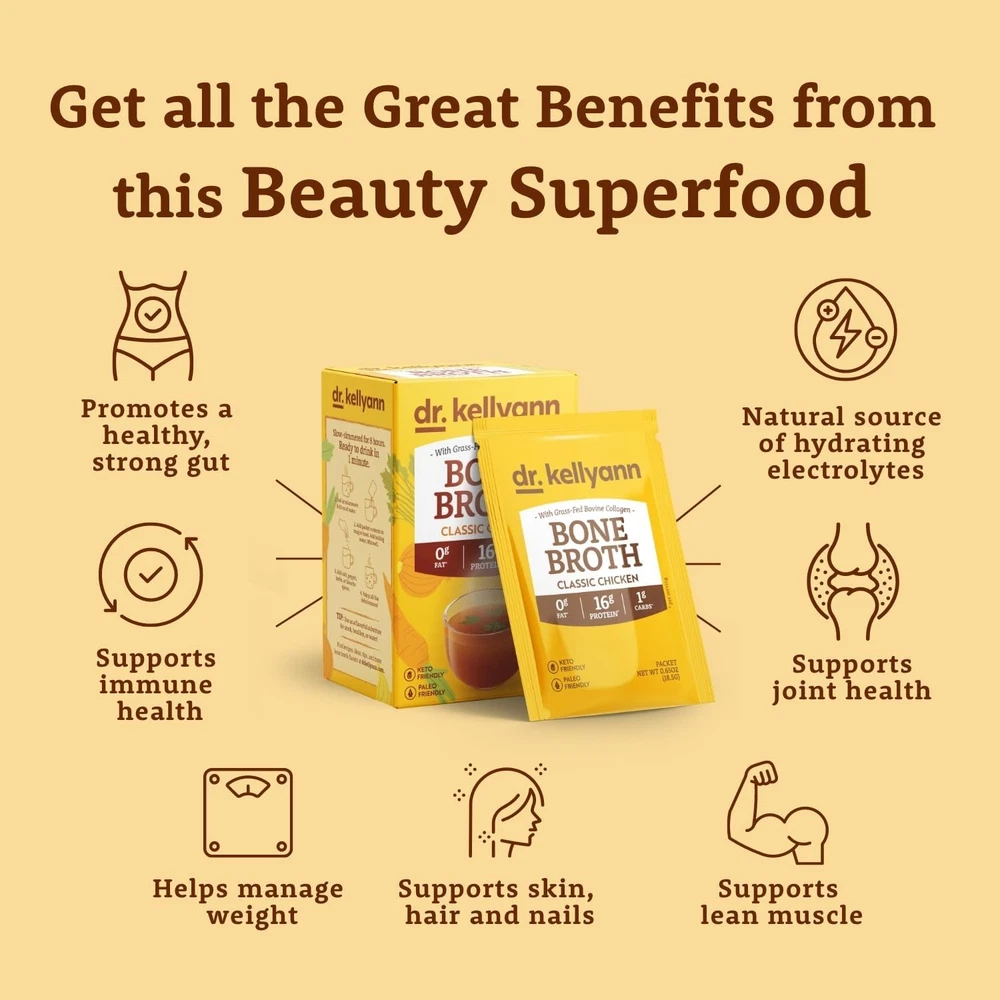 Dr. Kellyann Bone Broth Collagen Powder Packets (7 Servings) – 16g Protein, Grass-Fed Hydrolyzed Collagen, Keto & Paleo-Friendly CREATED BY DR. KELLYANN, RENOWNED BONE BROTH PIONEER: Formulated by New York Times bestselling author and nutrition expert Dr. Kellyann Petrucci, these collagen-packed bone broth packets are rooted in her dedication to health, beauty, and vitality. POWERFUL 16G PROTEIN PER SERVING: Each packet is rich in grass-fed hydrolyzed collagen to nourish your skin, joints, and muscles while supporting gut health and overall wellness. KETO & PALEO-FRIENDLY NUTRITION: Designed to fit seamlessly into low-carb lifestyles, this bone broth is free from artificial ingredients, gluten, and dairy, making it the perfect choice for clean eating. CONVENIENT & ON-THE-GO NUTRITION: Lightweight and portable packets are ideal for busy lifestyles—simply mix with hot water to enjoy a nourishing, satisfying meal anytime, anywhere. GLOW FROM WITHIN WITH COLLAGEN PEPTIDES: Packed with collagen peptides to support skin elasticity, this bone broth helps you look and feel your best, inside and out. Shipping We offer FREE shipping on all orders! We ship within Three business days of payment, usually sooner. We use a selection of shipping services such as UPS, FedEx, USPS etc. We only ship to the lower 48 states, no APO/FPO addresses or PO Boxes allowed. Local pickups and combined shipping options are not provided at this time. Return You can return a product for up to 30 days from the date you purchased it. Any product you return must be in the same condition you received it and in the original packaging. Please keep the receipt. Payment We accept payment by any of the following methods: PayPal Please pay as soon as possible after winning an auction, as that will allow us to post your item to you sooner! Feedback Customer satisfaction is very important to us. If you have any problem with your order, please contact us and we will do our best to make you satisfied. Contact Us If you have any queries, please contact us via ebay. We usually respond within 24 hours on weekdays. Please visit our eBay store to check out other items for sale! Thank you for shopping at our store.