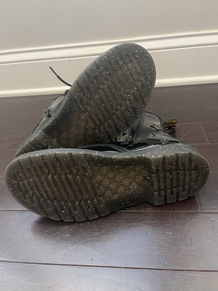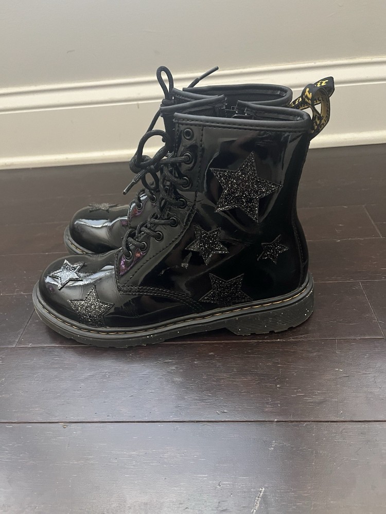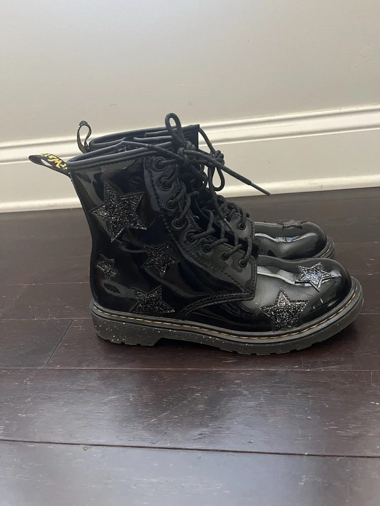 Step out in bold style with these classic Dr. Martens 1460 boots featuring a glossy black patent leather finish and fun glittery star accents. Perfect for kids and teens who love to make a statement, these boots combine signature Docs durability with a playful twist. • Size: Youth 6M • Color: Black Patent with Glitter Star Details • Features: • Iconic yellow stitching and pull tabs • Lace-up front with side zipper for easy on/off • Durable AirWair cushioned sole for comfort and bounce • Glossy finish adds standout shine Pre-owned and in great condition with light signs of wear. Perfect for everyday wear or dressing up with an edgy flair!