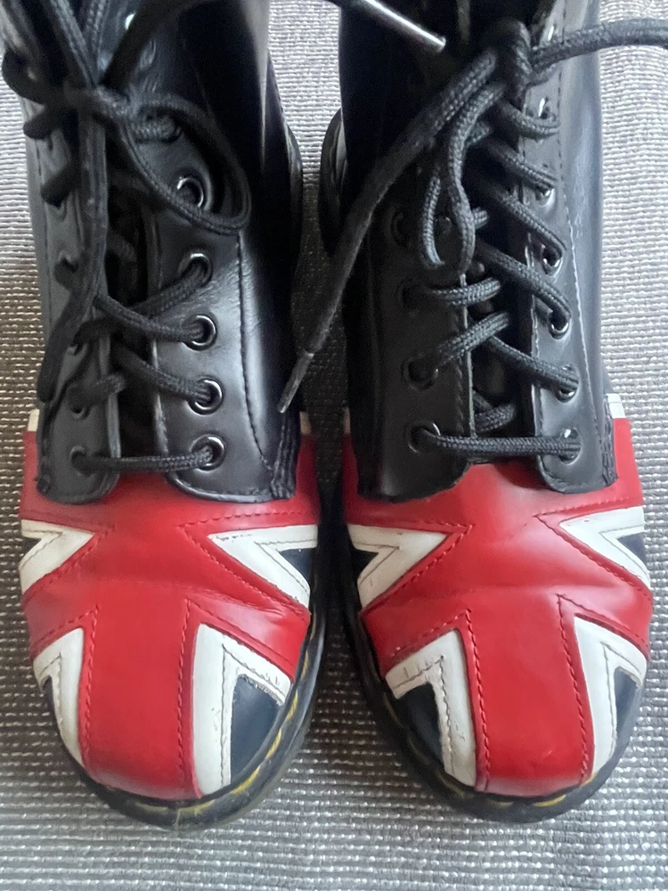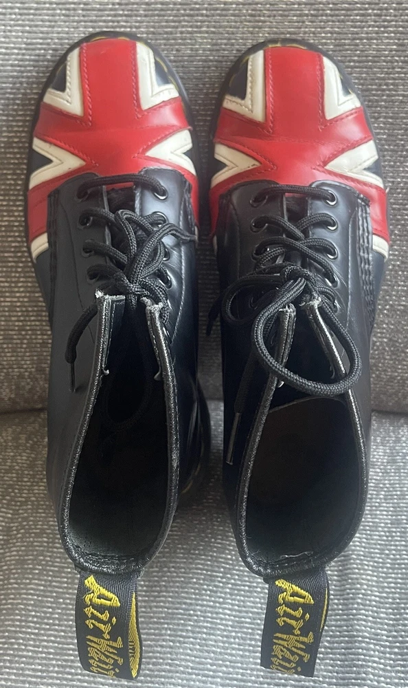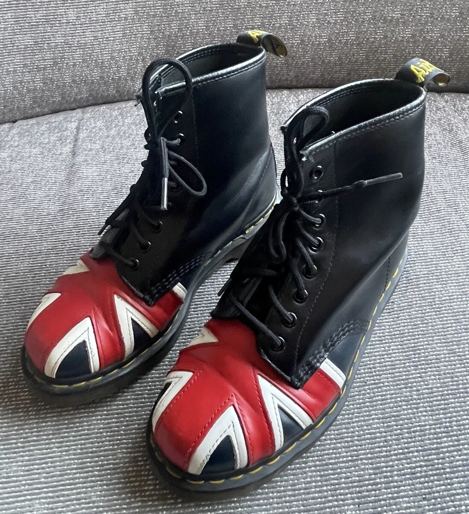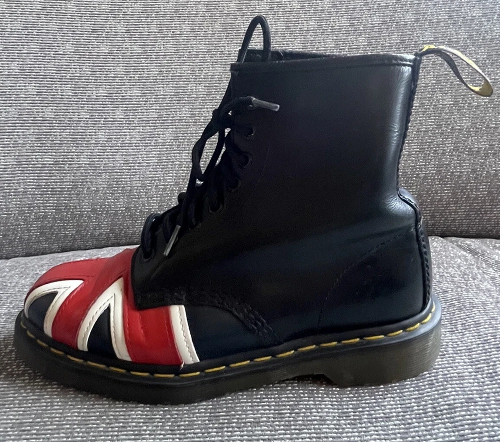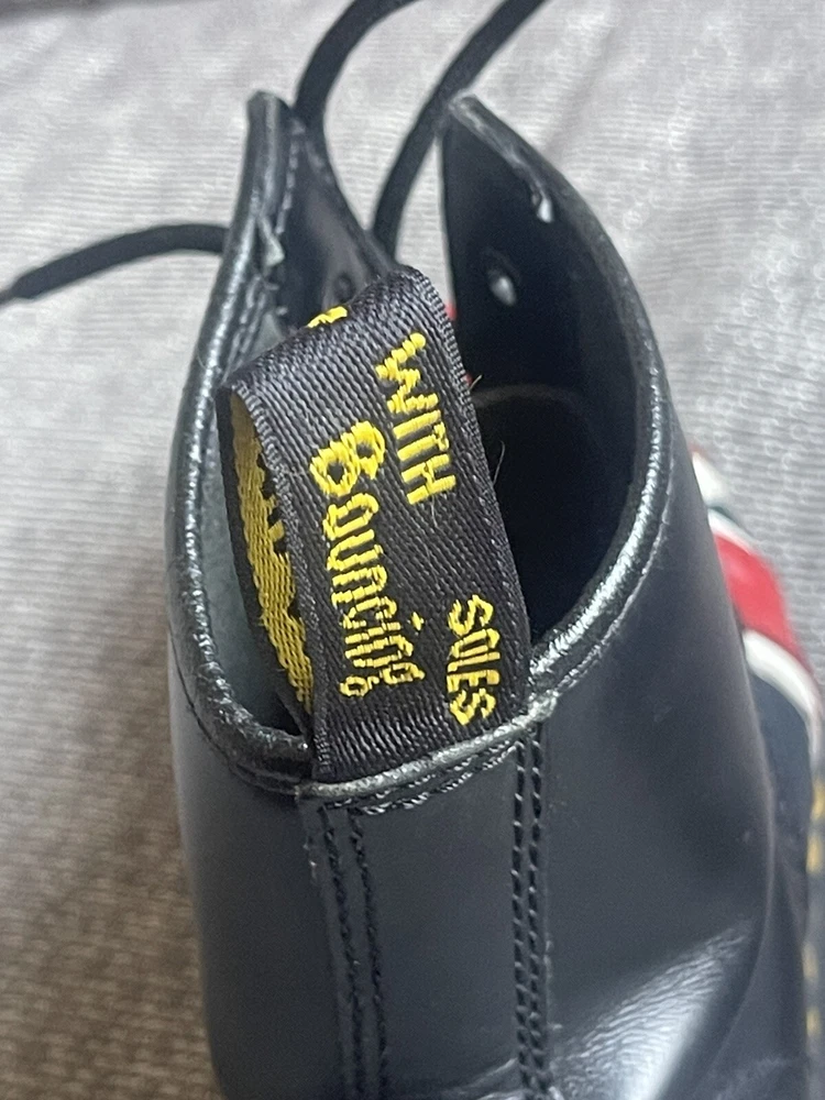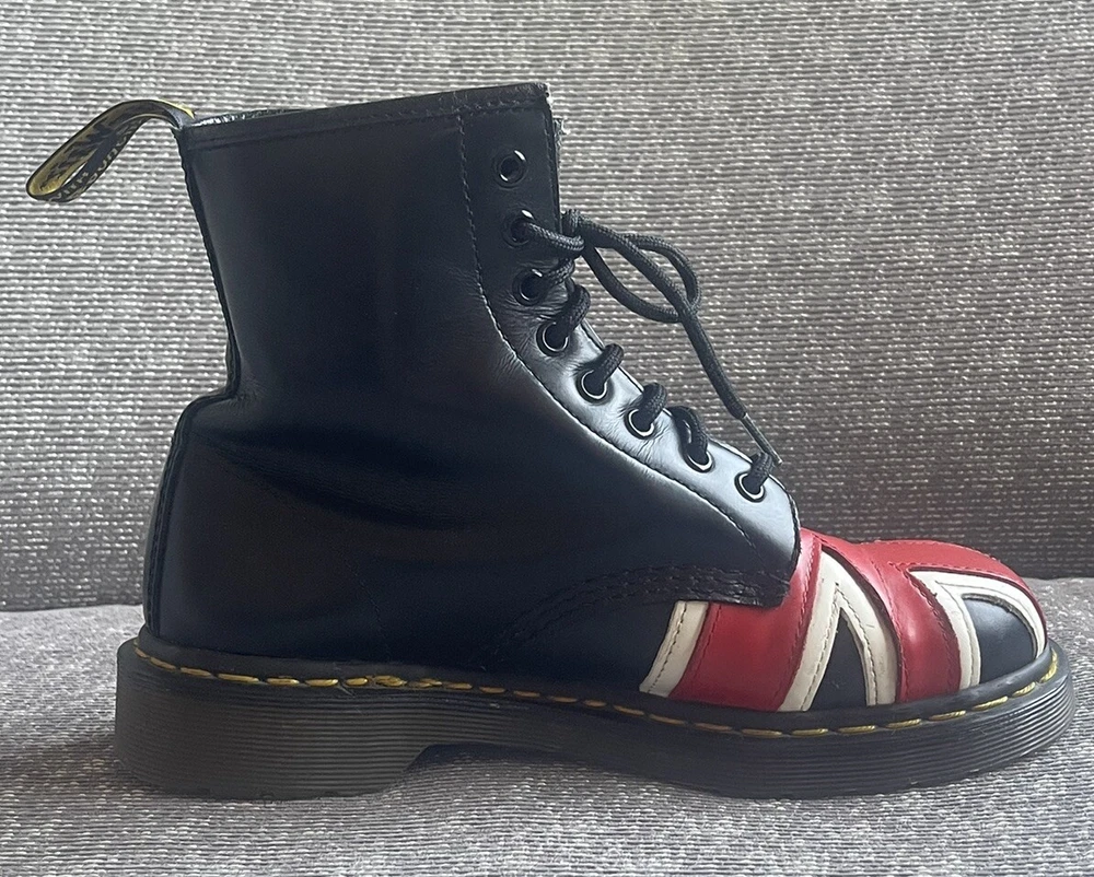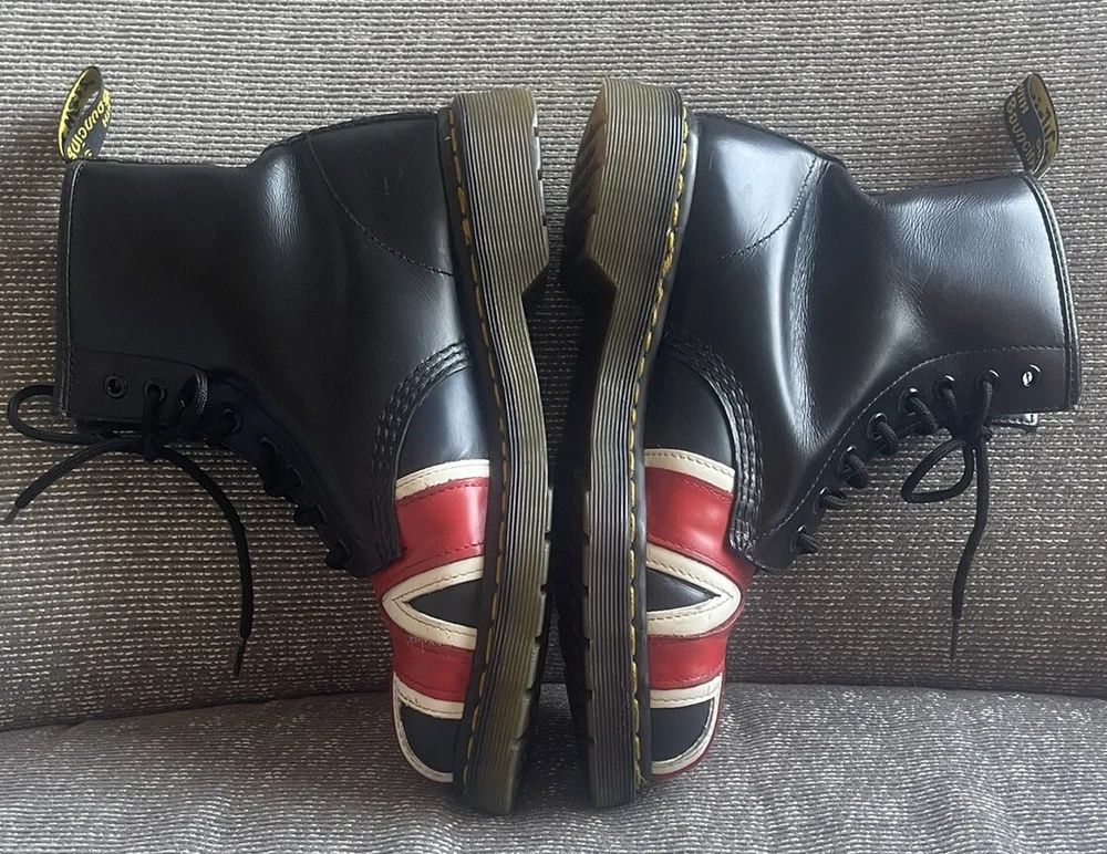 Elevate your shoe game with these stylish Dr. Martens boots featuring the iconic Union Jack British flag design. Made with high-quality leather and bouncing soles, these boots offer both comfort and non-slip protection. Perfect for any occasion, whether it be casual wear or travel, these boots are a versatile addition to any wardrobe. With a round toe and tie closure, these unisex boots fit US shoe size 7 for men and 8 for women. The black, red, and white color scheme complement the British flag pattern, making these boots stand out from the crowd. Add a touch of biker, motorcyclist, or grunge style to your look with these Doc Martens.