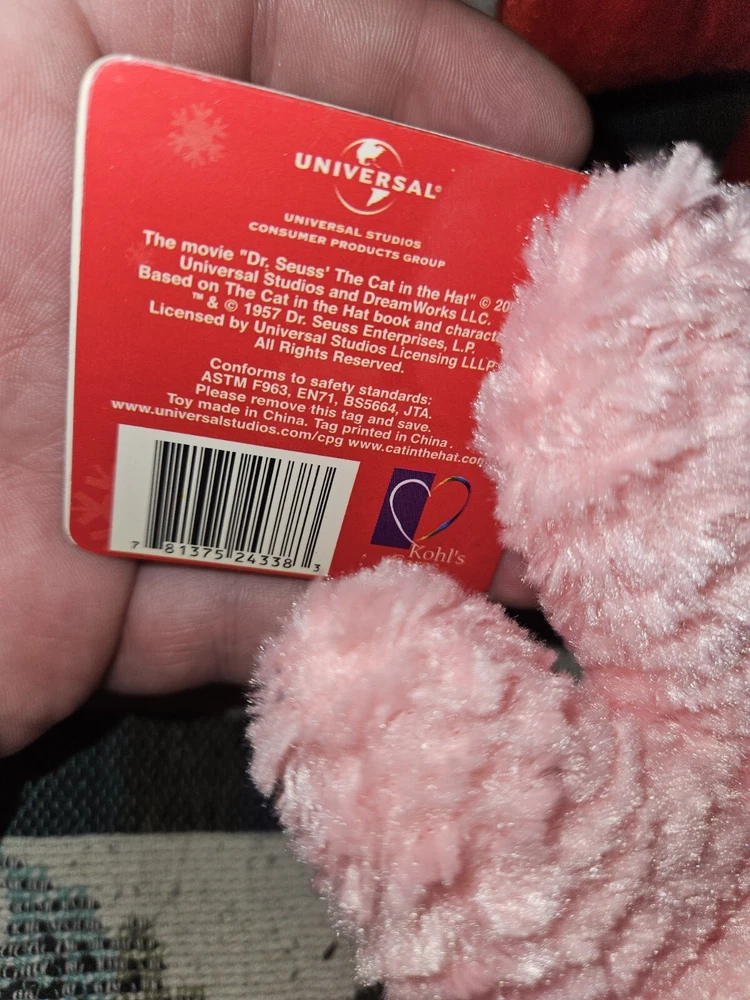 Type:Stuffed AnimalUPC:Does not applygtin13:Does not applyAuthor:Dr SeussAnimal:FishColor:PinkBook:Cat in the HatModified Item:NoBrand:Kohl's CaresCharacter Family:Dr SeussSize:Small (6-14 in)Recommended Age Range:all ages