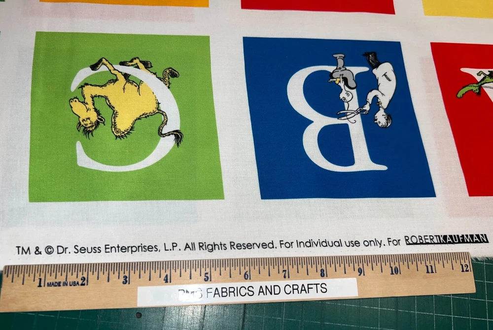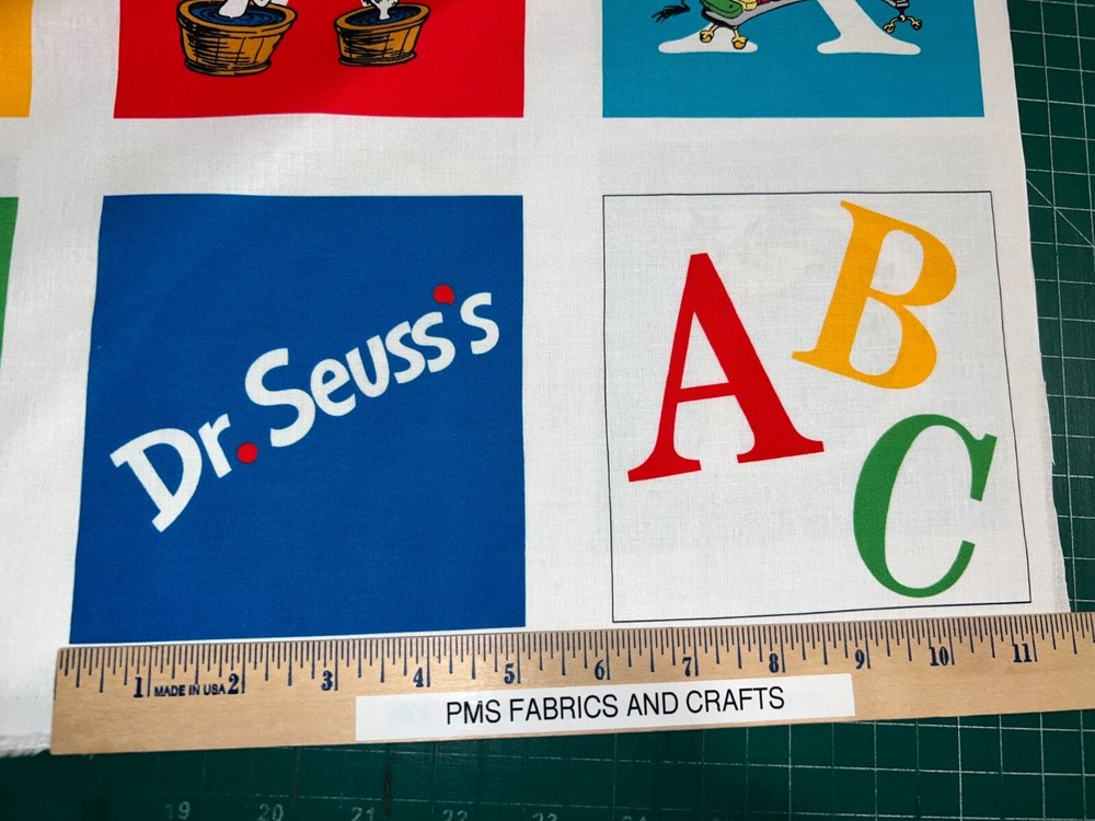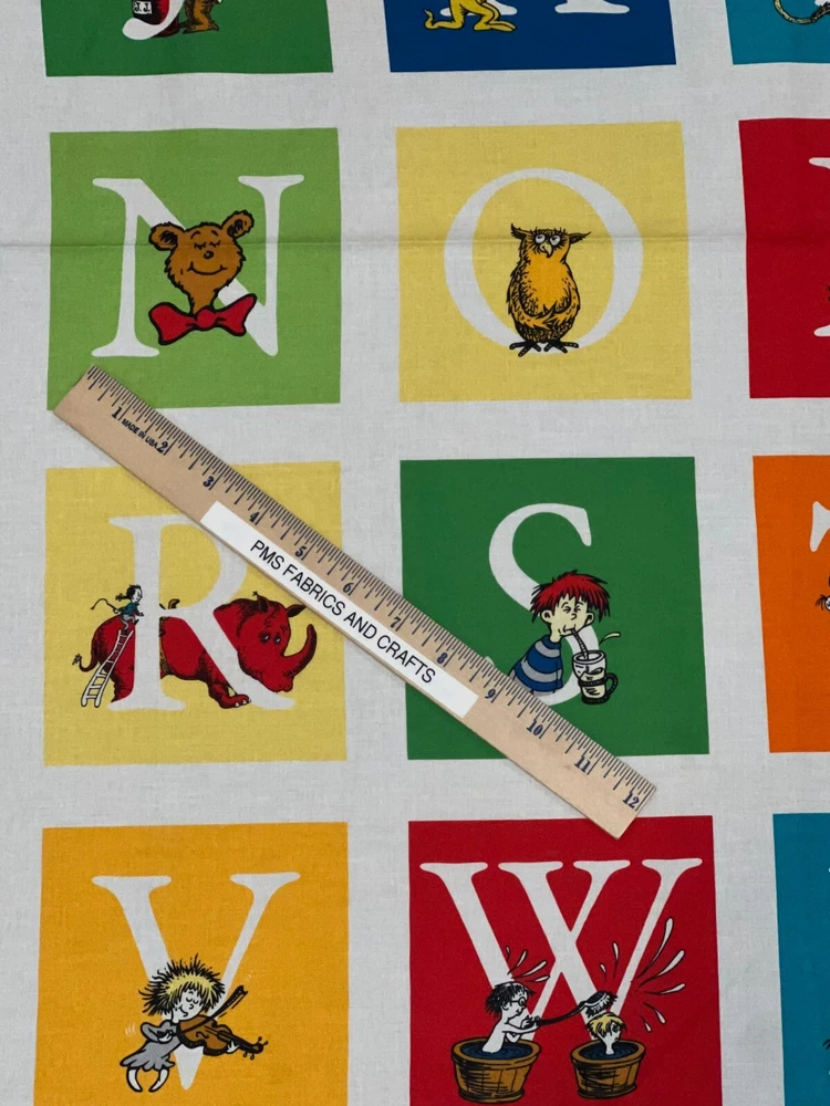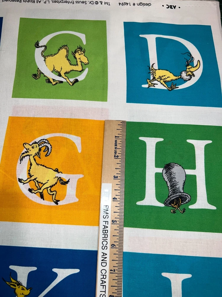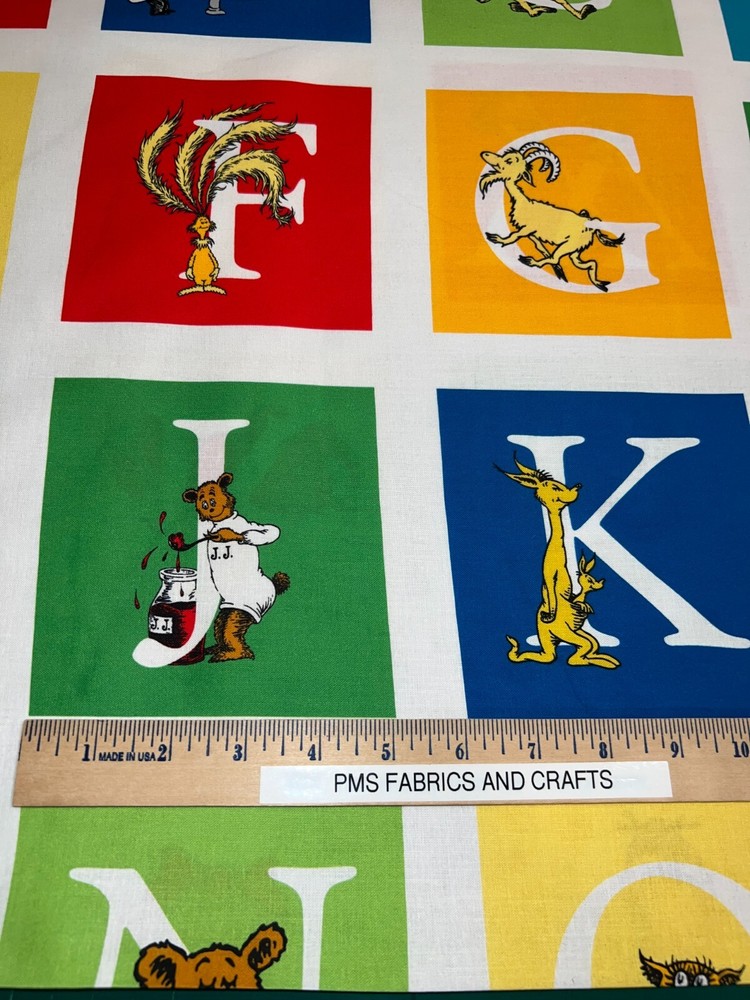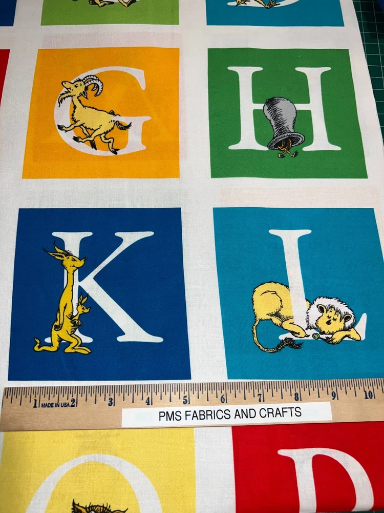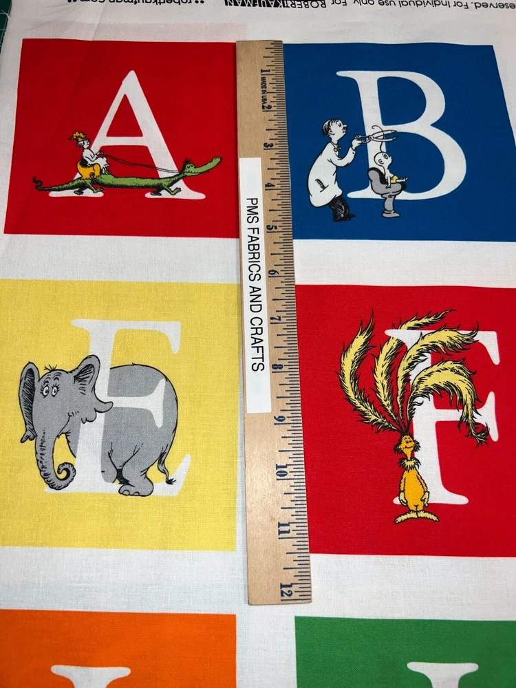 This is a great 100% cotton fabric that we are selling by the Panel and the panel approx 24 x 44 inches. Great fabric panel by Robert Kaufman. FUN Dr Seuss adventure ABC fabric with fun characters & ABC's. Very little extra fabric at the cut edge. Sold by the PANEL that measures approximately 24 inches X 44 inches. There are a couple of pictures with a ruler to help you see the image size of the blocks. These measurements are NOT exact. Each panel has ALL of the ABC's & 2 extra blocks - one shows Dr Seuss and one shows ABC. Each of the blocks are approximately 5" x 5" but again this is approximately! Easy to use the full panel as a fast quilt or cut the blocks and use in I Spy or other quilts - also great for mug rugs! This is a fabric panel - this is not a toy or book or ready made items. UNCUT UNTIL YOU ORDER so when ordering more than 1, you should get 1 section of fabric. Really cute & fun! Great colors of red, blue, green & more. NOTE that some computers or mobile devices may NOT show accurate colors. Shipping to 1 USA / Military address When wanting to purchase 4 or more items (same item or can be a mixture of items from our store), please request a special listing! Just message me the item numbers that you want, the qty of each, your mailing zip code & then I can create you a special listing here on ebay with the correct shipping rate! This will save you money on shipping! As per Ebay customer support, Ebay programming will not allow a customer to request the invoice total since we offer discounts on our items, so in order to get the best rate shipping we must create a special item here on Ebay after you send us the item numbers, qty of each, & your mailing zip code. Once payment is received & clears Ebay & please make sure that the USA mailing address is correct on the payment, we will ship US Postal Service or for larger orders, we also use UPS for the best rate shipping. NOTE that the shipping is only good for the initial mailing. If the address is incorrect on your payment & the package is returned to us, you will be charged shipping again so that we can remail - this is why it is IMPORTANT that you make sure that your shipping address is correct on your payment! If your order had free shipping, then you will be charged a 2nd shipping fee as well - again this is why it is important to review your payment BEFORE you complete it. NOTE that the date on EBay is an ESTIMATED delivery date AFTER the payment clears Ebay. This is ONLY an estimate so please do not expect the package to arrive exactly on this date since once we mail the package we cannot control the time that it takes for USPS to deliver the package. Please be FAIR on your feedback since once we mail the package (you will get a tracking number & a message notice showing we mailed the package & the date) we cannot control the actual delivery date. Return policy - In order to comply with Ebay power seller guidelines, we are forced to accept returns for Ebay BUT please understand that any item that has been washed, cut or around smoke, vapor or pets will not get a full refund once the return is received at our location. This is due to the fact that we sell new - unwashed - smoke free - pet free items & once it is altered, washed or around smoke or pets, it is no longer sellable. Shipping for the original package is non-refundable - if your item had free shipping, the actual cost of shipping your order will be deducted from any refund. NOTE that any return on special listings or custom orders will be charged a 10% return fee! Please note that we include a packing slip with EVERY order that includes the order details like item, qty, our Ebay shop name and contact information. This helps prevent lost packages by the carrier in case where the label is removed from the outside of the package. Thanks for shopping pmscrafts74 – we appreciate your business & look forward to hearing from you!