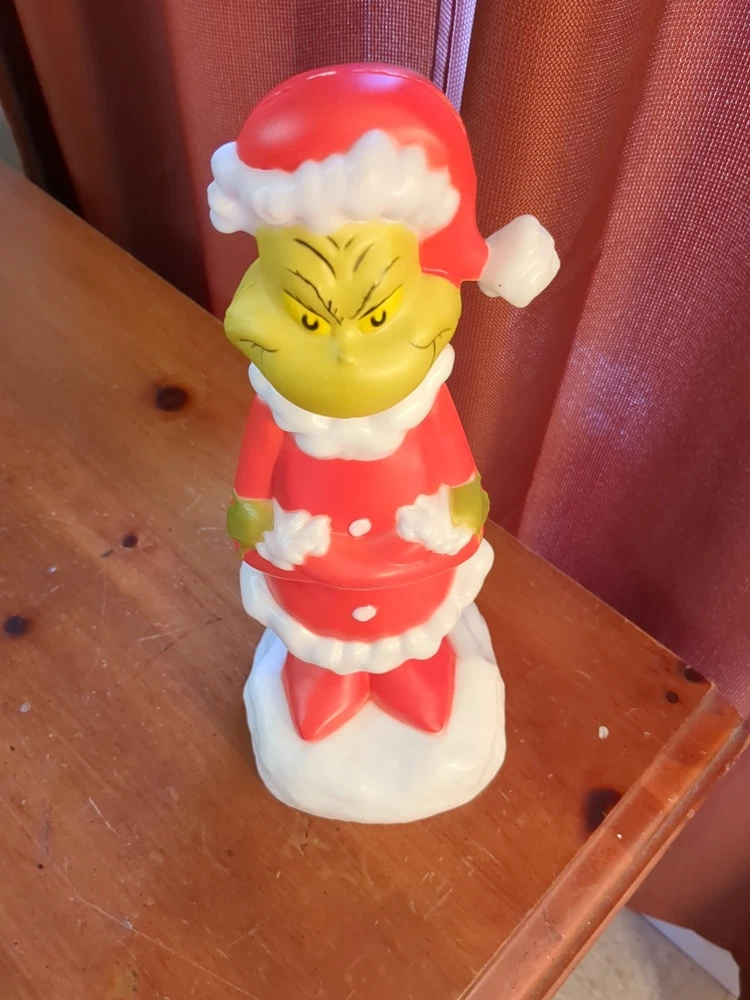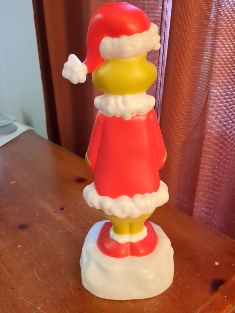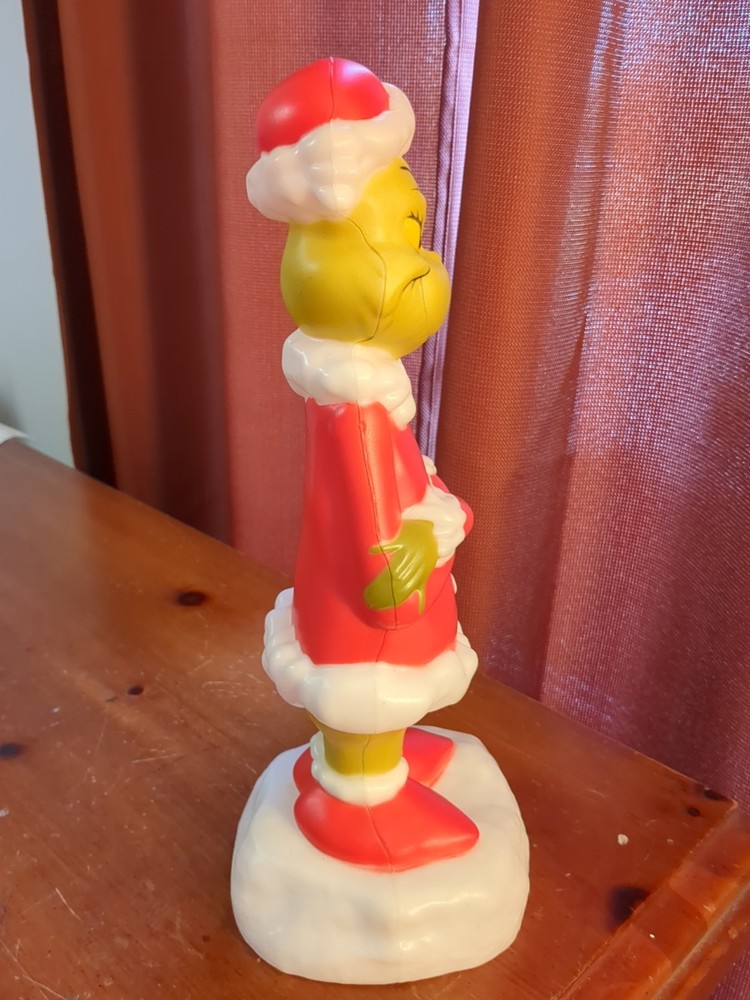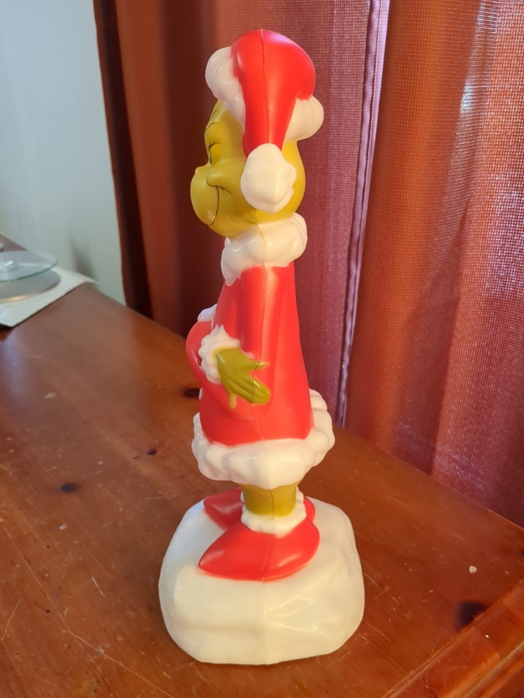 TESTED AND WORKING 14 INCHES TALL SHIPPED WITH CARE The product is a new Dr. Seuss Grinch Who Stole Christmas light-up blow mold tabletop decor measuring 14 inches. This collectible item features the iconic character of the Grinch from the Dr. Seuss franchise, with a green pattern suitable for the Christmas occasion. Designed for indoor use, this blow mold tabletop decor adds a festive touch to any holiday or seasonal decor setup. Perfect for fans of Dr. Seuss and the classic tale of "How the Grinch Stole Christmas."