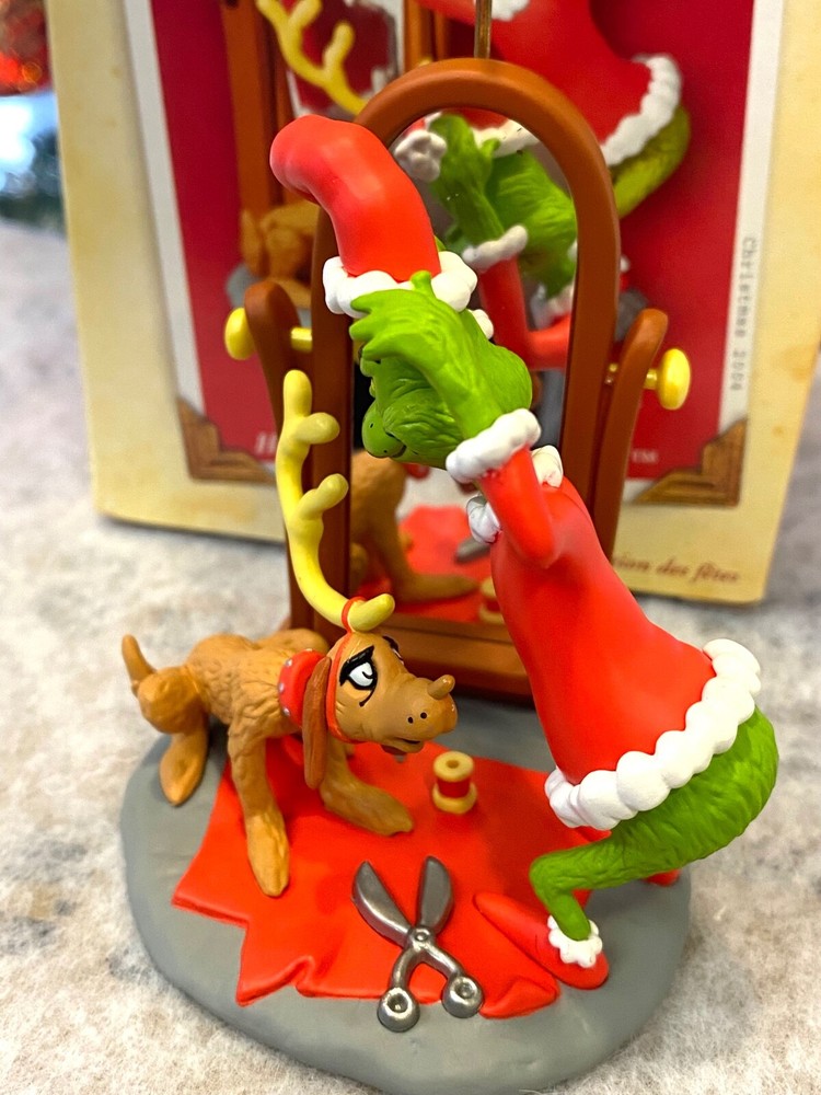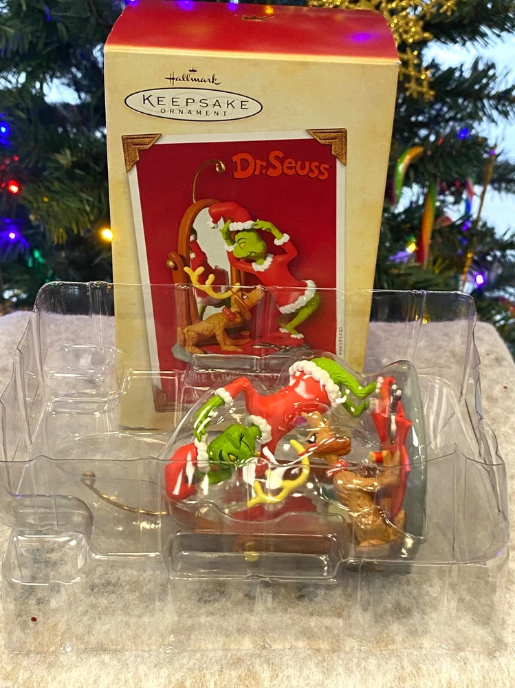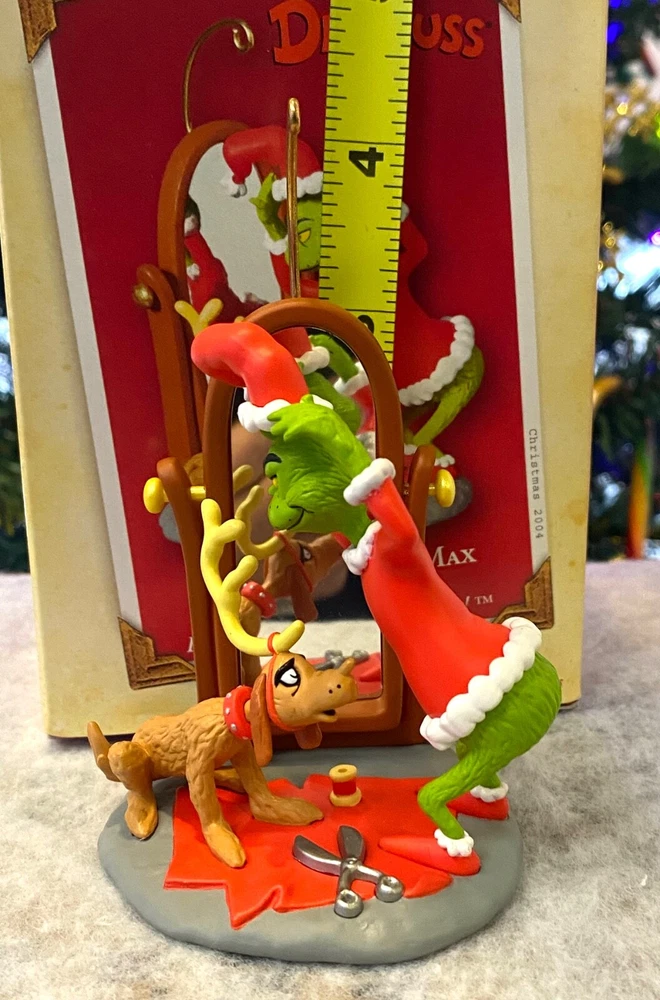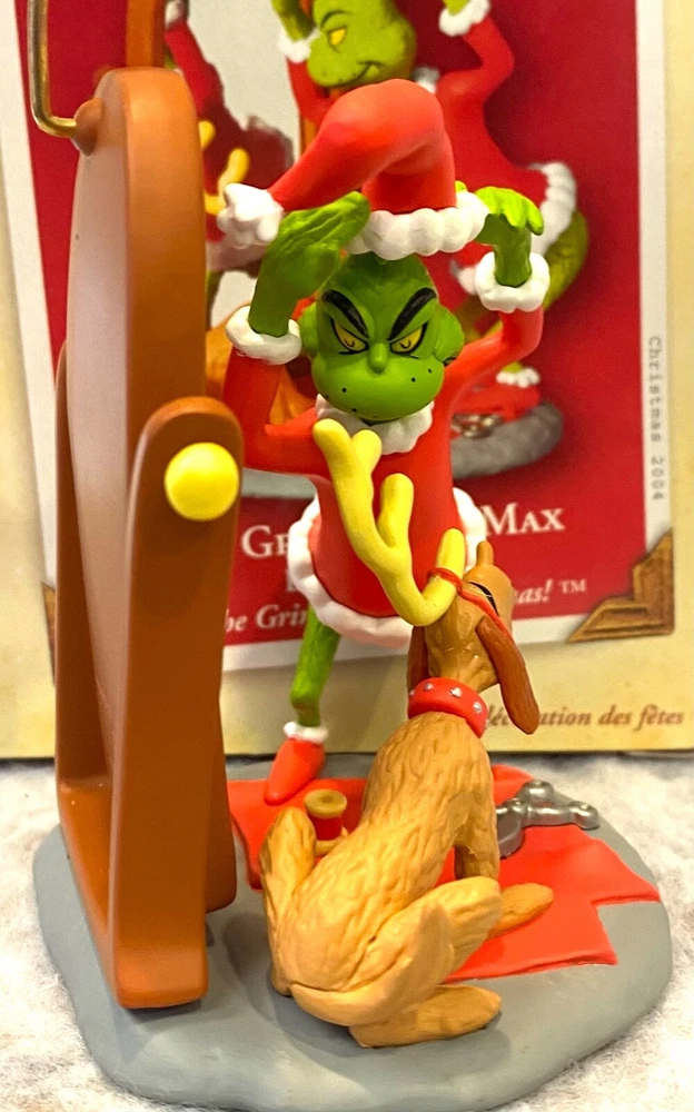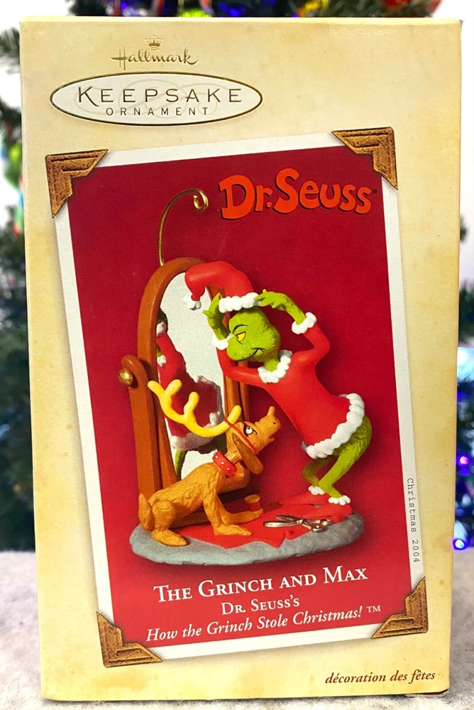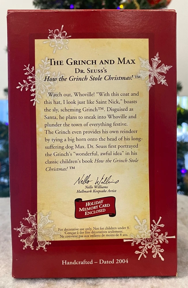 Celebrate the festive spirit with the Hallmark Keepsake "The Grinch and Max" Christmas ornament, inspired by the beloved Dr. Seuss classic file, How the Grinch Stole Christmas. Crafted from durable plastic resin, this medium-sized, red and green adorned piece brings the whimsy of Whoville to your holiday decor. Featuring the iconic Grinch and his loyal companion Max, this ornament is a charming addition to any Christmas collection. Designed to delight, this artistically crafted hanging decoration stands 4 inches tall and is styled to capture the essence of the cherished story. Whether it's the centerpiece of your tree or a fun accent on a holiday display, this Grinch ornament, made in China, is sure to spark joy and holiday cheer in everyone who sees it. As this ornament is used, it may contain minor imperfections, please check the photos carefully. Please see video.