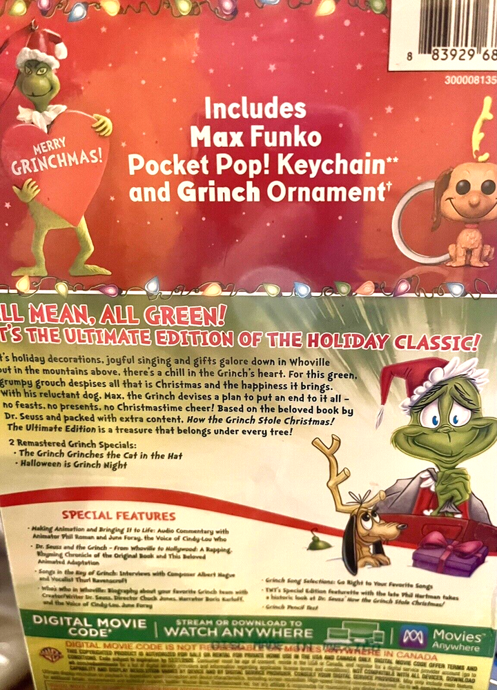 CP Clearance Dr. Seuss How the Grinch Stole Christmas Holiday Gift Set DVD -The Ultimate Edition Includes: Max Funko Pocket Pop! Keychain Grinch Ornament DVD New in box