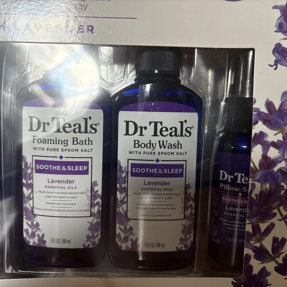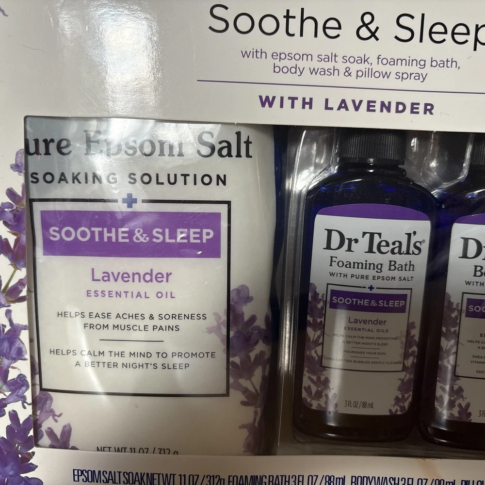 Size:RegularSuggested Age:13 Years and UpIngredients:SaltProduct Warning:Keep out of reach of childrengtin13:810106610528Color:PurpleProduct Line:BODY LOTIONFormulation:FoamMPN:Not AppliedScent:LavenderBeauty Purpose:Moisturizing, Smoothing, Basic CleansingSet Includes:LotionNumber of Pieces:4Shape:NABrand:Dr. Teal'sOrigin:ImportedDepartment:UnisexPattern:NOT APPLIEDFeatures:Alcohol-FreeUPC:810106610528Type:Bath Accessories SetIncludes:Bubble Bath, Body Wash, Bath Salts