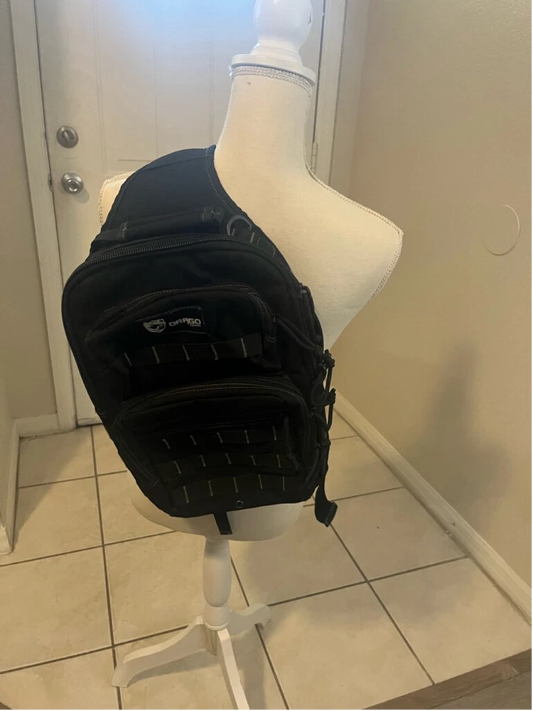 Drago Gear Sling Bag Backpack Tactical Bag for Gear 17” Laptop Bag Sling strap configuration with breathable padding and a quick release buckle. Comfortably fits up to 17 inch laptop computer. Internal 4-channel elastic organizer. ID card window. Water bladder compatible. Y-compression strap. Concealed-carry compartment.