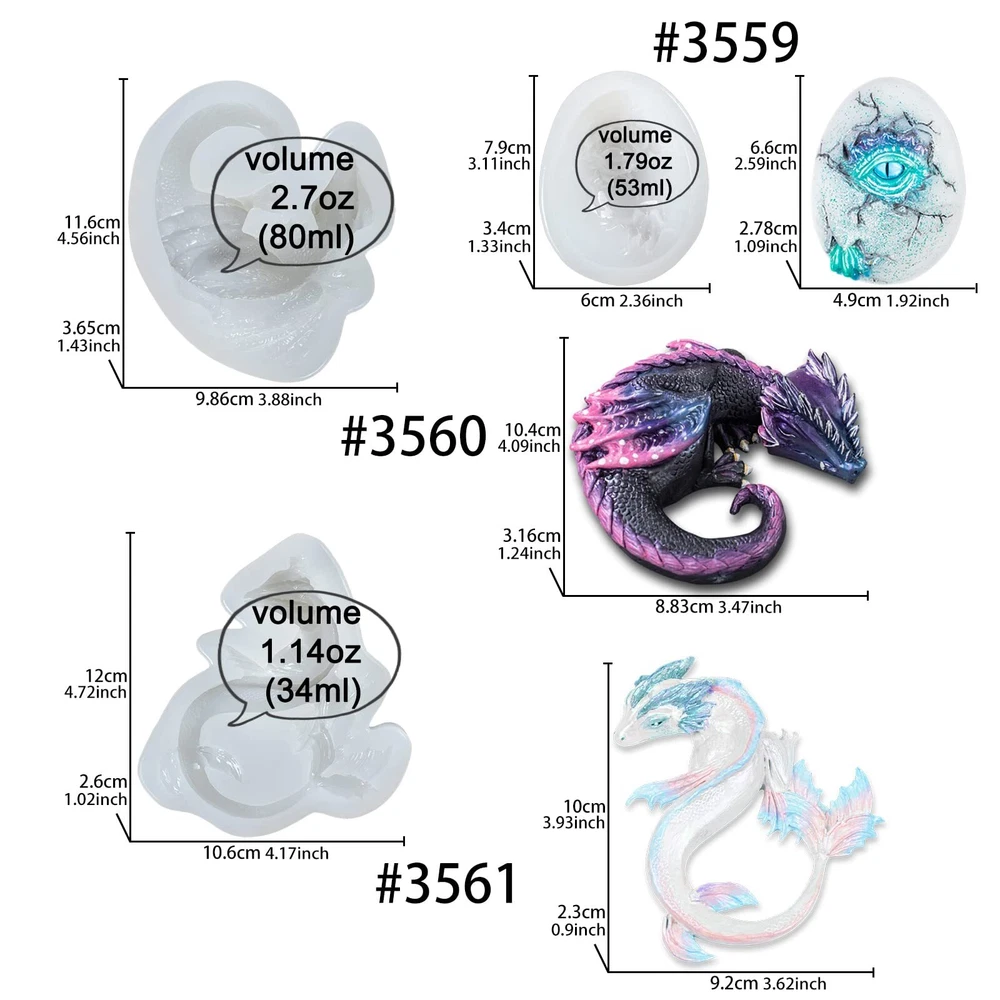 Dimension approximate: Fire dragon_4.1x3.48x1.2inch Sea dragon_4x3.6x1inch Dragon's egg_2.6x2x1.1inch Mold color: clear Finish: gloss (may require polish/glaze if need a shiniest/most glossy look) Suffer temperature: -40 to 230 centigrade/ -40 to 446 fahrenheit Can be used with dishwasher/oven/refrigerator Food , no BPA/PVC/phthalate Wash and boil before use, especially for food More Tips to use with Epoxy Resin: 1) Poured in silicone molds in layers, allowing air bubbles completely escape; 2) To expedite the process of escaping of bubbles and time of solidification of resin, the mold can be a bit warmed up, for example, heat the oven to 80°C, turn off, ventilate it a little and put mold, filled with resin in the oven. 3) resin instruction for the time need to , measure and mix resin properly. It does not mean it has been cured if it is hard. 4) Do not use water-base ink for resin casting. 5) After baking clay / resin in complex or deep molds release the finished product under running water with soap. 6) Put in refrigerator a while/ soak in hot water a while/ release with baby oil if it is hard to release. Fire dragon asleep, sea serpent, hatchling baby dragon in egg with watching out eye resin casting molds. Resin sleeping dragon molds with detailed and unique design. Create 3D dragon art figurines for collection, home decoration, fairy garden etc. Ideal gift for resin artists or dragon lovers. Make mythical resin artwork, polymer clay or concrete dragons, animal totem figurine, embellishment for coaster or jewelry box, ornament, soap or lotion project, candle, dragon giant cupcake topper, cake decorating and more. For food use: candy melt, fondant, chocolate, ice, gumpaste, sugarpaste, marzipan, jelly, isomalt etc. For crafts: modelling clay(pottery, air dry clay, paper clay, resin clay, polyclay, salt clay, metal clay, liquid clay, wood clay, foam clay etc.), resin(epoxy resin, rethane resin, uv resin), concrete, , plaster, hot glue, soap, candle, wax, cold porcelain, playdough, mix media and more. For most occassions, such as wedding, birthday, baby shower, autumn or floral theme party cake decoration, cookie embellishment, tiny winter wreath craft, DIY halloween party favor. Durable and reusable soft mold. Transparent that you can check the buttom when process project. Easy to demold, gloss finish. Food . Food and Non Food material should use separately. Wash and boil before use, especially for food. Easy to use mold very flexible and easy to clean, can be used in oven, dishwasher, refrigerator etc. Can be used within the temperature between -40~220 centigrade / -40~428 fahrenheit