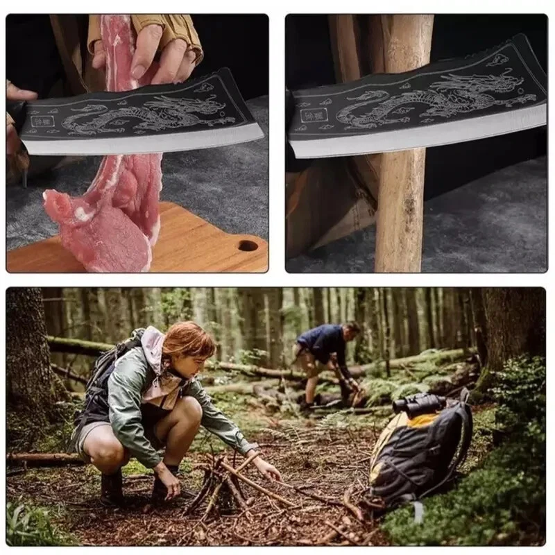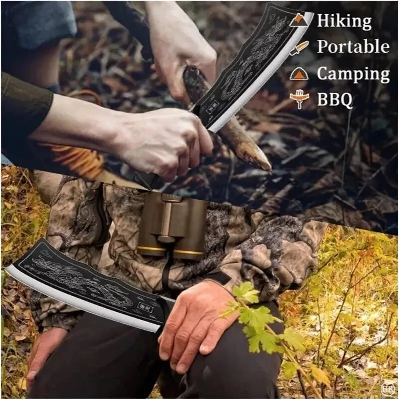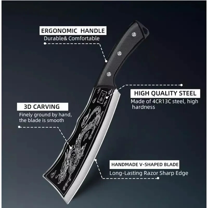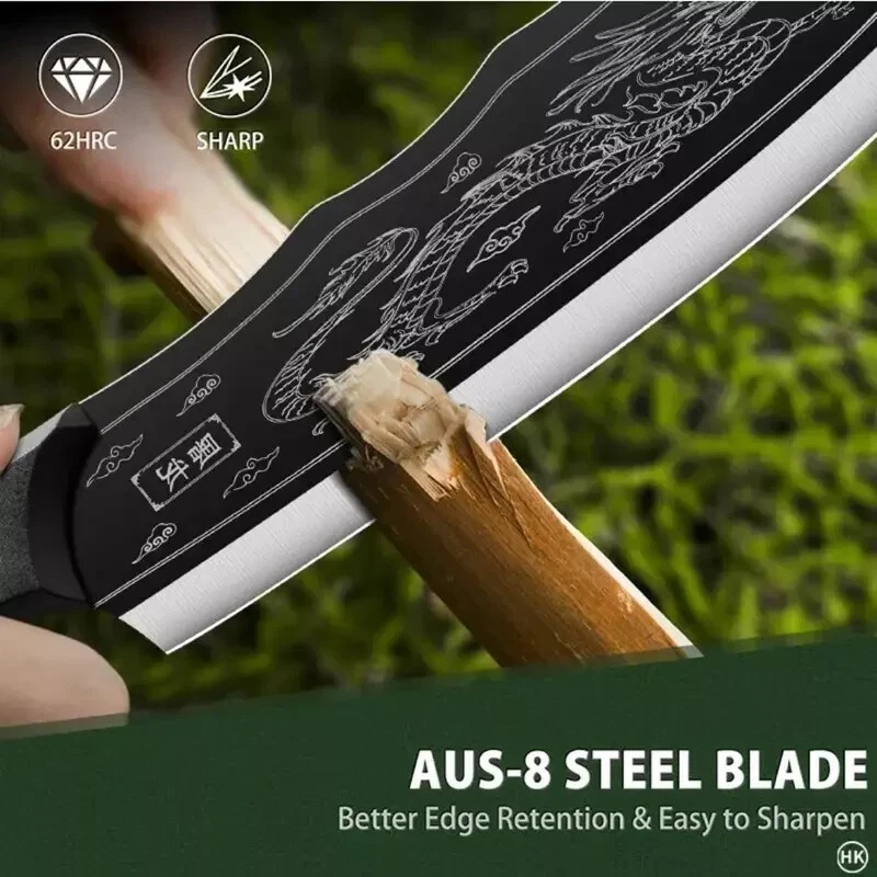 Upgrade your cutting tools with this 8-Inch Full Tang Kukri Knife , expertly designed for professional chefs, outdoor enthusiasts, and collectors alike. Featuring a stunning engraved dragon pattern and hand-forged craftsmanship, this knife excels in both performance and aesthetics. Key Features: πͺ Razor-Sharp Handmade Blade Forged from high-quality AUS-8 and 4CR13C steel with 62HRC hardness for exceptional edge retention and effortless sharpening. π Unique 3D Dragon Carving Finely hand-engraved blade surface delivers an elegant touch while maintaining a smooth texture. π Ergonomic Full Tang Handle Triple-riveted design ensures superior grip, balance, and long-lasting durability for heavy-duty chopping. π Multipurpose Use Perfect for chopping vegetables, cutting through bone, or outdoor tasks like camping, BBQ, and hiking. π§³ Protective Leather Sheath Included Stylish and secure storage for safe carrying and convenient access wherever you go. Specifications: Blade Length: 8 inches Thickness: 2.5 mm Weight: 346 g Material: AUS-8 Steel / 4CR13C Steel Hardness: 62HRC Handle: Full Tang Ergonomic Design Ideal For: Chefs, hunters, hikers, BBQ lovers, and collectors seeking a high-quality, multi-functional blade with cultural flair.