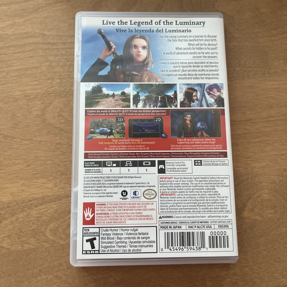 Item Height:0.5 inNumber of Discs:1Game Name:Dragon Quest Xi: Echoes of an Elusive AgePlatform:Nintendo SwitchRelease Year:2019Rating:T-Teengtin13:0045496594381California Prop 65 Warning:Cancer and Reproductive HarmFeatures:Complete EditionItem Length:7 inGenre:Action & Adventure, Role PlayingItem Weight:0.115 lbPublisher:Nintendo GamesUPC:0045496594381Video Game Series:Dragon QuestCountry/Region of Manufacture:United StatesItem Width:4.5 in