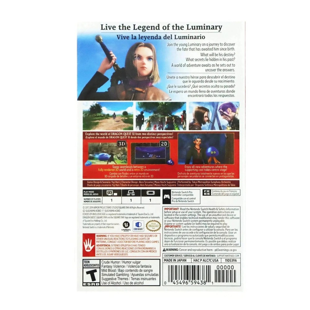 Dragon Quest XI S: Echoes of an Elusive Age (Definitive Edition) - Nintendo Switch Condition: New In Dragon Quest XI S: Echoes of an Elusive Age (Definitive Edition) for Nintendo Switch, step into the shoes of the Luminary, the hero destined to protect the realm from impending doom. Alongside a diverse group of adventurers, engage in well-balanced, turn-based battles and embark on epic quests throughout the kingdom of Erdrea. Customize gear, hone party members' skills, and change their outfits without altering their equipment in this definitive version of the game. This edition of Dragon Quest XI S offers a plethora of new features, including the ability to ride and battle alongside monsters to earn experience points on the field. Immerse yourself further by toggling between HD or 16-bit visuals, symphonic or synth music, and English or Japanese audio. Delve deeper into the story with new character-focused narratives and journey to past Dragon Quest worlds, experiencing classic areas reimagined in retro 2D style. Encounter enigmatic Tockles across the land, granting access to 16-bit versions of beloved locales from previous Dragon Quest titles like IV and VIII. With character designs by renowned artist Akira Toriyama and voiced dialogue bringing personalities to life, immerse yourself fully in the quest to unveil the Luminary's true heritage and awaken your latent power. Whether you seek a greater challenge with the Draconian Quest setting or wish to capture memorable moments with Photo Mode, Dragon Quest XI S offers an unforgettable RPG experience for players old and new. Browse what else we have in stock - thousands of toys, games, and other fun merchandise from Poggers, the best toy store in the world!
