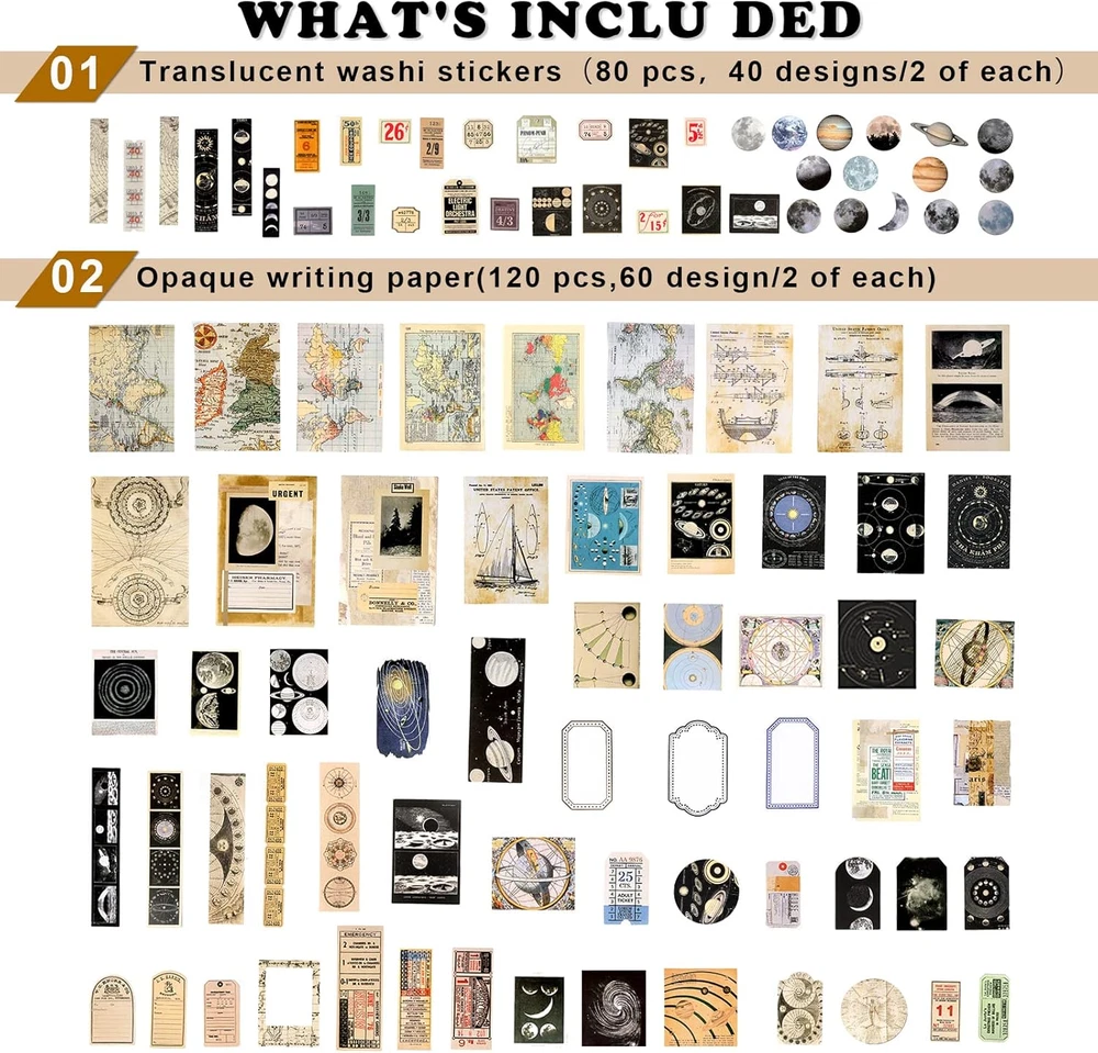 Store New Arrivals Add to Favorite View Feedback Contact Draupnir 200Pcs Vintage Junk Journal Supplies,Scrapbook Supplies Scrapbooking Paper and Stickers Ephemera for Art Aesthetic Journaling Kit Collage(Celestial) Description Item model number 00022-Astrology Sheet Size Half Letter Sheet Count 200 Color Celestial Product Dimensions 6.7"L x 4.7"W Material Paper Style Astrology Item Weight 2.11 ounces Shape Rectangular Paper Finish Matte Recommended Uses For Product Crafts, Scrapbook Brand Draupnir Manufacturer Draupnir Value Pack:200pcs of vintage assorted paper & sticker ephemera kit, including 120 pcs scrapbook papers(6.7×4.7inch, 60 patterns, 2 of each) and 80 pcs patterns washi stickers(40 patterns, 2 of each). A collection of vintage style celestial theme junk journal good stuffs! Celestial Theme Junk Journal Supplies:This 200pcs paper & washi stricker kit with a variety of celestial and astrology designs.Such as: Various planet stickers, space, moon phase, planet map, world map, astronomy, astrology map, ticket, receipt, etc. Very suitable for celestial themed junk journals, collages, scrapbooking, art projects! High-Quality Paper & Washi Sticker:Thanks to Draupnir's superb printing technology, everything on the paper is exceptionally clear, and the colors are very rich.We use High-Quality washi, so the washi sticker durability, easy to tear and perfect for collaging.Also, handwriting friendly and printer friendly. Multi Use: These aesthetic washi stickers and papers are for both quality and beauty. They are perfect ornaments to personalize your scrapbook, craft, bullet junk journal, notebook, album, gift package, card making, certificates, invitations, poetry scrolls, letters, maps, medieval-looking documents, envelops.Beautiful and impressive ephemera stickers will give more fun to your life. Design For Junk Journal Lover:An junk journal supplies pack for junk journal lover and a great gift for friends, classmates, daughter. 24-Hour Service: If you have any questions, or encounter any problems, please contact us! Draupnir will answer your questions within 24 hours and give you the best solution! Product Description Draupnir 200Pcs Vintage Scrapbooking Supplies There are approximately 200 pieces of assorted non-adhesive paper & translucent washi stickers with a variety of artistic designs. Perfect for junk journals, scrapbooking,wall decor,DIY gift, collages,art journaling, traveller's notebooks, diaries, cards, tags, bookmarks, penpal letters, mixed media art or art projects that call for artistic feel! The package includes: -Assorted decorating paper,80 pieces -Translucent washi stickers, 120 pieces A mixed 200Pcs paper & sticker pack with mixed sizes and designs. They have a very strong vintage artistic atmosphere, you can use them in the decoration of daily life. ABOUT US We offer the best prices around on high quality products. Our E-store includes media such as books, movies, music and games while offering electronics, toys, sporting apparel, clothing, tools, general home, garden items and more. SHIPPING We are always working hard to ensure your package arrives as soon as possible. Please understand that some factors like weather, high postal traffic, and the performance of shipping companies are outside of our control. We offer free shipping to the lower 48 states and ship within 2 business days of payment, usually sooner. We do not accept P.O. Boxes. Please provide a physical address. RETURNS We offer a 30-Day Return Policy on items which you are not completely satisfied with. You have the option for a full-refund or an exchange of the item. No returns are available on items shipped outside of the USA. PAYMENT We accept PayPal. CONTACT US This page content is yet to come Please ad us to your favorite seller and visit again later Thank You CUSTOMER SATISFACTION We try our very best to make sure every customer is completely satisfied. If there's a problem, message us! We're happy to help.