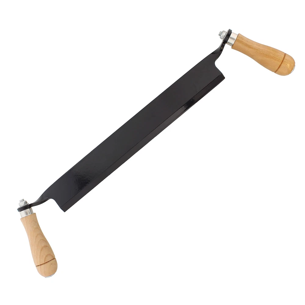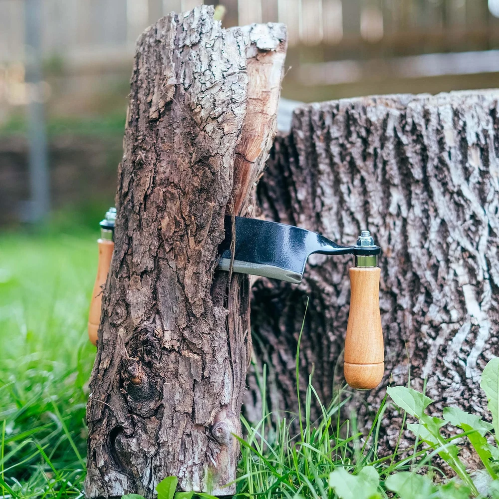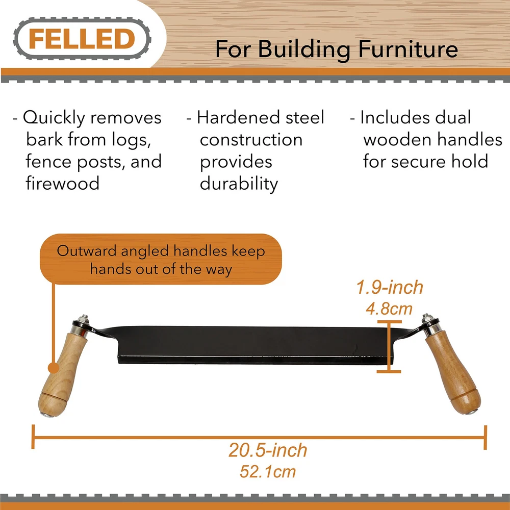 Use the | 13 Inch Straight Drawing Knife for Woodworking Tree Bark Removal Tool to remove bark quickly from logs and fence posts or to shape surfaces to create legs, seats, bowls, and more. These debarking knife draw shaves are designed for maximum strength and longevity. Dual wooden handles allow you to maintain a comfortable, secure hold for better control and accuracy, while the sharp steel blade features a refined beveled edge that easily slices through the wood. This lightweight pull knife woodworking draw shave tool is often used by timber framers, wood turners and carvers, and furniture fabricators for their dependability and maneuverability. Warning: This product can expose you to chemicals which is [are] known to the State of California to cause cancer and birth defects or other reproductive harm. WOOD WORKING TOOLS FOR BUILDING FURNITURE: Rapidly remove wood and bark from logs, fence posts, and firewood with the | 13 Inch Straight Wood Shaving Knife Draw Shave Wood Debarking Tool; Often used by timber framers, wood turners and carvers, and furniture fabricators these log draw knife woodworking hand tools quickly remove excess materials to shape surfaces to create spindles, pegs, seats, bowls, and much more KEEN BEVELED BLADE: Constructed of hardened steel provides this straight edge tree bark scraper tool with durability and longevity; Finely polished beveled edges can easily be honed to keep your bark stripper wood shaver tool sharp for accuracy and ease of use; Drawknife woodworking tool set includes rubber edge protector to protect you and the draw knife blade when traveling WOOD HANDLES FOR COMFORT AND CONTROL: This draw knife woodworking tool is built for strength, comfort, and longevity; Dual wooden handles provide a secure hold on these draw knife debarking tools to allow optimal control, maneuverability, and accuracy; Handles are angled outwards to keep your hands out of the way while pulling on larger logs and wood slabs EASY TO USE: Simply set your wood stock in a clamp to keep it from moving while you work; From the center of your workpiece, begin digging the draw blade for wood working towards yourself with control; Be sure to face the beveled side upwards to peel or “draw” the shavings from the workpiece; Continue shaping until satisfied; Work slowly and wear protective gear PERFECT SIZE FOR YOUR NEEDS: Draw knife tool features 13-inch (33cm) blade length; Straight edge blade has 1.9-inch (4.8cm) height and a .3 inch (.8cm) thickness; Wood straight draw knives are ideal for removing bark and for shaping arches or flat surfaces; Overall length is 20.5 inches (52.1cm) from handle to handle