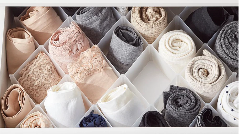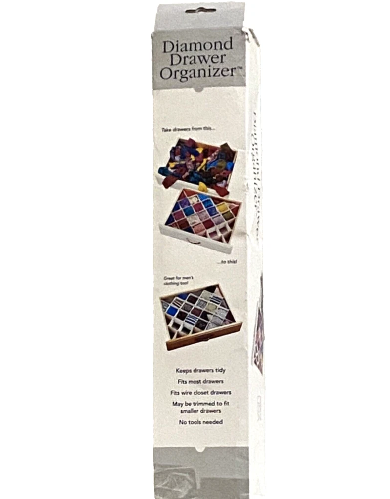Diamond Drawer Organizer Keep drawers Tidy Fits most drawers Fits wire closet drawers May be trimmed to fit smaller drawers No tools needed Drawer in photos not included just organizer. These slide together easily. The organizer pieces are very flexible. Less wasted space with this organizer.You can make the grid fit nice and snug. This is a great product ! Made in USA