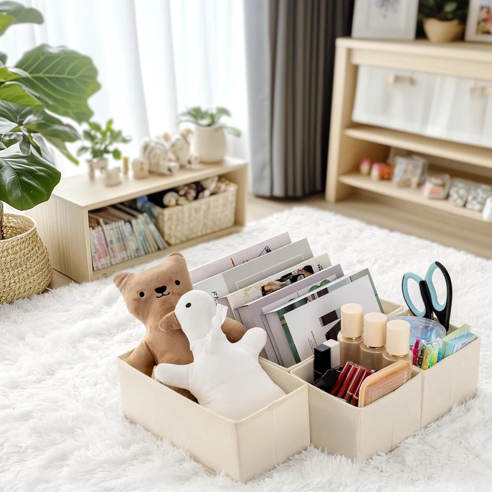 Versatile Storage Solution: Our dresser organizers come in 3 different sizes to keep your space organized and clutter-free, optimizing your daily storage needs. The set includes 6 large (11"x11"x4.5"), 9 medium(11"x5.5"x4.5"), and 6 small (5.5"x5.5"x4.5") Durable Design: Crafted from sturdy non-woven fabric, these dresser drawer organizers feature high-quality stitching for enhanced durability. Reinforced with heavy plastic boards on the sides and bottom, these bins maintain their shape over time. They are also odorless, making them ideal for storing baby clothes Multi-Use: Transform any space in your home with our drawer organizers! Perfect for bedrooms, living rooms, offices, and kids' rooms, they maximize storage potential. Whether for clothes, books, or toys, these organizers make it easy to declutter, keeping every room neat and orderly Simple Setup: The drawer organizers just open and insert the bottom for use, no tools required. When not in use, simply draw out the bottom and fold flat. Ideal for temporary storage during travel Save Time Searching: Offering the ultimate shelving solution for everyone—adults, kids, and babies! Keep your space tidy and allowing for easy access without rummaging through clutter Product description Criusia 21 pack drawer organizers to meet your daily clothes storage need! EVERYTHING IS PERFECTLY ORGANIZED Feeling overwhelmed by clutter at home? Criusia drawer organizers are here to help. This 21-piece set is versatile and perfect for various spaces, bringing order and tidiness to your home. 1 For Nursery 2 For Clothes 3 For Office supplies 4 For Cosmetic ENJOY ORGANIZING TIME WITH YOUR FAMILY GREAT WORKMANSHIP FOR LONG-LASTING USE Removable Bottom Board Simply insert or remove the bottom boards to easily fold or unfold those storage boxes. Tight Stitching Made with precision stitching, the organizer is sturdy and resistant to fraying or deforming, even with long-term use. PP Board Layer The inner layer is made of high-quality PP board, which has better support than cardboard and is odorless. Non-woven Fabric It’s gentle on clothes and other items, easy to clean, and provides a healthier home storage experience. MULTI-SIZE, MULTIUSE! More Product Customer Reviews 4.7 out of 5 stars 200 4.6 out of 5 stars 497 4.7 out of 5 stars 289 4.3 out of 5 stars 596 Price $21.99 $ 21 . 99 $34.19 $ 34 . 19 $19.99 $ 19 . 99 — item count 1 Pack 6 Pack 14 Pack 6 Pack Material Non-woven fabric, PP board Non-woven fabric, PP board Non-woven fabric, PP board Non-woven fabric, PP board Odorless ✔ ✔ ✔ ✔ Sturdy ✔ ✔ ✔ ✔ Odorless ✔ ✔ ✔ ✔