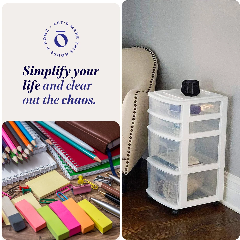 Cart Masterpiece: Perfect the art of hiding your hoard with the storage carts with drawers. This plastic drawer cart is made to fit anywhere you need organizing power, whether at home or work. For Small Spaces: This roomy plastic organizer measures 12.5" L x 14.25" W x 25.5" H. Each large drawer measures 12.31" L x 9.92" W x 6.85" H with the small drawers measuring 12.31" L x 9.92" W x 3" H. It Will Fit: Our rolling drawer organizer cart features clear plastic materials and removable wheels for easy transportation. Use them to toiletries, office supplies, crafts, and more. From Trash to Treasure: Life in plastic is fantastic when the plastic is made from 90% recycled materials. We know the earth is important to you, so our cart is good for your items and the planet. for Your Home: From organization to storage, we have the container that you are looking for. Allow us to make your house a .