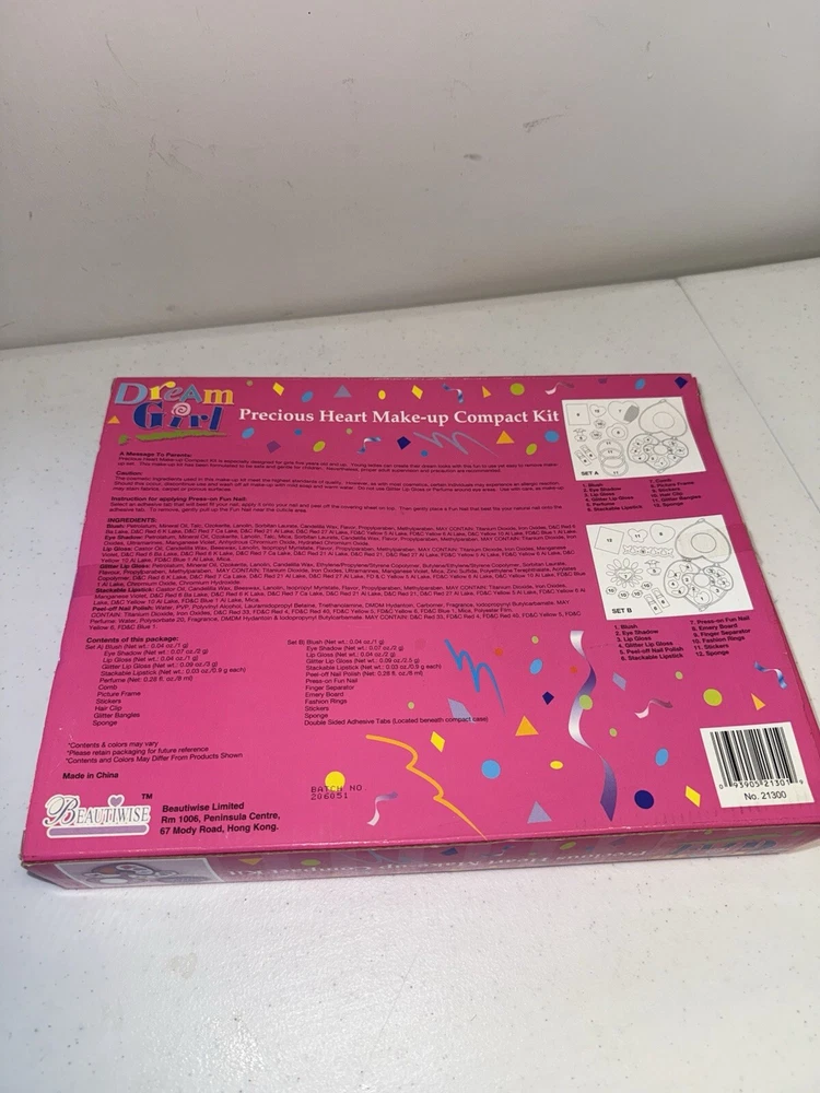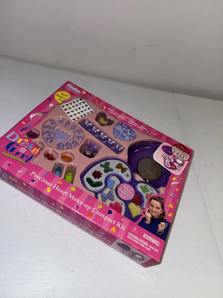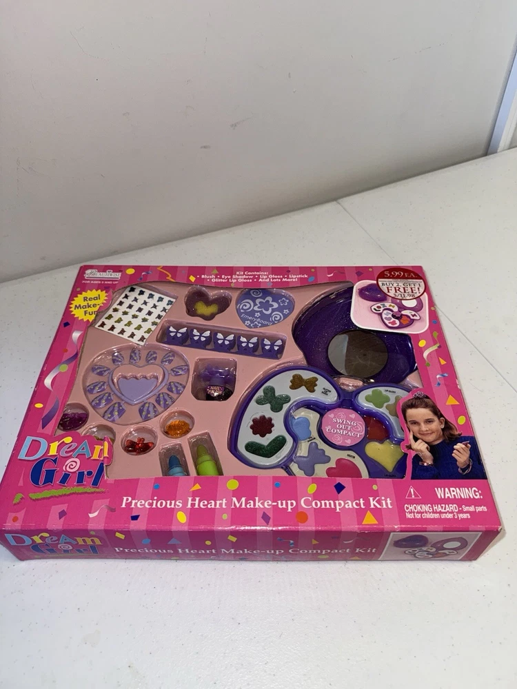 This is a "Dream Girl Precious Heart Make-Up Compact Kit" intended for pretend play and dress-up activities. The kit is recommended for children aged 5 and up and includes various cosmetic items. The brand associated with this product is "Make it Up" and it is manufactured in China. This compact kit allows children to engage in imaginative play and experiment with makeup in a safe and fun way. Perfect for sparking creativity and role-playing scenarios, this kit is a great addition to any child's playtime routine.