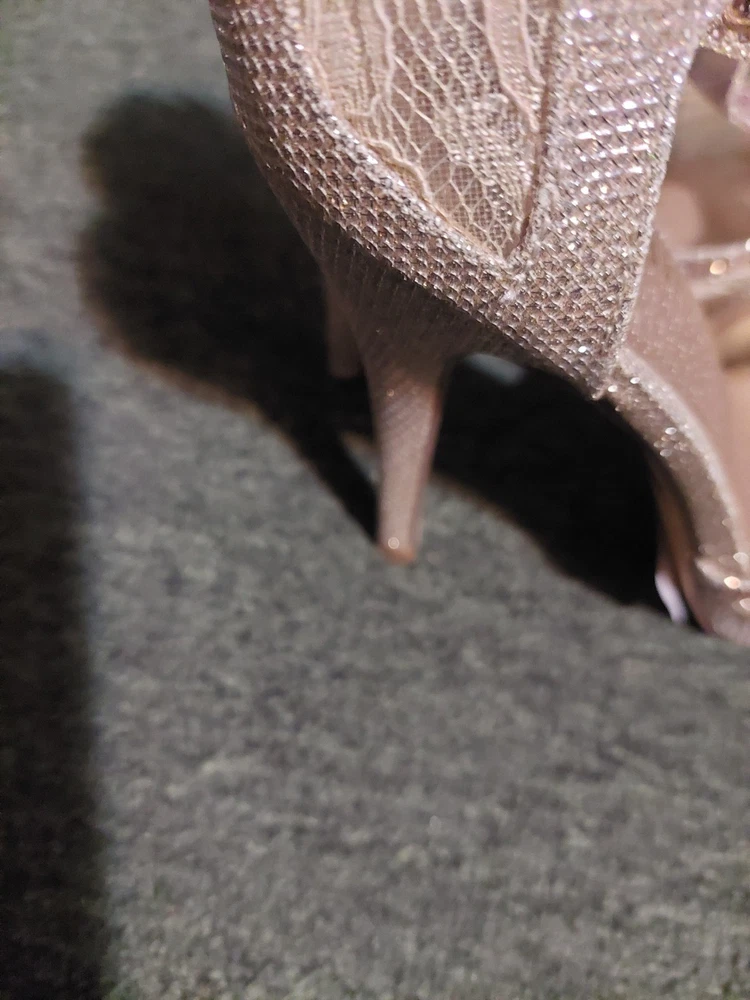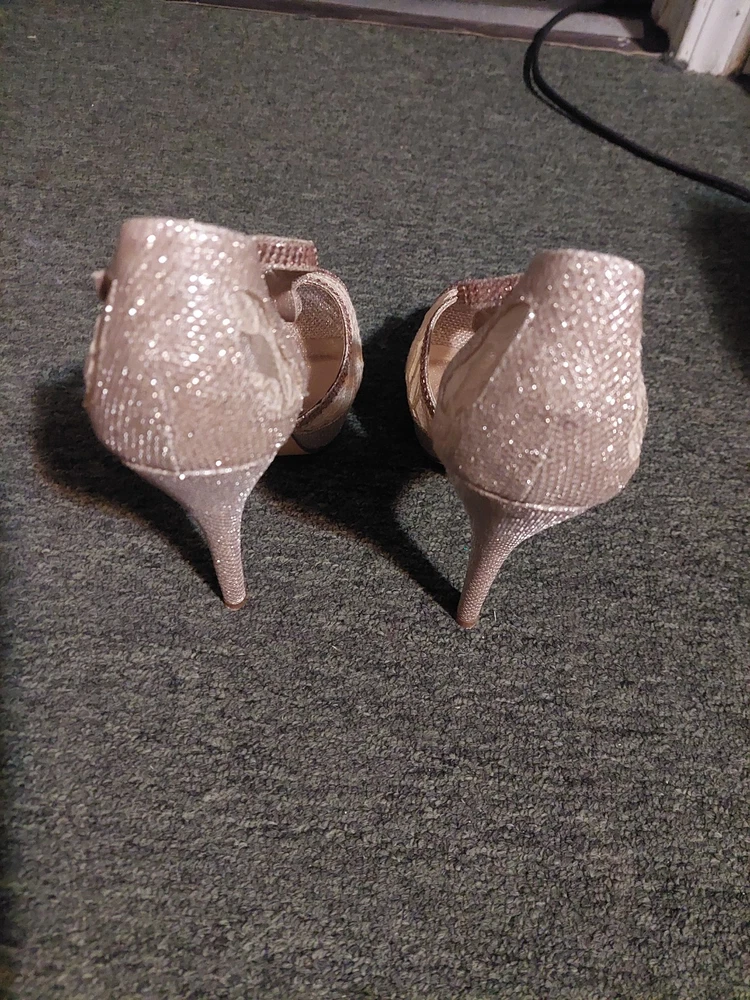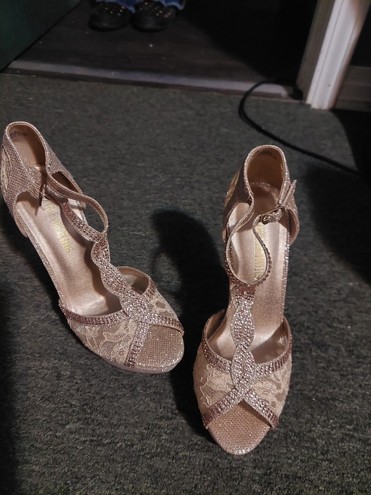These are Dream Pairs women's gold glitter stiletto heels in size 7.5. The peep toe design features a buckle closure and adjustable ankle strap. The ultra-high heel measures over 4 inches, with a platform style for added height. The shoes are accented with glitter and have a cushioned insole for comfort. The upper material is synthetic, and the brand is Dream Pairs.