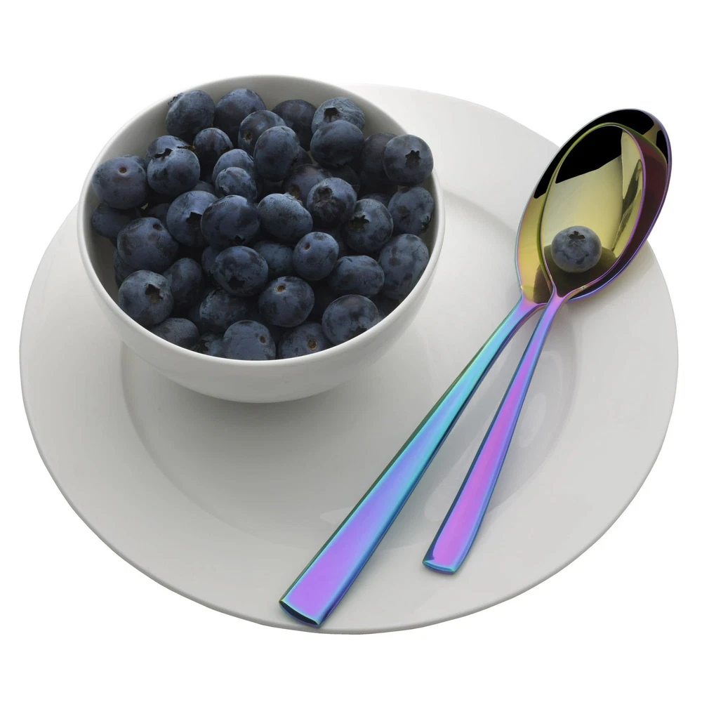 This dream Rainbow 20 piece set includes 4 dinner forks, 4 Dinner Knives, 4 Dinner Spoons, 4 teaspoons, 4 salad forks. Never needs polishing. Lifetime limited . Hand wash recommended. Colorful & Stylish Design: This Dream Rainbow flatware set brings a bold and vibrant touch to your dining experience, featuring a unique rainbow finish that stands out on any table setting. Complete 20-Piece Set: The set includes 4 dinner forks, 4 knives, 4 spoons, 4 teaspoons, and 4 salad forks - ideal for family meals or small gatherings. Durable Stainless Steel: This flatware set retains its beauty even after frequent use, making it a reliable choice for everyday meals or special occasions, and requires no polishing to maintain its shine. Never Needs Polishing: Forget the hassle of constant maintenance. This flatware set is designed to keep its polished look without requiring extra care, saving you time while ensuring your utensils always look brilliant and ready to impress. Hand Wash Recommended: Although made for durability, this rainbow flatware set is recommended to be hand-washed to preserve its beautiful finish and vibrant colors, allowing you to enjoy its stunning look for meal after meal.