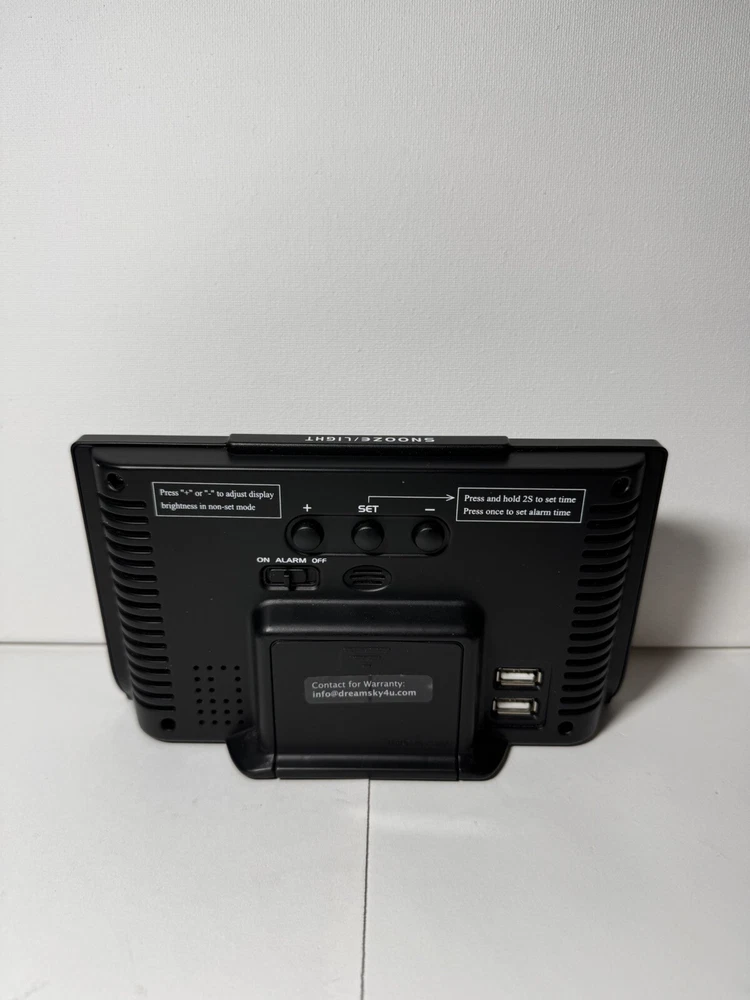 Looking for a reliable and functional alarm clock for your bedroom? Look no further than the DreamSky Alarm Clock! This digital clock features battery backup, so you can rest assured that your alarm will always go off, even in the event of a power outage. The sleek black design is perfect for any bedroom decor, and the easy-to-read digital display ensures that you can see the time from anywhere in the room. Comes as shown in pictures. No batteries included.