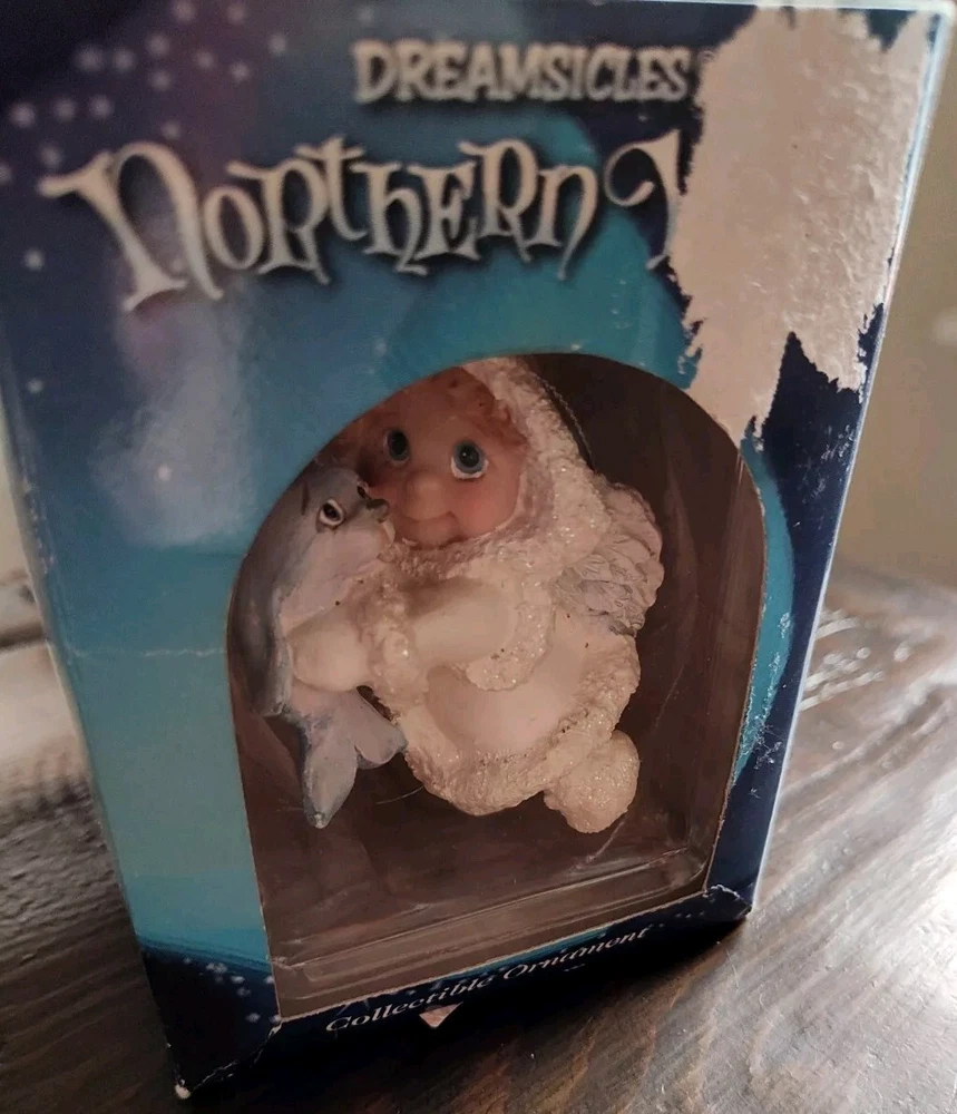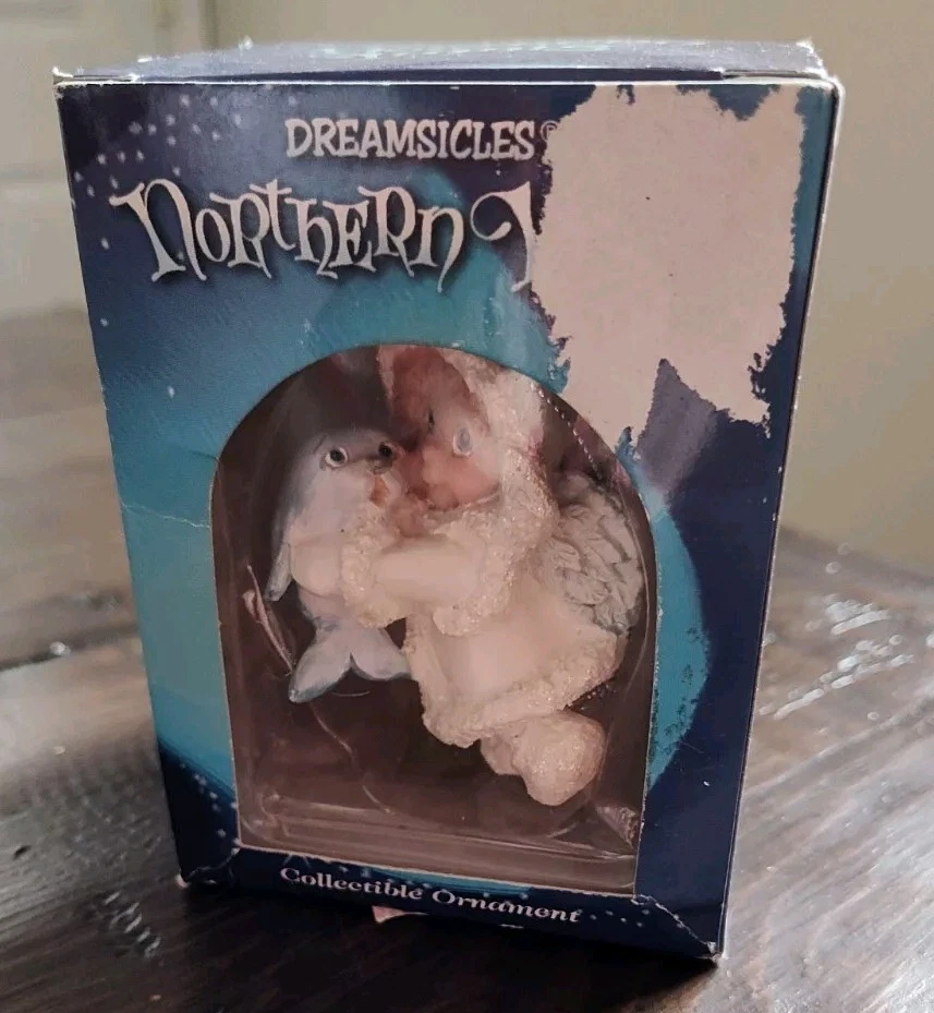 Add a touch of celestial charm to your Christmas decor with the Dreamsicles Northern Lights 1999 Christmas Ornament. Featuring the beloved Angel with a baby dolphin, this ornament captures the essence of the holiday spirit. The ornament is new in its plastic inner sealed case. Please note that the box has a lot of wear. It does not affect the item inside.