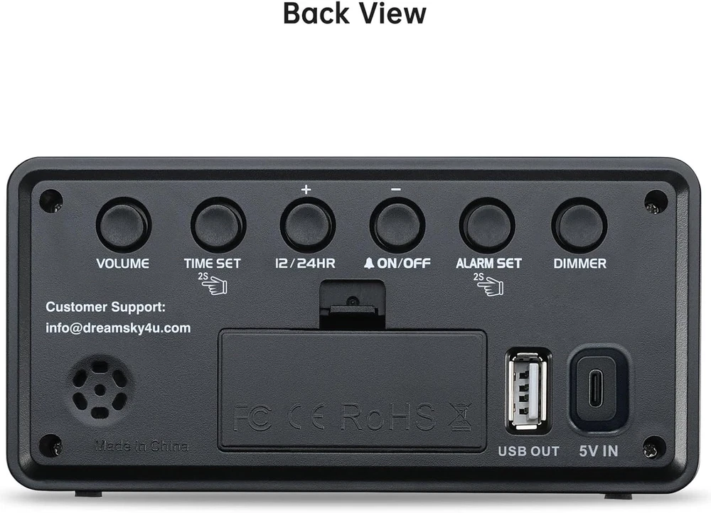 Store New Arrivals Add to Favorite View Feedback Contact Dreamsky Small Digital Alarm Clock for Bederoom, Large Big Numbers Display with Dimmer for Living Room, Electric Bedside Desk Clock with USB Charging Port, Adjustable Volume, USB-C Adapter Powered Description Item model number DS312 Style Digital Alarm Clock Number of Items 1 Power Source Corded Electric Dial Color White Operation Mode Electrical Theme Number Are Batteries Included No Room Type Bedroom, Kid's Room Product Dimensions 5.3"W x 2.6"H Material Plastic Watch Movement digital clock Frame Material Plastic Age Range (Description) Adults, kids Alarm Clock Yes Number of Batteries 2 AAA batteries required. Is Discontinued By Manufacturer No Manufacturer DreamSky Indoor/Outdoor Usage Indoor Item Weight 8 ounces Special Feature function(f) {var _np=(window.P._namespace("DetailPageProductOverviewTemplatesJava"));if(_np.guardFatal){_np.guardFatal(f)(_np);}else{f(_np);}}(function(P) { P.when('A').execute(function(A){ A.on('a:truncate:po-attribute-truncate-4:updated', function(data) { var isTruncated = !data.truncateInstance.getIfTextFits(); var seeMoreElement = document.getElementById('po-attribute-see-more-id-4'); if(seeMoreElement) { seeMoreElement.style.display = isTruncated ? '' : 'none'; } }) }); })); small digital clock for desk, nightstand, office, living room under TV, plug in alarm clock easy to use, simple clock for seniors, teens, kids, elderly, adluts, decent gift choice See more Display Type Digital Mounting Type Tabletop Clock Form Multi Display Color White Shape Rectangular Batteries 2 AAA batteries required. Brand DreamSky Size Small Large Display Electric Alarm Clock with Brightness Dimmer: Corded plug in clock with compact streamline design yet large number display. 2 inches jumbo illuminated LED digits ensure the time is easy to see even for impaired vision people. The brightness dimmer allows you set the brightness of display, needless worry the brightness, either too bright thus affecting your sleep or too dark to read time. Adjustable Alarm Sound: Single alarm setting with 9 minutes snooze. The beep alarm sound can be set from 30-90 DP as preference. Needless worry about too loud alarm sound frightening you or too low to wake you up from deep sleeping. One simple ON/OFF button allows you disable the alarm on weekend. USB Charging Port: Convenient USB port allows you to charge your smartphone or other electric device without plug in wall, handy, convenient and organized. Easy Operation Alarm Clock: Intuitive setting button, experience zero stress when setting the time or alarm. Easy for kids, seniors and the elderly. Adapter Powered Only and Battery for Memory: Plug in to power the clock with the included DC adapter (with 59 inches USB cord). 2 x AAA batteries (not included) needed for storing time and alarm settings in case of power outage. With battery power source only, the screen will go blank and alarm will not sound. IMPORTANT: please note that the small alarm clock is NOT battery powered and requires adapter for normal performance. Product Description Kindly note that the digital clock is NOT battery operated DreamSky Simple, Handy and Easy to Operate Alarm Clock with Attractive Look DreamSky Small Digital Clock is developed based on customer preference, simple, handy and with basic feature needed. Streamline design with smooth finish, compact size yet large bold blue number display. With 2" jumbo number display in a high contrast screen, time is easy to see at a glance. Plug In Digital Clock with Memorized Battery Feature This digital desk clock is outlet powered only. Both adapter (US Plug) and USB cable (length: 59 inches) are included. The working voltage is 110V-240V applicable. About Battery Backup The battery feature works for memorizing the time and alarm settings in the case of main power outage. During the battery backup, the screen will go blank and alarm will not sound, but the clock will display correct time once power returns. USB Charging Function An extra USB charging port allows you to charge your cellphone, pad or other electronic smart device any time. Handy charging and convenient. Adjustable Brightness Dimmer The dimmable alarm clock comes with adjustable display brightness. You are able to adjust the display to bright level at daytime and dimmer at night without disturbing other sleeper. 12-24H Switch LED clock is 12 or 24 hour display optional. PM icon will display while time reaches to afternoon if 12hr display model selected. Adjustable Alarm Volume The sound of alarm can be set from 30-90 DP. Needless to worry the alarm sound, either too loud thus frightening you or too low to wake you up from deep sleeping. One simple ON/OFF button allows you to disable the alarm on weekend. Touch Style Snooze Touch style snooze on the top will give you a non-stress oversleep experience and catch an extra shuteye. After 9 minutes it will ring again, no worries to be late. * Frequently Asked Questions (FAQ) * Q: Can this digital clock run on batteries alone? A: No. Battery function only works to store the clock time and settings in the case of power cut. Adapter is required as the main power source of this alarm clock. Q: what is the size of this digital alarm clock? A: It sizes 2.6 inches in height, 1.4 inches in width and 5.3 inches in length. Q: How do you turn off the alarm once it wakes you up? A: When alarm goes off, you can press any button at the back of the clock to turn off the alarm. Q: How long does the alarm stay on? A: The alarm will last 2 minutes then shut off automatically Q: Is there a larger model of this clock? A: Yes. See above comparison chart the "Large Digital Alarm Clock". Q: What is the size of the numbers? A: The size of the numbers is 2 inches in height. ABOUT US We offer the best prices around on high quality products. Our E-store includes media such as books, movies, music and games while offering electronics, toys, sporting apparel, clothing, tools, general home, g