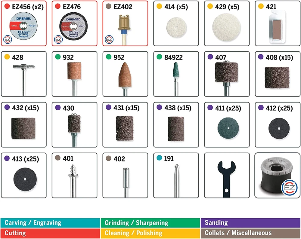 Store New Arrivals Add to Favorite View Feedback Contact Dremel 160-Piece Rotary Tool Accessory Kit with EZ Lock Technology - 1/8" Shank - Cutting Bits, Polishing Wheel and Compound, Sanding Drums & Disc (710-08) Description Item model number 710-08 Style model 08 Power Source Corded Electric Country of Origin USA Warranty Description Warranty Batteries Included? No Measurement System Metric Batteries Required? No Brand Dremel Material Plastic Is Discontinued By Manufacturer No Included Components Dremel 160-Piece Rotary Tool Accessory Kit with Item Package Quantity 1 Item dimensions L x W x H 1.81 x 7.25 x 9 inches Item Weight 0.01 ounces Special Features Cordless Special Feature Cordless Part Number 710-08 Color Blue Global Trade Identification Number 00080596029814 Recommended Uses For Product Cutting Manufacturer Dremel Product Dimensions 1.81 x 7.25 x 9 inches Size 160-Pieces ASSORTED KIT: The Dremel 160-piece Multipurpose Accessory set is the complete start-up kit you need to complete a wide range of DIY projects. Ideal for cutting, sanding, polishing, grinding, and carving. EZ LOCK TECHNOLOGY: Accessory set includes a variety of EZ Lock rotary accessories including the EZ Twist nose cap wrench, EZ Lock mandrel, and EZ Lock cut-off wheels. The patented Dremel EZ Lock system makes accessory changes 6X faster than using a standard mandrel. EASY ORGANIZATION: Accessory set includes a reusable storage bins and lift-out trays for the included bits. CARVING AND ENGRAVING ACCESSORIES: 191 Carving Bit (x1). GRINDING AND SHARPENING ACCESSORIES: 932 Aluminum oxide grinding stone (x1), 952 Aluminum oxide grinding stone (x1), 84922 Silicon carbide grinding stone (x1). CUTTING ACCESSORIES: EZ456 1 ½” Fiberglass-reinforced cut-off wheel (x2), EZ476 1 ½” Fiberglass-reinforced cut-off wheel for plastic (x1). SANDING ACCESSORIES: 407 ½" Sanding Band & Mandrel (x1), 408 ½” Sanding Band (x15), 411 3/4” Sanding Disc (x25), 412 Sanding Discs (x25), 413 Sanding Discs (x25), 430 Sanding Band & Mandrel (x1), 431 Sanding Band (x15), 432 Sanding Band (x15), 438 Sanding Band (x15). CLEANING, POLISHING, AND BUFFING ACCESSORIES: 414 ¼” Felt polishing wheel (x5), 429 1” Felt polishing wheel (x5), 428 Carbon Steel Brush (x1), 421 Polishing Compound (x1). COLLETS AND MISC ACCESSORIES: EZ495 EZ Twist nose cap wrench (x1), EZ402 EZ Lock Mandrel (x1), 401 Mandrel (x1), 402 Screw Mandrel (x1), Wrench (x1). Make the most of your Dremel rotary tools by using our innovative & extensive line of rotary accessories and attachments. Whatever your project, we’ve got the perfect solution for you. Dremel accessories fit inside your rotary tool to extend it’s versatility. Whether you’re looking to carve, engrave, cut, sand or grind, there is a Dremel accessory to get the job done with pinpoint precision. That’s why our purpose-built Dremel accessories let you get your project right down to the last detail. Dremel accessories are also color-coded into usage categories to make it easier for you to select the right accessory for your project. The Dremel 160-piece Multipurpose Accessory set offers a breadth of high-quality accessories providing a complete kit to get you started with your Dremel rotary tool. The kit includes the patented EZ Lock™ accessory system with the EZ Twist™ nose cap wrench, EZ Lock mandrel, and EZ Lock cut-off wheels allowing for quick and easy accessory changes. The included storage case features reusable storage bins and lift-out trays for easy organization of the included bits. This kit is ready for cutting, grinding, polishing, sanding, cleaning and more. Compatible with all Dremel corded and cordless rotary tools. There’s no need to hunt for the right collet, all Dremel rotary accessories feature a 1/8” standard shank. ABOUT US We offer the best prices around on high quality products. Our E-store includes media such as books, movies, music and games while offering electronics, toys, sporting apparel, clothing, tools, general home, garden items and more. SHIPPING We are always working hard to ensure your package arrives as soon as possible. Please understand that some factors like weather, high postal traffic, and the performance of shipping companies are outside of our control. We offer free shipping to the lower 48 states and ship within 2 business days of payment, usually sooner. We do not accept P.O. Boxes. Please provide a physical address. RETURNS We offer a 30-Day Return Policy on items which you are not completely satisfied with. You have the option for a full-refund or an exchange of the item. No returns are available on items shipped outside of the USA. PAYMENT We accept PayPal. CONTACT US This page content is yet to come Please ad us to your favorite seller and visit again later Thank You CUSTOMER SATISFACTION We try our very best to make sure every customer is completely satisfied. If there's a problem, message us! We're happy to help.