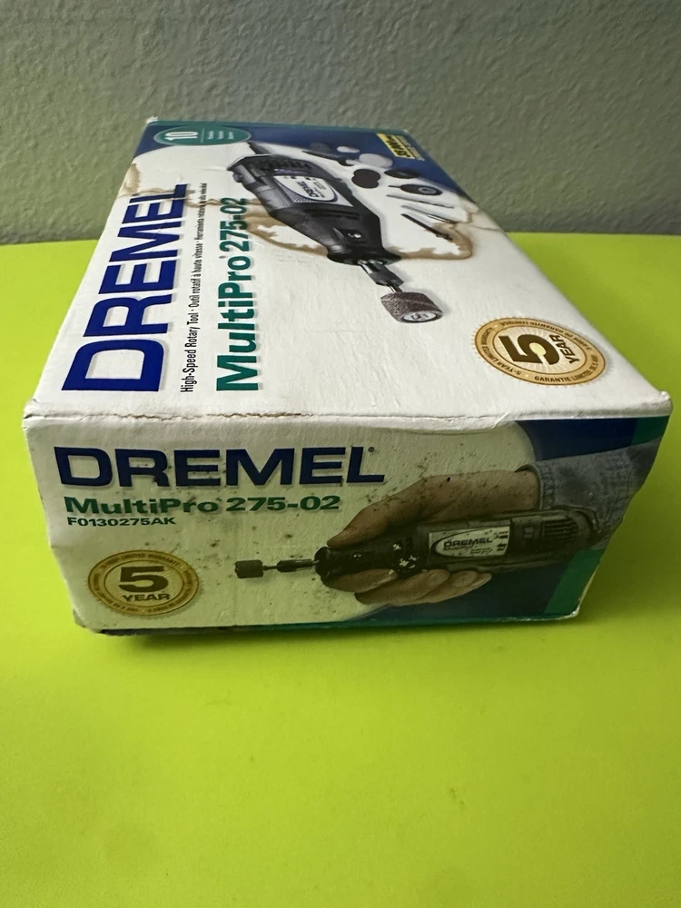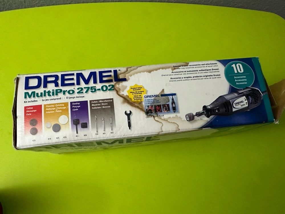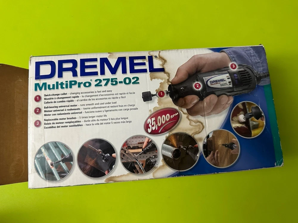 The Dremel MultiPro Rotary Tool Mod 275-02 is a versatile and powerful corded electric tool designed for a wide range of projects in the home and workshop. This multi-tool features a maximum speed of 35,000 RPM, making it ideal for precision cutting, sanding, and polishing. With a brushless motor and keyless chuck type, this Dremel model offers reliable performance and ease of use. The set includes various parts, accessories, manuals, and a box, providing users with the necessary tools to tackle their tasks. Made in the United States, this black rotary tool is a practical and durable addition to any toolbox. Used condition, tested and works Box is not in the best condition, product is