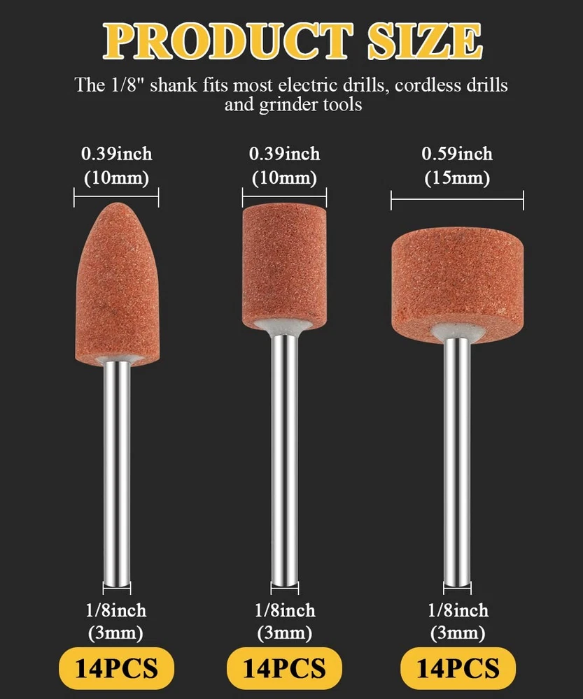 Wide Application - Rotary Tool Sanding Bits can be used for a variety of applications like sharpening lawn mower blades, screwdriver tips, knives, scissors, chisels and other cutting tools. Use to remove flash from metal castings, deburring any metal after cutting, smoothing welded joints, grinding off rivets and removing rust Different Shape Meet More Needs - Made into 10mm bullet shape, the grinding wheels for drill fit into tight spaces. Ideal for sanding after beveling holes in metal and wood. Made into 10mm and 15mm cylinder shape are ideal for smoothing, sharpening, deburring and other grinding and shaping needs More Durable - Made with aluminum oxide, A high-quality industrial abrasive made for extended use, making this Bits tough enough to smooth out most materials including stainless steel. It has plenty of shank for the collet or chuck to hold onto for proper attaching. And, this durable, grinding stone can be cleaned and restored to its original shape after extended use, longer tool life and more efficient grinding Wide Compatibility - Features a 1/8" shank, making the Grinding Stone suitable for most Dremel Rotary Tool, and other electric drills, cordless drills, die grinders What You Get - 14 Pcs 10mm cylinder shape, 14 Pcs 15mm cylinder shape, 14 Pcs 10mmbullet shape, and comes with a reusable clear storage case, and our provide friendly customer service, If YOU have any problems, please feel free to contact our customer services team, solutions would be within 24 hours