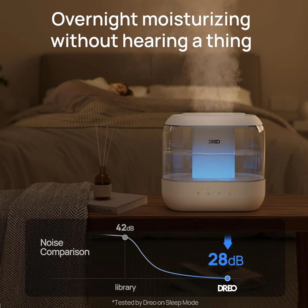Dreo Humidifiers for Bedroom, Top Fill 4L Supersized Cool Mist 4L, White Product Details Brand: Dreo Special Feature: Night Light, Adjustable Humidity Control, Easy Top-Fill, 28dB Ultra-Quiet Operation, Aroma Diffuser Color: White Filter Type: Pre Filter Floor Area: 300 Square Feet Operation Mode: Ultrasonic Product Dimensions: 5.51"D x 11.02"W x 10.16"H Item Weight: 3.1 Pounds Room Type: Kids Room, Office, Bedroom, Living Room, Nursery Model Name: HM311 Included Components: User Manual*1, Cleaning Guide*1, Cleaning Brush*1, Humidifier*1, Aroma Pad *2 (1 Pre-Installed) Voltage: 120 Volts Wattage: 26 Watt-hours Control Method: Touch Shape: Oval Manufacturer: Dreo Item Weight: 3.12 pounds Country of Origin: China Item model number: DR-HHM001 Care instructions: Hand Wash Assembly required: No Number of pieces: 1 Batteries required: No CapacityRuntime: 4 Liters32 hours MaterialPower Source: BPA-Free, suitable for baby, PlasticCorded Electric : Enjoy quiet sleep without congestion, coughing, or dry mouth, Dreo's ultrasonic atomization brings noise down to 28dB, while its 4L tank provides up to 32 hours of moisture without the need to refill. - : Powered by Dreo's Dual-intake and 4-inch mist outlet design, this humidifier creates a supersized mist of up to 40 inches tall for humidifying bedrooms, while bringing faster dry air relief to help you breathe easy and healthy. -: Thanks to its high-frequency atomization process, this humidifier for home releases 5μm Ultrafine mist and lighter mist particles, allowing humidity to spread evenly across the room without wetting surfaces. : This portable humidifier allows you to fill up without having to flip the tank or spill water on the floor. Its modular design is easy to remove and install, giving you a hassle-free cleaning experience. -- : This cool mist humidifier is a perfect companion for a healthier life, from helping you breathe easier, to making your own aromatherapy sessions, to changing the mood of your room with its ambient light (essential oils not included).