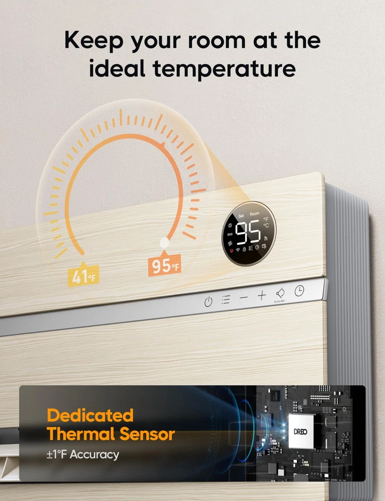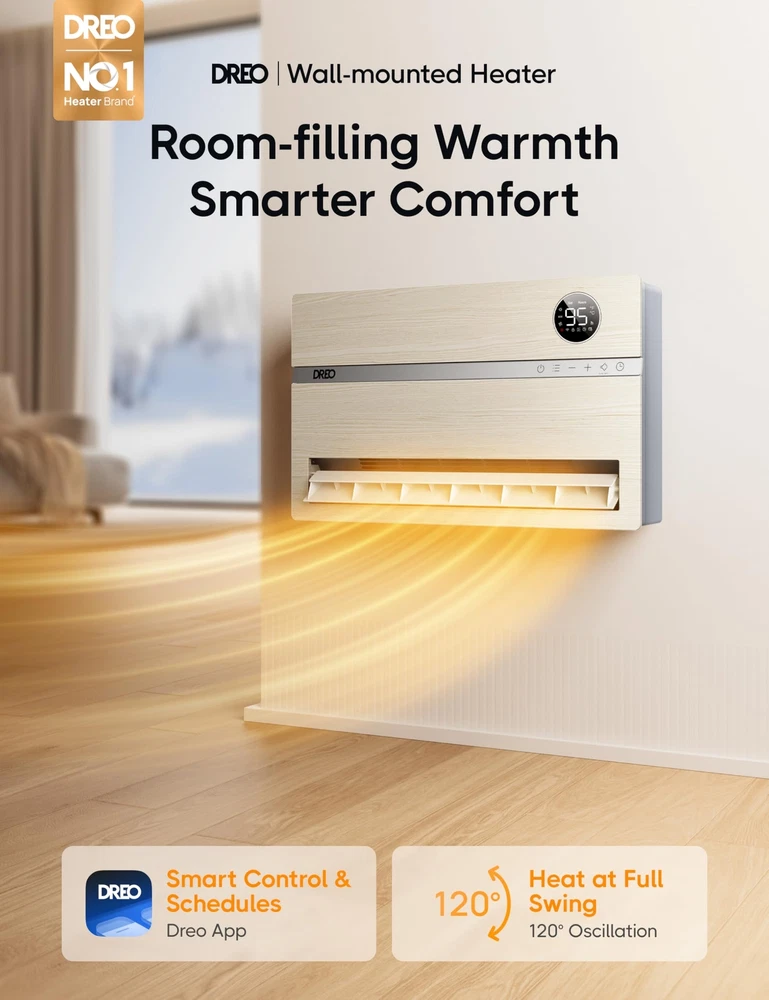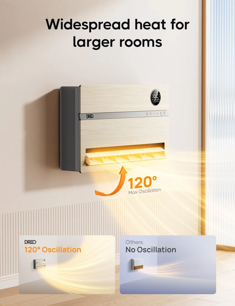 Dreo Smart Wall Heater, Electric Space Heater for Bedroom 1500W, 120° Vertical Oscillation, Adjustable Thermostat, Remote Control, 24H Timer, Easy-Mount Heater for Indoor Use, Works with Alexa, WH719S Widespread Warmth: Dreo's 120° wide oscillation heating distributes warm air evenly from top to bottom, helping to bring fast heat to every corner of your room more efficiently than regular wall-mounted heaters. Smart Control, Seamless Lifestyle: Schedule room heating hours to match your routine, access your heater settings from anywhere with the Dreo app, or even use your voice to control it thanks to Alexa and Google Home compatibility. Fast and Accurate Temperature Control: Set the room temp as you like, choose from 41 to 95°F range with an unprecedented 1°F accuracy. Dreo's PTC ceramic space heater brings fast and steady heating for an exceptional comfort experience. Ready for a Good Night Sleep: This smart heater for bedroom automatically adjust its LED panel brightness to low-light conditions, while it delivers warmth with lower noise, making sure nothing interrupts your sleep. Hassle-free Installation, Stress-free Maintenance: Get your space heater mounted easily. The package comes with all accessories including a convenient drilling guide with easy to follow steps. Keeping your wall-mounted heater like new is super convenient thanks to its reusable filter and detachable design. Heating Coverage: To ensure maximum warmth and comfort, use as a primary heat source for 215 sq. ft. areas, or up to 750 sq. ft. as a supplementary source. Check if your room has proper insulation for optimum efficiency.