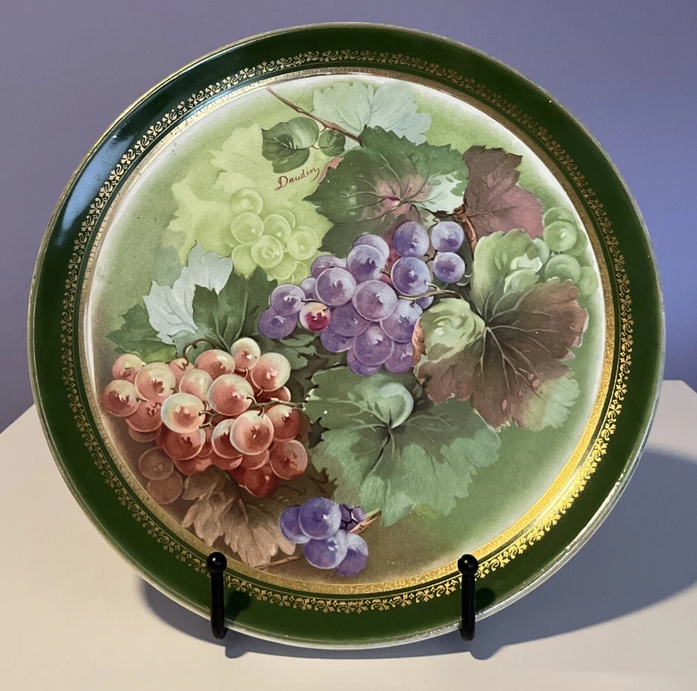 Dresden China Large Green w/ Gold Fruit or Serving Plate with Green and Purple Grapes Signed Daudin on front printed Dresden on back - Dimensions: 10.5” diameter This was in my mother’s collection purchased in 1994 from antique store. Only on display shelf or stores since purchase. Slight crazing due to age on back. Please review all pictures carefully as they are part of the description. Questions are welcome.