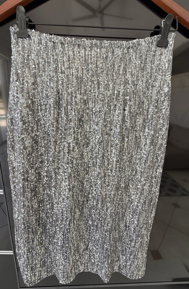Style: Straight & Pencil Skirt Length: Midi Features: Elastic Waist Closure: Pull On Size Type: Regular Type: Skirt Color: Silver Accents: Sequin Brand: Forum Size: S Department: Women Material: Polyester