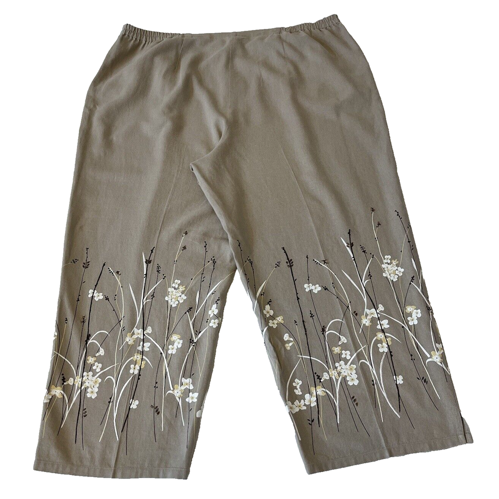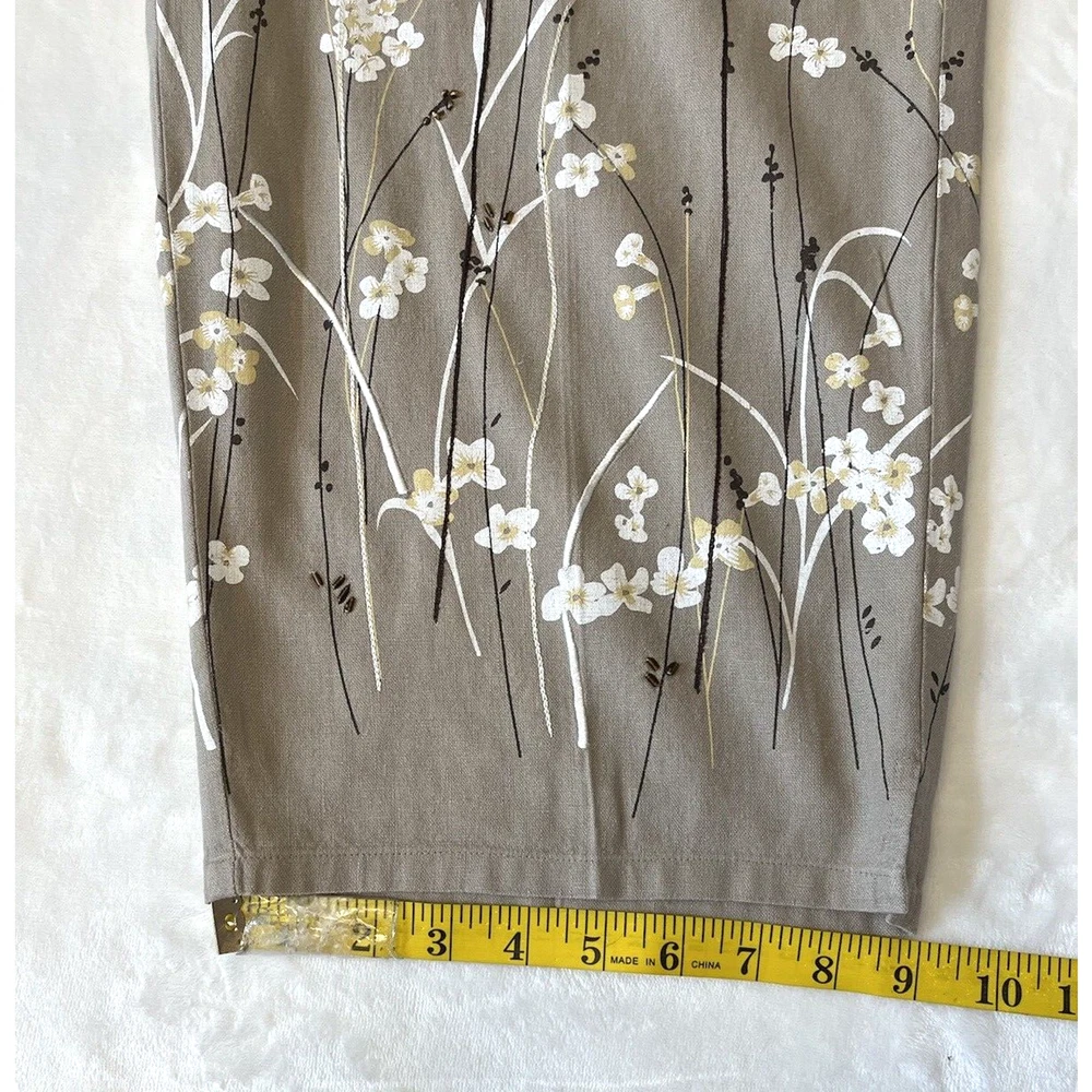 Elevate your wardrobe with these stylish Dressbarn women's khaki linen blend pants. These pants feature a beautiful floral design, a flat front, and a high rise for a flattering fit. The pull-on closure ensures comfort and ease of wear, while the cropped style with a 24.5 inch inseam and embroidered accents give these pants a chic and trendy look. Made from a blend of rayon and linen, these pants are perfect for summer, fall, and spring. With no mention of the item's condition, you can be assured that these pants are in great shape and ready to be added to your collection. Don't miss out on the opportunity to add these versatile and stylish pants to your wardrobe today.