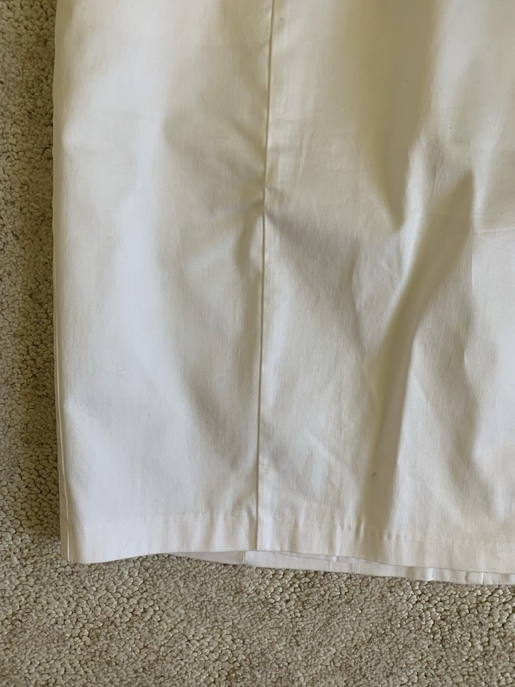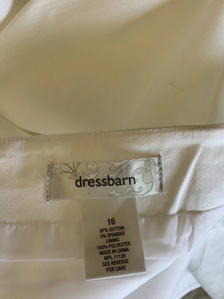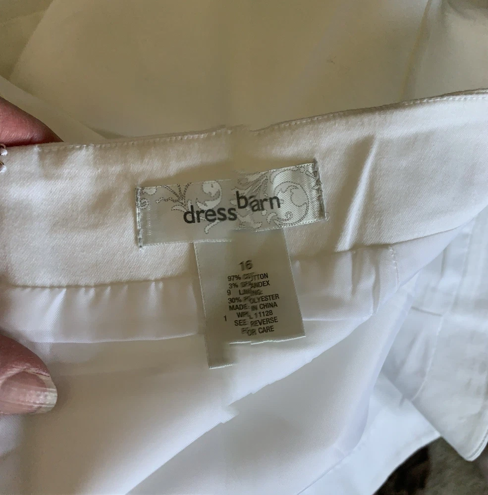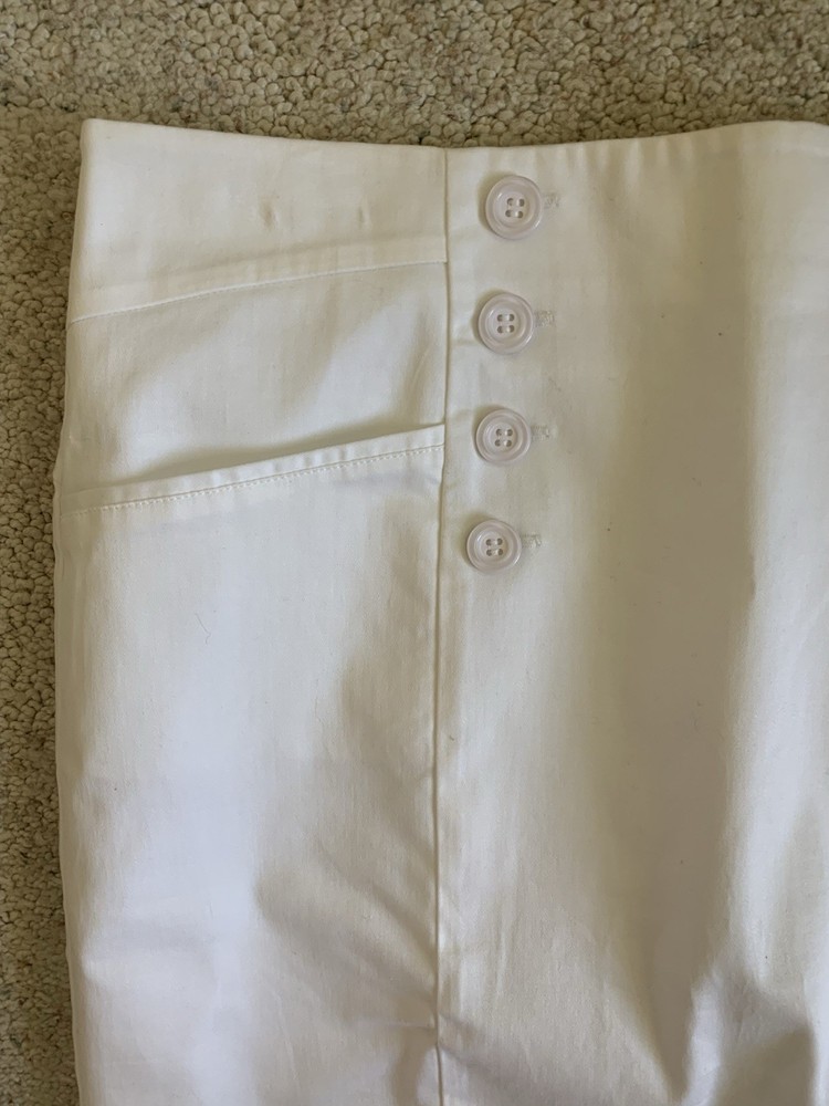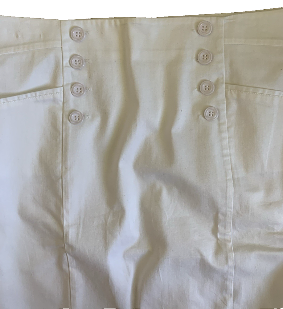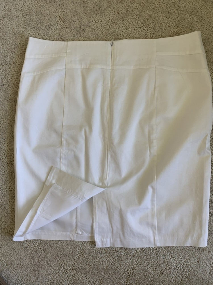 Dress up or dress down with this versatile white skirt from Dressbarn, a must-have for any wardrobe. The classic straight and pencil design, paired with functional pockets and chic button front nautical accent, offers both convenience and style. Crafted from a comfortable blend of 97% cotton and 3% spandex, this skirt ensures a flattering fit for regular size 16, perfect for casual occasions. The skirt's knee-length cut makes it ideal for spring, summer, or fall wear, and the lined interior provides added comfort. The back zip closure ensures a secure fit, while machine washability offers easy care. Embrace the nautical theme with this tasteful piece that will keep you looking sharp throughout the seasons. 38" at waist edge 22.5" long Back walking slit.