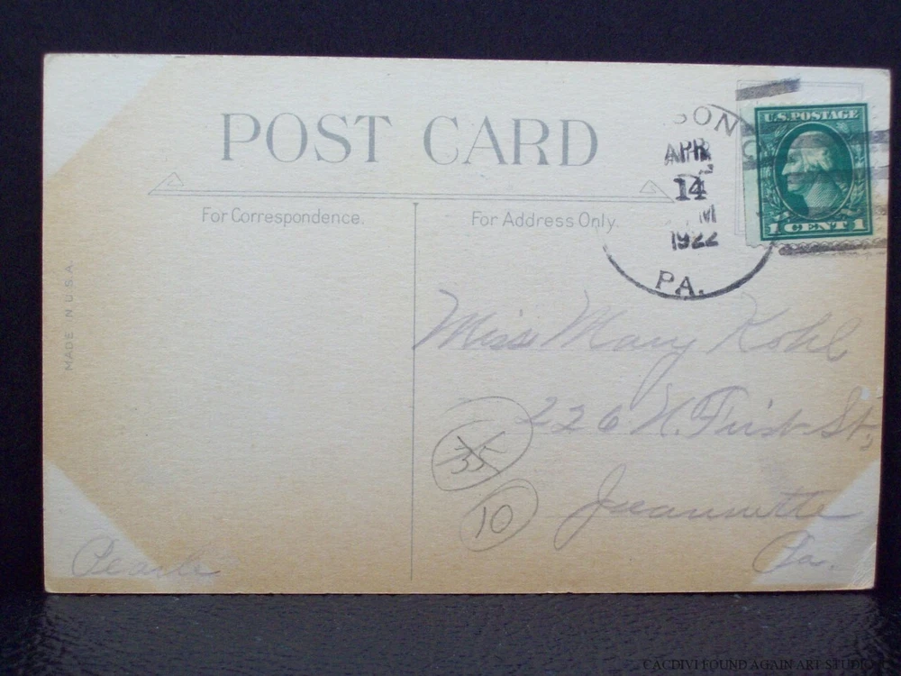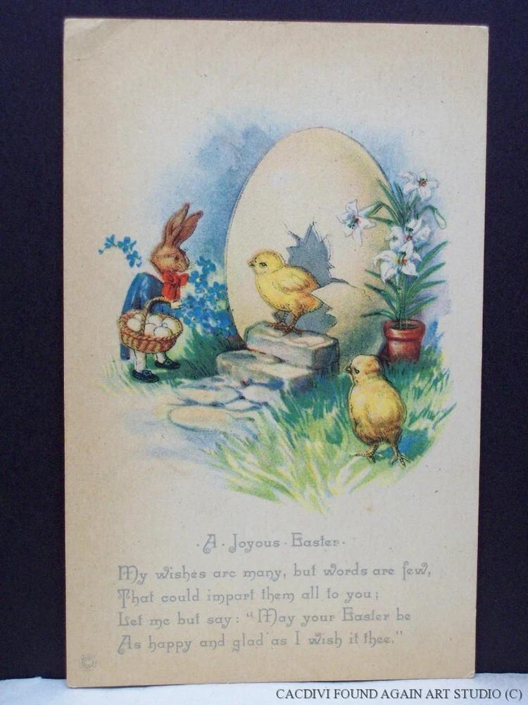 Dressed Easter Bunny Postcard Rabbit Visits Chicks Giant Eggshell House Flowers DESCRIPTION: This listing is for the preowned Antique Old Vintage Dressed Bunny Rabbit Visits Chicks in Big Eggshell House Easter Fantasy Holiday Postcard pictured only. It features a view of dressed rabbit with a basket of eggs. He is talking to a little chick standing on the door step of the eggshell house. Next to the house is a white ester lily and another little yellow chick is out in the yard. Below there is a poem verse. MESSAGE: No CAPTION: A Joyous Easter PUBLISHER: Julius Pollak N.Y. STAMP: Yes CANCEL: 1922 PA Review the photos closely as they are a necessary essential part of the description. Please take in consideration that I sell preowned antique and collectible items that are rarely pristine. This postcard may show some form of use with wear due to age, it is as found. The corners are lightly bumped and there are album creases. This postcard is a dark almond color with spots and album marks. Due to variations between computers, color may vary. If you have any questions or concerns, please a message me through eBay. See my other listings for more great items! All shipments start at USPS Ground Advantage. This rate allows me to use extra packing material and safely ship your item quickly. Items that are 250.00 or more will require signature confirmation. Free shipping via USPS Ground Advantage when shipped within the USA. Delivery time is a estimate that does not consider weather delays, holidays, or unexpected events. International purchasers it is your responsibility to be aware of any import or customs fees your country may apply to your incoming packages. I will not falsify information on the customs forms. First Class Package International rate can be expensive. Please click on to the shipping and payment tab to use the international postage calculator. If you wish your item to be shipped Registered Mail, this will be an additional charge added to the postage rate. Thank you for looking! inkfrog terapeak