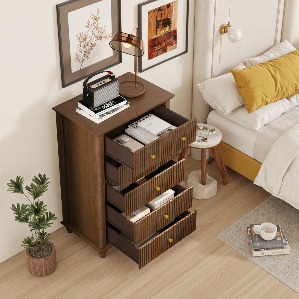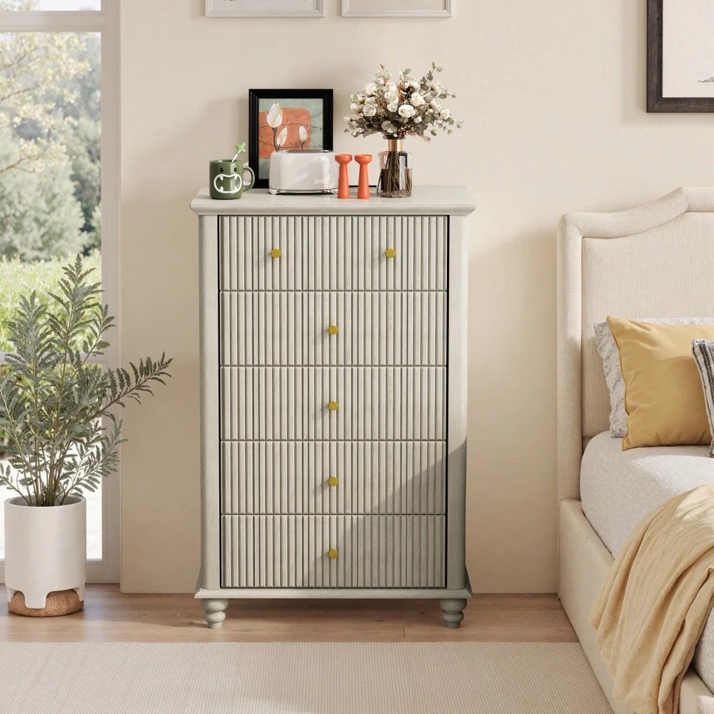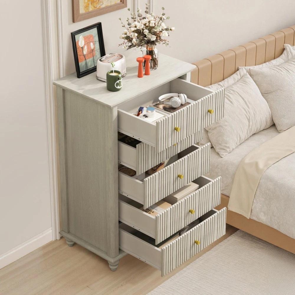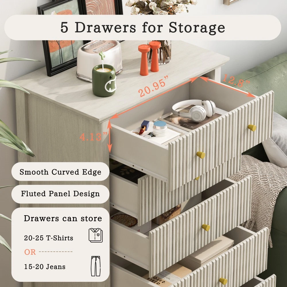 45" Fluted 5-Drawer Dresser - Modern Chest of Drawers for Bedroom/Living Room | 30-Day Free Return ✅ 1-Year Quality Warranty | 30-Day Free Return & Exchange | Two Stylish Colors Available Elevate your home storage with our Fluted 5-Drawer Dresser—where modern elegance meets unbeatable functionality. Crafted with high-quality materials and thoughtful design, this 45-inch tall chest of drawers keeps your space organized while adding a touch of sophistication to any room. Choose from warm Walnut or soft Beige to match your decor perfectly. Walnut Finish: Rich & Timeless The deep Walnut tone showcases natural wood grain details, pairing seamlessly with industrial, mid-century, or traditional interiors. It adds warmth to bedrooms and depth to entryways, making it a versatile statement piece. Beige Finish: Soft & Versatile The gentle Beige hue brings a calm, airy vibe to any space, complementing Scandinavian, modern, or coastal decor. It brightens bedrooms and blends effortlessly with living room furnishings for a cohesive look. ✨ Distinctive Fluted Design Stand out from ordinary dressers with the unique wavy fluted front—this texture adds layers of elegance and visual interest to the piece. Paired with sleek metal handles and a sturdy solid wood base, it creates a distinctive, personalized look that elevates your home’s aesthetic. The thick tabletop features natural wood grain, enhancing the dresser’s organic charm and quality feel. 💪 Premium Materials for Durability Built to last, this dresser combines high-quality MDF, pine, and rubber wood, with coated metal handles that resist scratches and wear. The smooth curved edges add a delicate touch while eliminating sharp corners—safe for families with kids and pets. Equipped with an anti-tip mechanism, it stays securely in place for added peace of mind. Each drawer holds up to 15 pounds, and the tabletop supports up to 250 pounds—perfect for heavy decor or storage. Cleaning is a breeze: simply wipe with a damp cloth and air dry. 📂 Spacious Storage for Every Need With 5 large drawers, this dresser offers ample space for clothing, personal essentials, linens, or home furnishings—say goodbye to cluttered closets and messy surfaces. The roomy tabletop is ideal for displaying photo frames, table lamps, alarm clocks, or decorative plants, turning storage into a decorative opportunity. It’s the perfect solution for bedrooms, living rooms, hallways, and entryways. 🔧 Quiet Function & Easy Assembly Smooth drawer slides ensure quiet, effortless opening and closing—no more noisy disruptions. Assembly is a cinch: each panel is clearly numbered, and we provide detailed instructions plus all required accessories. You’ll have your new dresser set up and ready to use in no time. 📐 Product & Packaging Specifications Category Specification Measurement Assembled Dresser Length 29.53 Inches Width 17.72 Inches Height 45.28 Inches Weight 98.11 Pounds Packaging Length 42.32 Inches Width 21.06 Inches Height 11.81 Inches Weight 110.23 Pounds 🛡️ Our Commitment to You We’re confident in the quality of our fluted dresser. That’s why every unit comes with a 1-Year Quality Warranty , covering any manufacturing defects. If you’re not completely satisfied with your purchase—whether it’s the color, fit, or function—take advantage of our 30-Day Free Return & Exchange Policy . Shop with total peace of mind, knowing your investment is protected. Fast Shipping to US Addresses! Each dresser is carefully packaged to ensure it arrives in perfect condition. Order today to transform your home storage.
