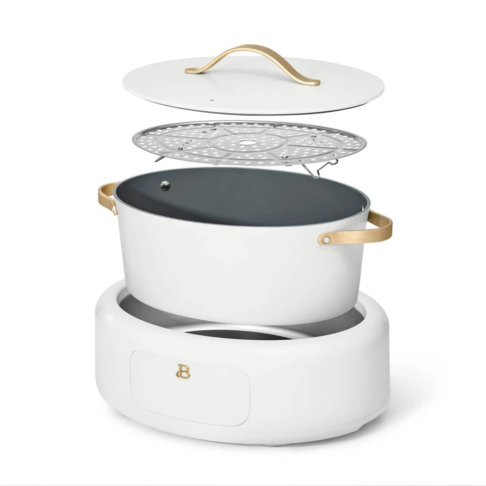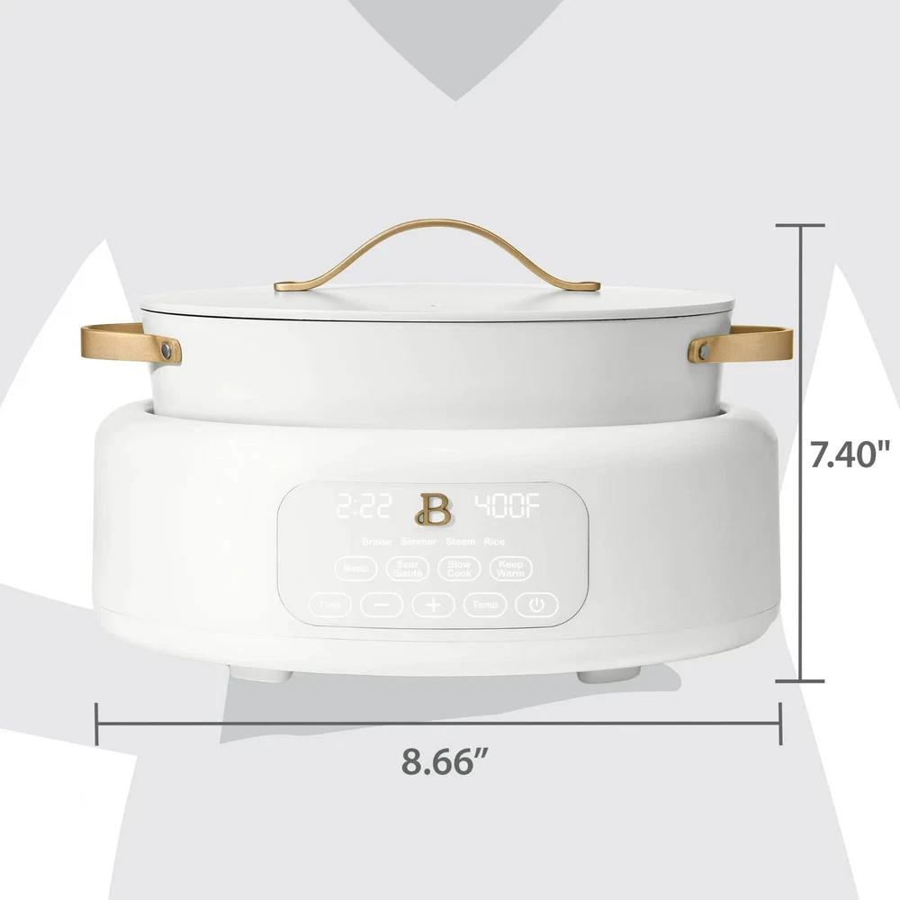 Sauté, slow cook, simmer, steam, and so much more—the Beautiful 10-in-1 6qt Electric Multi-Cooker is a marvel in the kitchen. This do-it-all countertop companion replaces 10 cooking essentials with 7 preset functions to easily whip up whatever you’re craving. Prep and cook right in the pot, then finish it off in the oven for a crisp finish—the pot and lid are oven safe up to 400°F. And did we mention it doubles as a stylish serving dish? Now that’s beautiful. Created by Drew Barrymore, Beautiful Kitchenware combines elegant design, contemporary colors and modern silhouettes for high-performance appliances that look beautiful in your kitchen. Condition: new. 6qt capacity, serves up to 7 people Replaces 10 cooking go-tos: sauté pan, skillet, slow cooker, stock pot, braiser, steamer, dutch oven, rice cooker, serving dish, warming tray Features 7 preset functions: sear/sauté, slow cook, braise, simmer, steam, rice, warm Lightweight pot in a cast aluminum construction for easy maneuvering Adjust temperature and time setting on sleek touch-activated display—up to 400°F and 12 hours Vessel and lid are oven-safe to 400°F for crisping up meals Durable stainless steel handles, made to last Easy-to-clean and removable dishwasher-safe accessories Includes steam rack for vegetables and more Condition: new