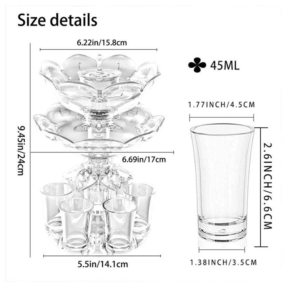 Home & Garden | Business & Industrial | Health & Beauty | Jewelry & Watches | Clothing, Shoes & Accessories | Collectibles | Sporting Goods | Toys & Hobbies Drink Dispenser Wine Accessories Wine Dispenser for Red Wine Party Home Description: 【Material】: The liquid dispenser considering durability, our 6 glass dispenser and holder combinations are made of food grade acrylic material to ensure durability, which is not fragile 【Distribute Liquid Evenly】: The dispenser is designed a flower shaped flow guide to ensure that all fluids are evenly distributed, with a diversion umbrella and balls on the top, which can pause the diversion at any time to prevent liquid from overflowing 【Double Layer Design】: Our glass dispenser feature a double layer design with a larger capacity and stylish petal shaped silhouette, making it a great decorative piece for any occasion, as a glasses holder it can store 6 glasses, elegant and space saving 【Features】: This wine decanter and holder is not only a drink dispenser, but also a beautiful glass holder and indoor crafts. Suitable for multiple occasions like home, bar, party, ktv, picnic, festival, etc 【Wide Used】: The bar mixer is very convenient restaurant supplies, this mug fits most of your favorite drinks like red wine, juice, wine, and more Specification: Material: Acrylic Size Chart: Wine Decanter: 18.3cmx24cm/7.20inchx9.45inch Single Cup: 14.5cmx6.6cm/5.71inchx2.60inch Package Includes: 1 Dispenser 6 Cups 1 Instruction Note: 1. Please allow slightly error due to manual measurement. 2. Due to the difference between different monitors, the picture may not reflect the actual color of the item. 3. Wish you a wonderful online shopping! Payment Shipping Returns If you are bidding or ordering more than one item, the items will be combined into one order automatically thus you can pay altogether. If you want not to combine, please buy one and immediately pay one separately. Please pay what you win in 7 days. Unpaid Dispute will be automatically open if payment is not received after 7 days. If you pay the bill after received unpaid dispute, please email us to close the unpaid dispute. Because the unpaid dispute will not be closed automatically, and we may ignore it. The buyer is responsible for any applicable import duties and local taxes. Please verify with your customs before making your purchase. Please verify your address during checkout. We are not responsible for any wrong or undeliverable addresses. We are committed to give you the best customer service possible. If for any reason you are unsatisfied with a purchase, please contact us and we'll assist you with a prompt solution. Please let us work on the issues. We'd like to settle any problem in a friendly manner. Please do not open a case on eBay or PayPal, or leave any negative or neutral feedbacks directly! We always reply to messages within 2 business days (off-duty at weekend). Due to the difference of time zone between Hong Kong and your location, sometimes the answer will be delayed. If you do not get a response from us after 2 business days, please check your junk or spam mailbox. Unsatisfied product can be returned within 30 days from the delivery date . We can offer a full refund or exchange, but we are not responsible for return shipping cost. Please contact us to get a RMA number before sending out your return. Feedback: 1. Since your feedback is very important to our business's development, we sincerely invite you to leave positive feedback with four 5-Detailed Selling Rating (DSR) to us basing on your satisfaction with our commodity and service. It's just take you 1 minute. 2. Unfortunately, If you are planning to give us a neutral/negative feedback because of your bad buying experience with us, please contact us at any time so as to clear up your discontent and resolve the problem. Featured Products People always bought together with