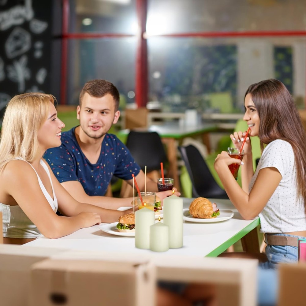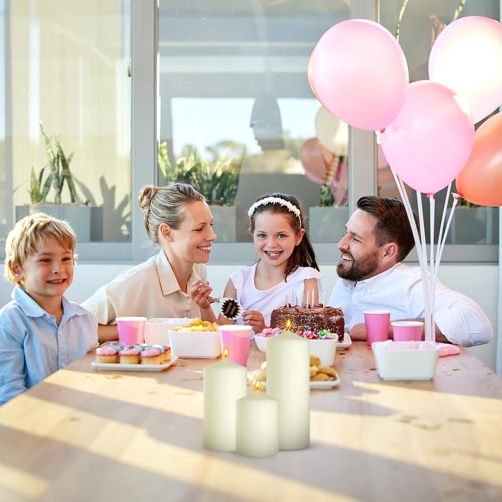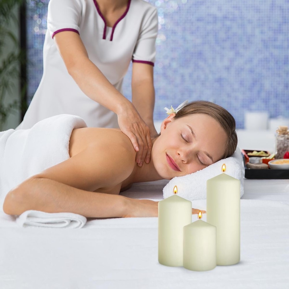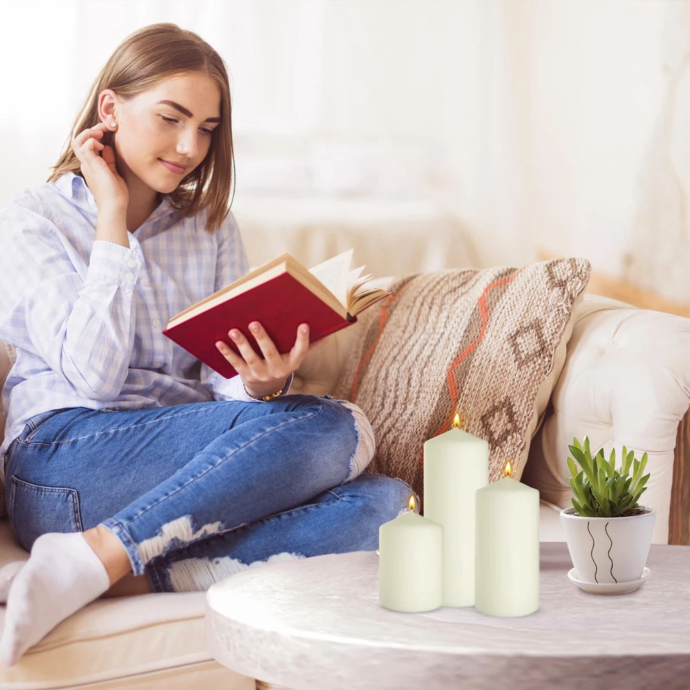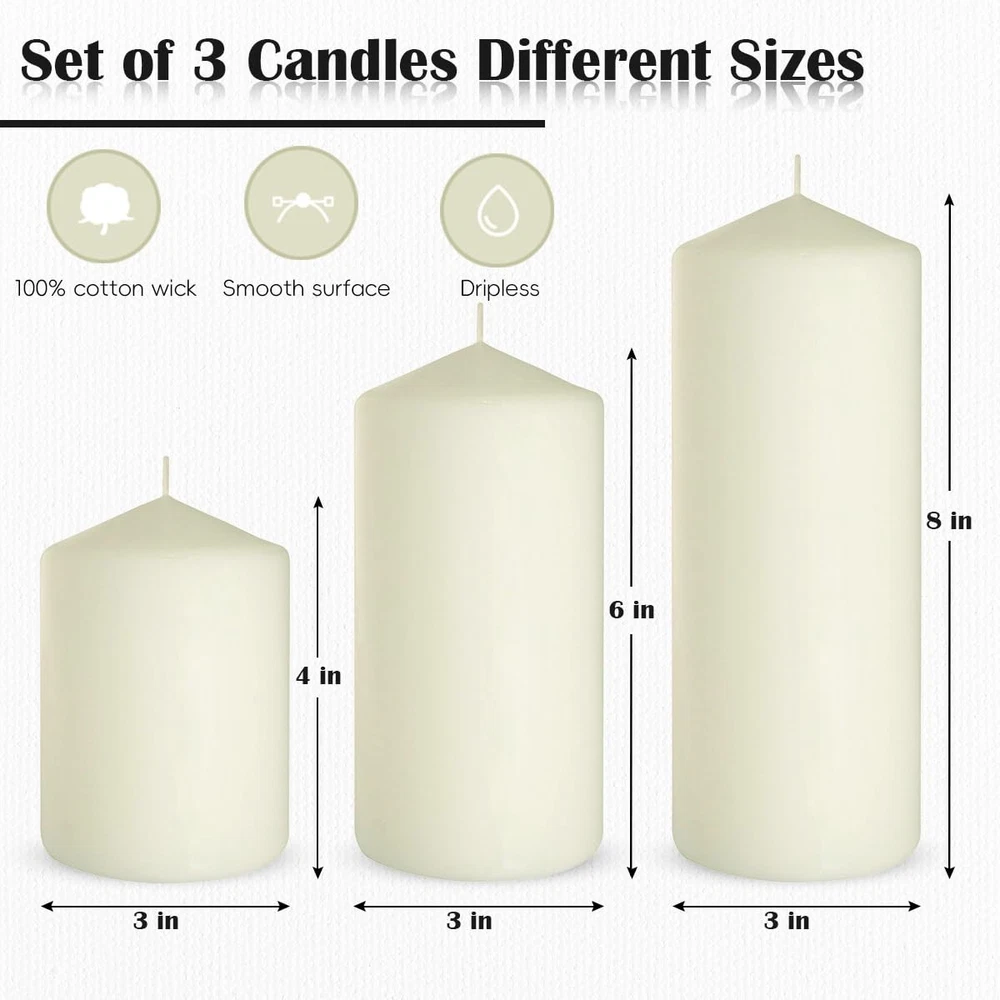 Dripless 3x4 3x6 3x8 Inch Ivory Pillar Candles, 3 3x4+3x6+3x8 Inch, Product Details 3 Different Sizes Pillar Candles: We hand pour every unscented ivory pillar candle with clean burning wax and lead-free cotton wicks. Dripless & Smokeless: Each large ivory pillar candle is crafted of the highest quality wax to enhance its appearance and prevent it from dripping or melting away fast. Evenly Burn: The dripless ivory wax pillar candles are made of high quality wax and 100% cotton wicks for dripless and clean burning. No worry about leaving a small hole down the middle and the wick becoming drowned in the wax. Nice for Adding Simple Ivory Decor: The smokeless 3 inch plain pillar candles are scentless and odorless, don’t give off any weird scents to give friendly and warm atmosphere for party gatherings or wedding reception. Securely Packaged: The non-toxic wax ivory cylinder column candles are wrapped individually and packed sturdily for transportation and perfect condition candles when received. Tips:1. The wick on the top of these candles comes slightly bent sideways or laying flat on the pillar candle, and there is a purpose for that. Just place it in the holder, THEN pull up the wick to light it.2. If the wick straightens itself out on top in the first minute of burning, causing the bottom to fall out, which in turn causes the candle to extinguish itself, what can do?Hold a match under the tin circle bottom for a few seconds allowing it to melt into the bottom of the candle's wax. That will then hold the wick firmly in place for the life of the candle.3. Pour a small layer of water in the bottom of the candle holder, just enough to cover the bottom glass. This makes it so much easier to pull the melted wax out once the candle has finished burning.What's in the Package?1 x Ivory Pillar Candles (3x4 Inch)1 x Ivory Pillar Candles (3x6 Inch)1 x Ivory Pillar Candles (3x8 Inch)