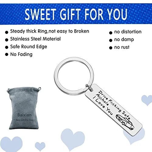 Return Policy Fast Delivery Trusted seller Drive Safe Keychain for Dad Boyfriend Husband Funny Drive Safe Keychain New Driver Trucker Gifts Birthday Valentine's Day Christmas Gifts for Women Men Drive Safe Jewelry Gifts Product Description 【Drive Safely Key chain】: Drive Safely ... I Love You. Unisex Key chain charm pendant. funny couple Key ring gifts, It will remind him that a person who loves him so much is anxiously awaiting for his safe arrival. 【Gifts for Him and Her】: Pay attention to safety on the road, I care about you.I love you keychain for boyfriend girlfriend couple keyring,a beautiful way to remind your anyone you love that you want them to be safe. 【Boyfriend Husband Gifts】: Great gift idea for your boyfriend, husband, fiance, daddy, son, daughter ,girlfriend and best friends.Surprise them with this perfect lovely gift, dad gift, birthday gift ,thanksgiving gift,new driver gift,christmas gift, anniversary gift,valentines day gift. 【Couple Keyring Gifts】: New Driver Gifts was made of high quality stainless steel, smooth surface,super shiny,highly scratch-resistant.Hypoallergenic& durable, no tarnish,no rust,no fade.Size:12*50mm(0.47*1.97 inch). 【Couple Keychain】 This unique keyring makes an elegant and sentimental gift for your boyriend girlfriend wife and husabnd son daughter, the inspirational message will remind your lover to keep safe while she/he is driving. Shipping Returns Payment Shipping Shipping is FREE to all addresses other than APO/PO boxes in the lower 48 states. All our stock ships from US-based warehouses. Shipped via USPS or UPS (depending on location and package weight) Unless stated otherwise, all orders will ship within 24-72 hours of your payment being processed. Check our feedback to see the great reviews of FAST shipping we offer. Returns Seller does not accept returns Payment We currently accept payment via eBay managed payments only. Once payment is cleared, we will dispatch your shipment within 1-3 business days. Please refer to the "Shipping" tab for more information regarding shipping speed to your destination.