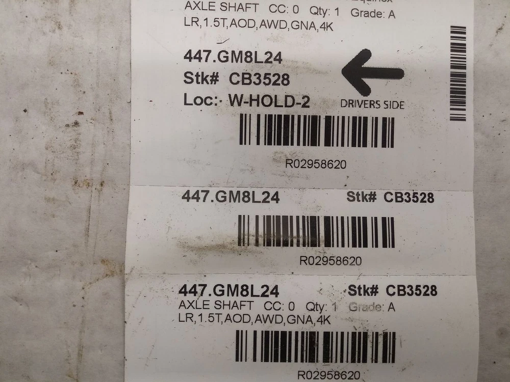 Store Home About Us Customer Resources Feedback Contact Us Driver Left Rear Equinox 2024 Axle Shaft 2958620 Free Shipping - 90 Day Warranty - Est. 1923 Description Quality Original Equipment Axle Shaft for Your Vehicle Schram Auto and Truck Parts - Axle Shaft or Jack Shaft Welcome to our listing for a recycled original equipment Axle Shaft / Jack Shaft . This essential component plays a vital role in your vehicle's drivetrain system. We take pride in offering inspected and fully functional axle shafts to ensure your vehicle's performance. Dependable Working Condition All of our used axle shafts have been meticulously inspected and are confirmed to be in good working condition. We understand the importance of reliable components in maintaining your vehicle's performance and safety. Confirm Fitment Before making a purchase, we strongly advise that you carefully read the provided 'FITMENT GUIDE.' This guide will assist you in confirming whether this Axle Shaft / Jack Shaft is the correct part for your specific vehicle model. Your satisfaction is our priority, and we want to ensure you get the right fit. Understanding the Condition In the 'Condition' section of this listing, you may find either ' jack shaft ' or ' axle shaft ' mentioned. Additionally, we've included helpful abbreviations for your convenience: FR : Front RR : Rear LR : Left Rear LH : Left Hand RH : Right Hand Ask Us for Clarifications We're committed to providing you with accurate and helpful information. If you have any questions or uncertainties, please don't hesitate to reach out to us before making your purchase. We're here to assist you in making an informed decision. Thank you for considering Schram Auto and Truck Parts for your Axle Shaft / Jack Shaft needs. Your satisfaction and vehicle's performance are our top priorities. Vehicle 2024 Equinox Mileage 3000 Part Grade A What's this? Conditions LR,1.5T,AOD,AWD,GNA,4K Fitment Guide This item will fit the following vehicles / applications: R# 2958620 Stk# CB3528 Holl# 447.GM8L24 More Parts for 2024 Equinox » More Parts from this exact vehicle. » Accessories Brakes and suspension Cooling Systems Electrical and Lighting Engine and Drivetrain Exterior Parts & Sheet Metal Interior Parts Wheels and Tires Customer Service Payments Shipping International Returns FAQs Contact Us Quick Links Store Home About Us Feedback