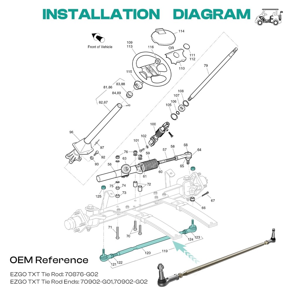 STORE HOME ALL ITEMS ABOUT US FEEDBACK CONTACT US click thumbnails above to enlarge Product Description -Ezgo tie rod fits 2001-current E-Z-GO gas and electric TXT 4/6-Passenger Shuttle ST Express, ST 480 ST Sport ST Sport II ST Sport 2+2 Clays Car. -Replaces ez go Golf Cart Tie Rod Ends OEM: Ezgo txt tie rod 70876-G02,ezgo tie rod ends: 70902-G01 70902-G02. -Package includes:1 Set ez go tie rod assembly(1x tie rod, 2 x tie rod ends). -The Tie rod length (with tie rod ends) is 26.96''. -The golf cart tie rod assembly is part of the vehicle's steering mechanism and serves to turn the wheels; replacing old parts in a timely manner can be an effective solution to your cart's forward noise and tire wear problems. -Easy Installation. We will strive to provide you with a more variety of golf cart accessories. High quality and durable A new driving experience Upgrade your golf cart Easy to install Delivery Terms of return After-sale Payment Delivery -Our warehouse located in GA, US. -We will process your package within 1-2 business days after your payment. It will take about 2-7 working days to reach to you. -Gentle Reminder: the following addresses are not available for delivery - Alaska, Guam, Hawaii, Puerto Rico. APO/FPO, US Protectorates. Terms of return -Return within 30 days from the purchase date - item must be unused and in original condition (packaging + tag included) -We will offer refund or replacement according to you massage left after received and have the returned item checked. After-sale -Comes with 1 year warranty. -We will always stand behind our products and strive to provide more variety of cart parts and golf accessories. -Please feel free to turn to us for any question regarding installation or the product. Payment -We accept payment through PayPal and all other Ebay approved forms of payment. -Payment must be made within 8 Working days after the auction/bid ends, or eBay will open Unpaid Item case automatically later. -When you have any questions about payment, shipping or product, Please send us an ebay message.Thank you. PRODUCT CATEGORIES Club Car Part YAMAHA Part EZGO Part Universal Part ABOUT DRIVE-UP 2018 Founded in 2018 73+ professional employees 15+ manufacturing years 3000+ factory area 80+ global sales country WHY CHOOSE DRIVE-UP ? Free shipping Free shipping on all domestic (u.s.) deliveries - no more extra charge included Professional service and guidance Provide installation guidance service After-sale Comes with 1 year warranty. USEFUL LINK STORE HOME HOT ITEMS ABOUT US FEEDBACK CONTACT US Copyright © DRIVE-UP. All Rights Reserved. PAYMENT