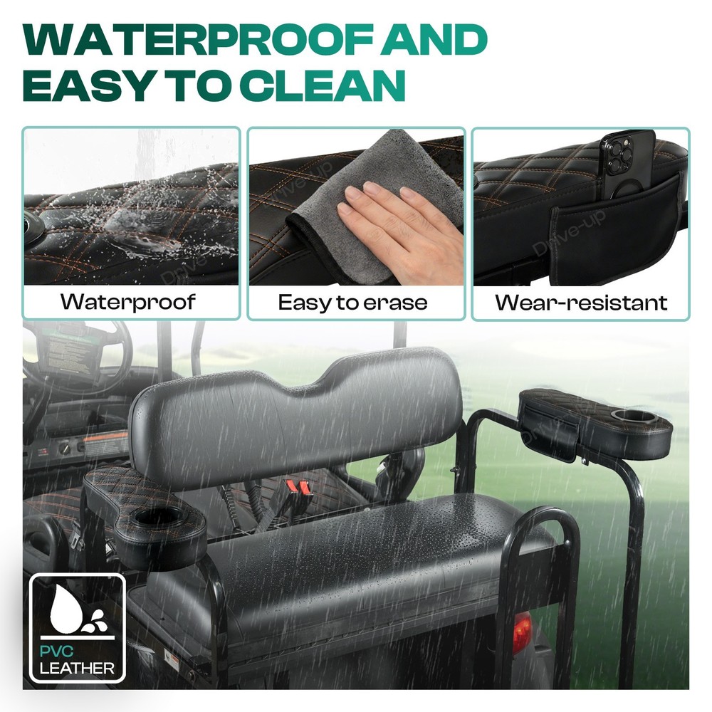 Manufacturer Part Number: XD-UN-0060 Color: Black Warranty: 1 Year Part Type: Rear Seat Arm Rest Brand: Drive-up Material: PVC leather Compatible Model: Precedent, TXT, EZGO, tempo, dcs, pds, onward Country of Origin: China Compatible Make: Club Car, E-Z-GO, Yamaha
