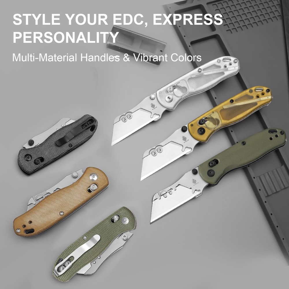 Specifications Model: Drop Bear Model Number: V3619JM1 Overall Length: 6 .69" / 170.0mm Designer: Azo Blade Length: 2.74 "/69.6mm Blade Material: SK5 & 5Cr15 Handle Length: 3.95 "/ 100.4 mm Handle Material: Micarta Weight: 2.92 oz/ 82.8g Color: Olive Green Double-anchor Blade Security: Dual screws with extended threading provide 2x contact surface versus standard designs. CNC-machined ensures Drop Bear utility knife blade stability during heavy-duty cutting tasks like cardboard processing. Small Tools, Great Utility: Streamlined handle of folding utility knife conceals stainless steel tweezers and toothpick. Quick-access slots maintain clean aesthetics while providing essential tools for daily needs like splinter removal or precision handling. Style Your EDC, Express Personality: Drop Bear box cutter knife offers a choice of PEI(ultra-lightweight), acrylic(vibrant colors), micarta(textured grip), or G10(durable composite). Different materials and finishes allow pocket knife to adapt to urban/outdoor scenarios. Your EDC becomes a style statement. Patented Clutch-Lock Safety: Drop Bear edc utility knife features clutch lock that keeps fingers clear of blade path during disengagement. Smooth ball-bearing pivot enables effortless one-handed operation. Tested enough cycles for reliable performance. Ergonomic Safety Control: The handle of pocket utility knife accommodates full-hand grip. Rounded edges prevent hotspots during prolonged use. Finger choil and jimping work synergistically to enhance control when trimming materials like leather or plastic sheets.