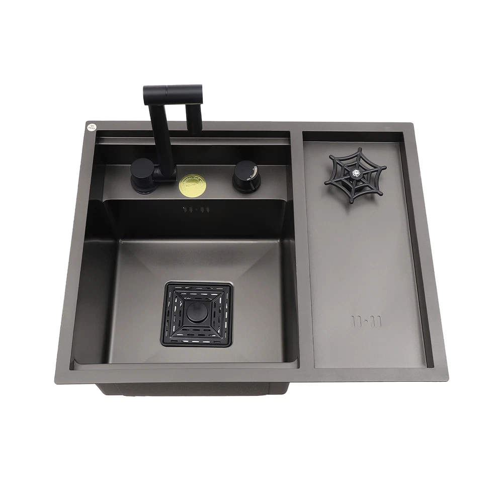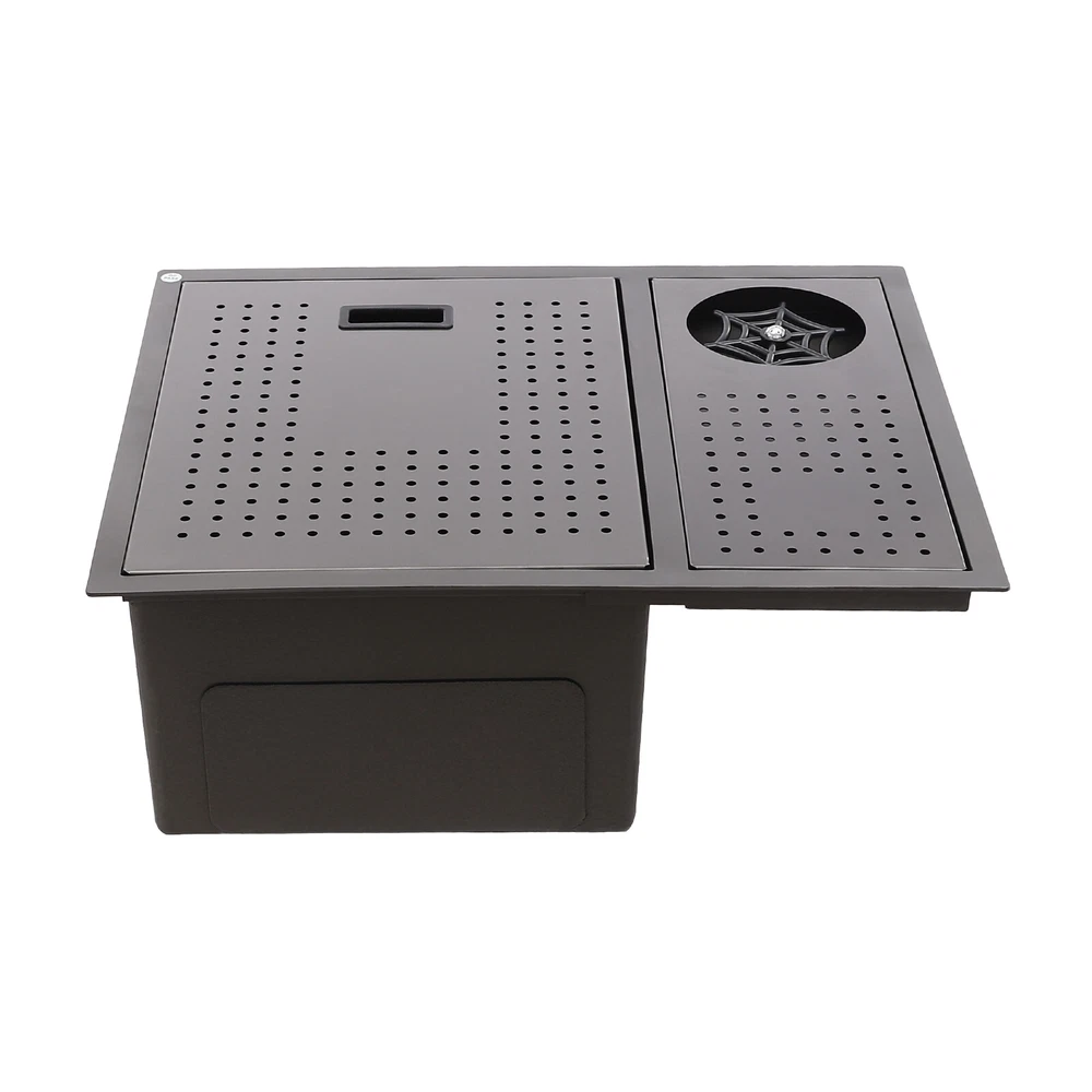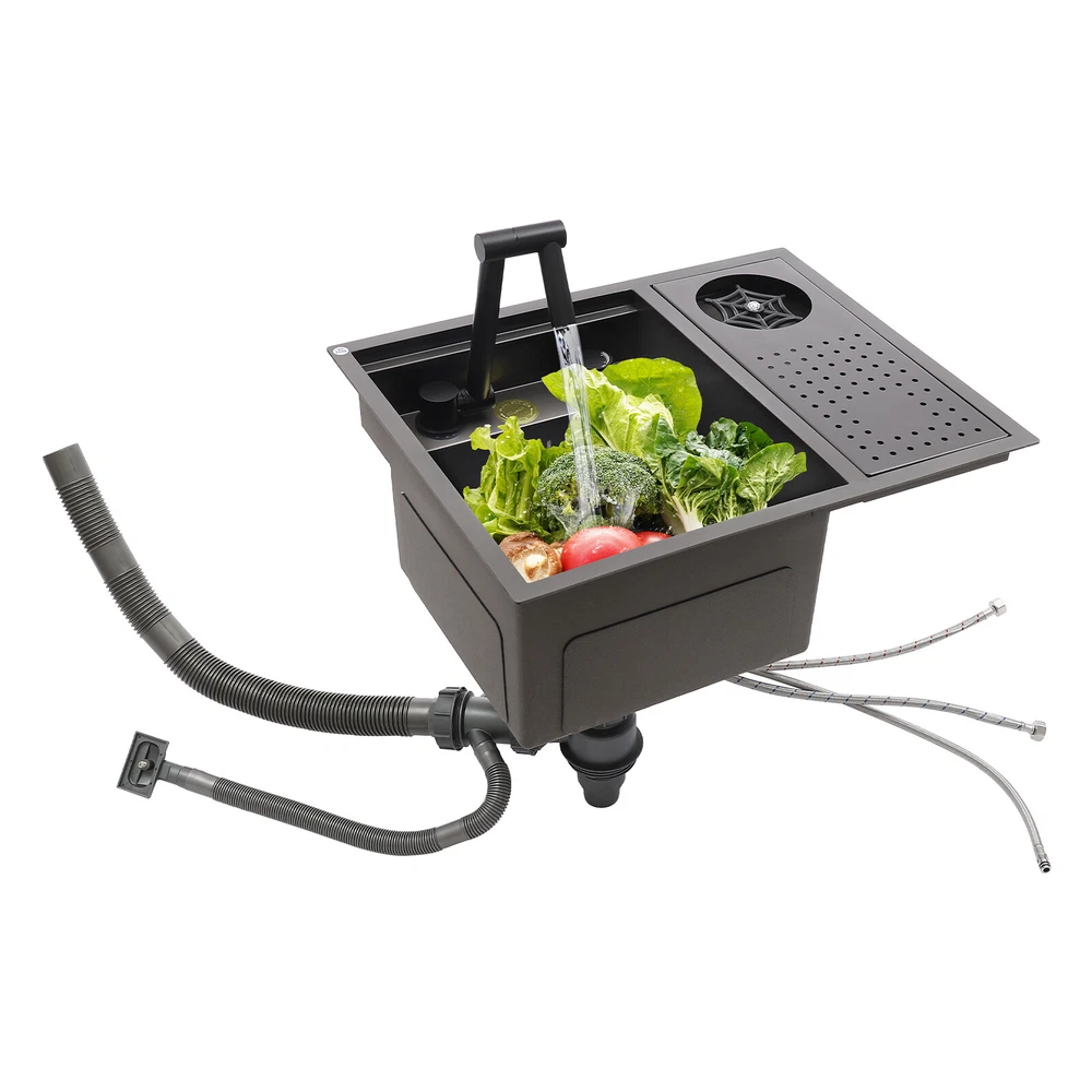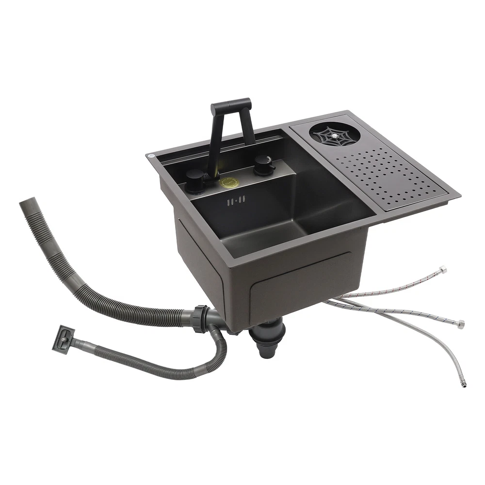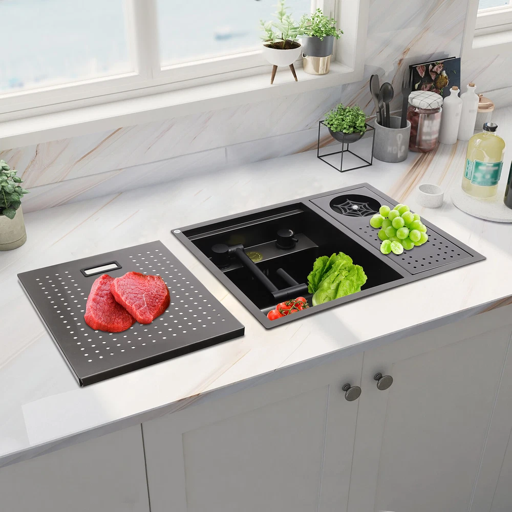 Drop In Sink Single Bowl Stainless Steel Top Mount Kitchen Bar Sink w/Faucet Welcom to ristarstore! Specification Material: Nano-stainless steel Color: Black Process: Spray Finishing Shape: Rectangular Style: Modern Assembly Required: Yes Mounting Type: Under-counter, Center, Countertop Sink Depth: 220mm/8.66in Product Size: 54.86*44.96*22.1cm/21.6*17.7*8.7in Package Size: 60*50*26.5cm/23.62*19.69*10.43in Gross Weight: 8.6kg/18.96lbs Net Weight: 7.3kg/16.09lbs Package Included 1* Bar Sink 1* Faucet Other Accessories for Assembly Description Our stainless steel sink is a bar sink solution that combines modern design with practical functionality. Designed for home bars, small entertainment spaces, or professional bartending venues, it cleverly hides the sink under the bar, making it virtually invisible when not in use, which saves space and instantly enhances the cleanliness and premium feel of the space. Key Features Made to Last: High-quality nano stainless steel and exquisite black coating make this product bright, dirt and oil-resistant, wear-resistant, and not easy to rust and deform, ensuring a long service life. Advanced Technology: The sound damping pads and acoustic insulation materials reduce noise and ensure excellent noise reduction and quiet reliability.The thick undercoating also can prevent condensation. Convenient Cleaning: The 360° rotatable faucet and 90° foldable handles provide a full range of cleaning for your items, allowing you to enjoy a comfortable and easy cleaning experience. Large Sink Space: Large 8.66-inch deepening capacity can accommodate more pots and pans while preventing splashing. It can meet the large bar, family, and other multi-scenario uses. Innovative Design: When not in use, you can close the cover to make it a kitchen workbench, allowing you to do chopping, kneading, etc. on it, providing you with great convenience. In addition, you can also reverse the cover to turn it into a draining basin in a second! Quick Draining: The X-shaped inverted flow design gives the sink a good drainage function, which can effectively prevent water from accumulating. In addition, it makes the surface less likely to adhere to stains, making it easy for you to clean. The filter basket can keep large solid residues inside the sink and protect the pipe from blocking. Installation Options Available: The product has three installation options: under-counter basin installation, center basin installation, and countertop basin installation, you can choose according to your own preferences or the specifics of the space. Hot & Cold Water Adjustment: The configured hot and cold water adjustment valve provides great convenience for you to regulate the water temperature. Simple Installation: Simple construction and a full range of installation accessories ensure that you can install the sink quickly and accurately to meet your needs in a short period. Effortless Cleaning: The smooth surface, round corners, and simple structure allow you to clean it easily without leaving dead corners of dirt accumulation. Details Push Cup Washer: It only requires you to press with one hand to dispense water for a quick cup rinse. Anti-overflow Hole: This design can effectively prevent the water from overflowing when you don't turn off the faucet in time. Application This product is suitable for kitchen sinks, center island counter sinks, bar sinks, flat sinks, wine counter sinks, etc. How to Install Place the sink in the installation position, turn it over, and place it on the floor. Press down on the sink and trace the outline along the edge of the sink. Remove the sink and draw a cut line 0.39 inch inside the outline of the sink. Drill a hole with a diameter of 14.96 inches inside the cutting line, put in the saw blade, and cut along the cutting line, then use sandpaper(not included) to smooth the cut. Fill the outside of the incision with clear silicone(some installers use glass glue)(not included), width 0.13-2.52in. After installing the kitchen faucet, put the sink close to the front edge and ease it down. Check the position of the sink on the countertop again, apply glass adhesive(not included) or install the fastener at the connecting strip, and clean the countertop. Notes Please check the size carefully before ordering. Please note that if you carry out the under-counter basin installation, you need to take the cover and sink together to the qualified installation person, in order to open and install the holes together against each other, to avoid the situation that the cover can not be covered. Please do not clean it with hard tools like steel wire balls for a longer service life. Please allow the slight color difference caused by the shooting light and 1-3cm error due to manual measurement, and make sure you do not mind before ordering. DESCRIPTION 6109 ☆ Payment Delivery details Terms of sales About us Contact us Payment We accept ebay payment 。 Fees such as import duties, taxes are not included in the item price or shipping costs. These charges are the buyer's responsibility. Delivery details Shipping: 2-9 working days to: USA Terms of sales We maintain high standards of excellence and strive for hundred percent customer satisfaction. Feedback is very important to us. We hope that you contact us immediately before you give neutral or negative feedback, so that we can address your concerns. It is impossible to address issues if we do not know about them! About us Your satis faction is our ultimate goal. We work hard to earn your trust and future business. Our certified technicians have tested each item before shipping. The unit comes with 1 year limited warranty on all manufacturing defects. a) If you receive a defective item, you may return it or ask for a discount. Please contact us within 14 days after you receive the package. b) What you returned must be intact and in its original packaging as re? u. Customer is responsible for shipping costs of the returned item. c) We will c