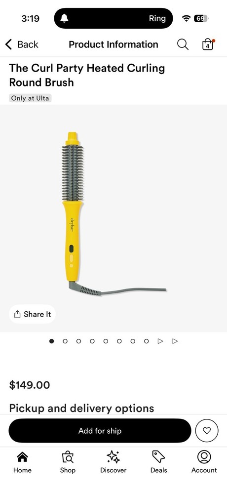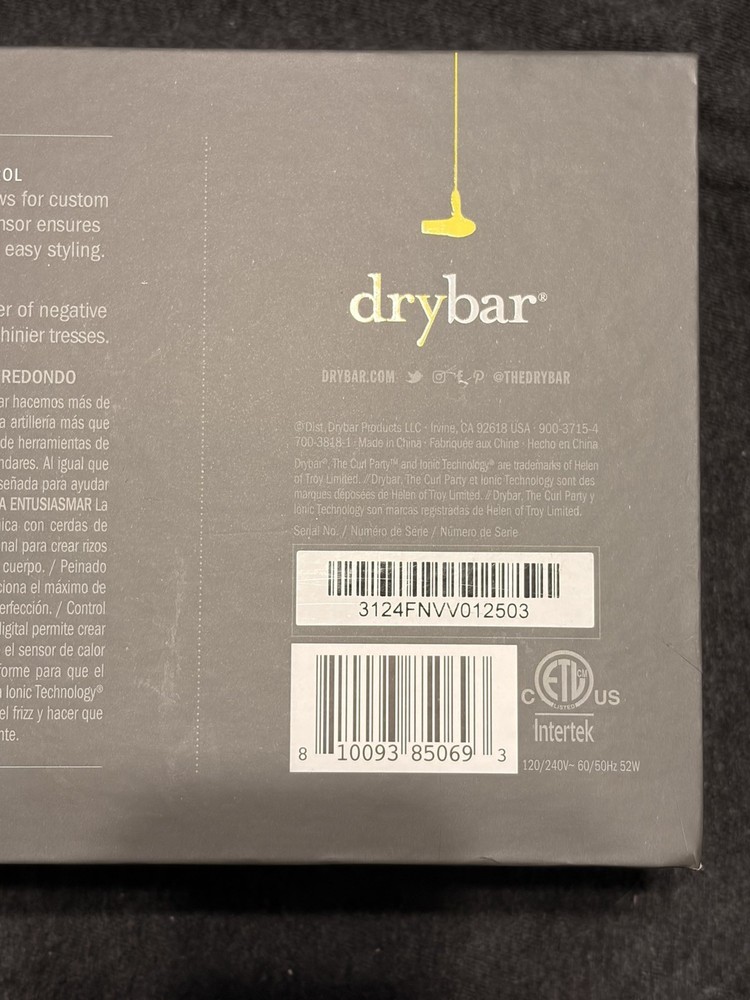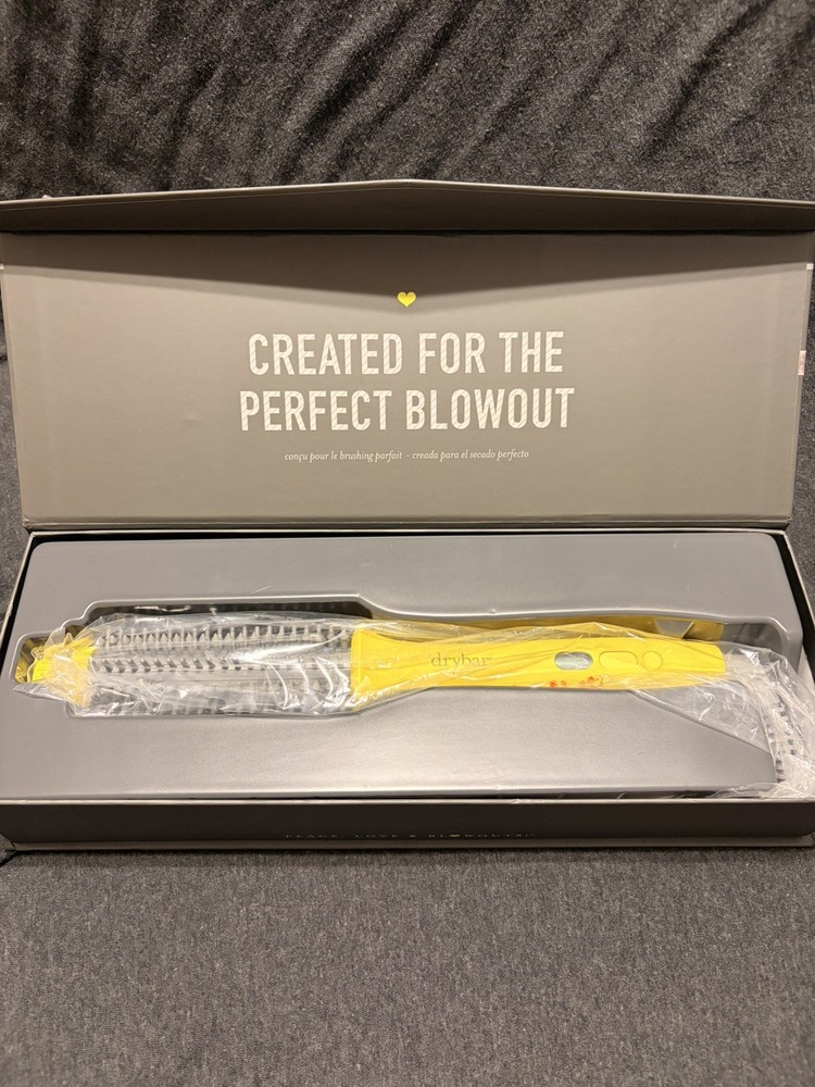 Used only once The Drybar The Curl Party Heated Curling Round Brush is a high-quality styling tool designed for all hair types. With a maximum temperature of 450 °F and ceramic heating plates, this electric curling brush from Drybar provides professional results. It features adjustable heat settings, ionic technology, a digital display, and a cool tip for safe and comfortable use. The vibrant yellow color and sleek design make it a stylish addition to any bathroom or vanity. Made with ceramic and plastic materials, this curling brush is a must-have for achieving beautiful curls with ease.