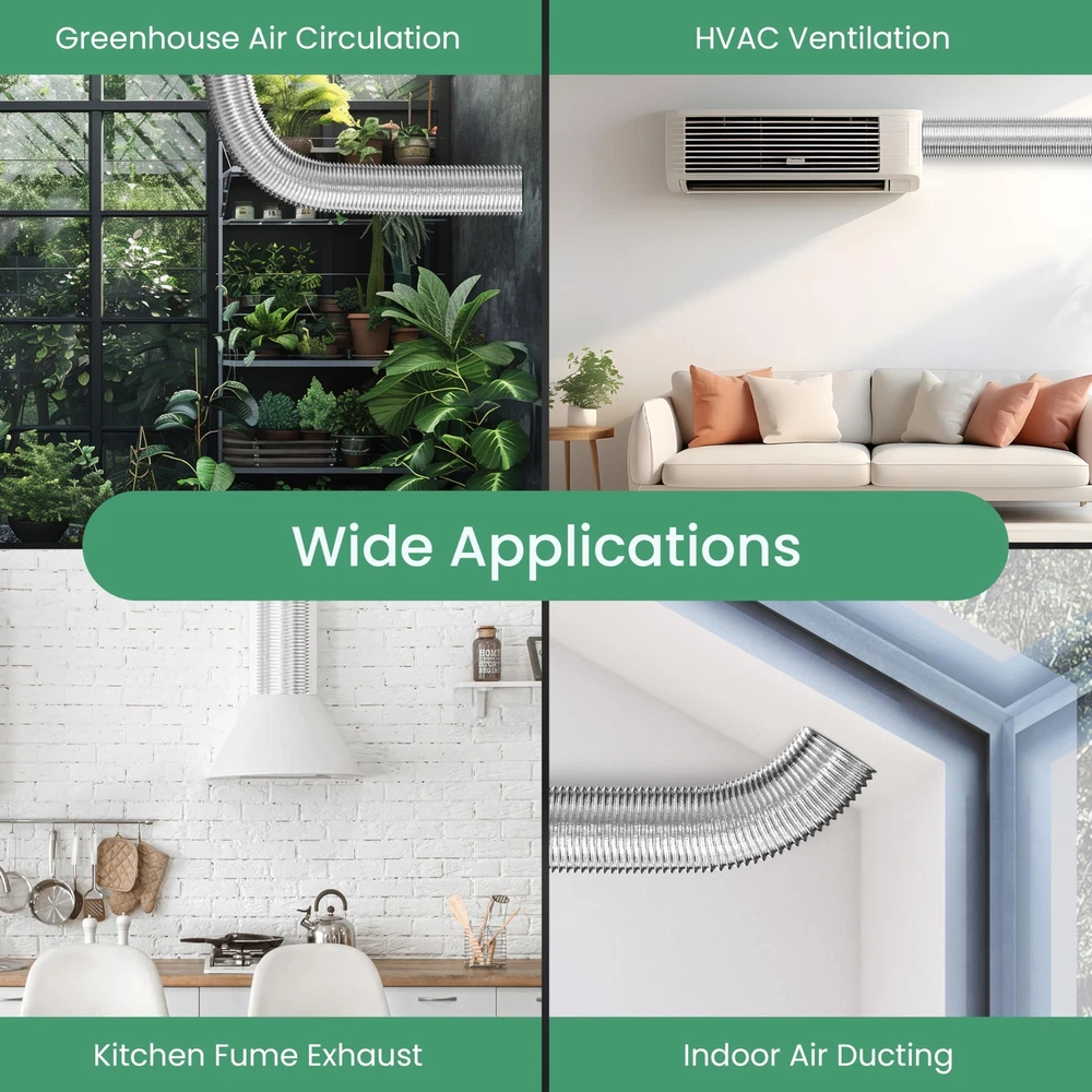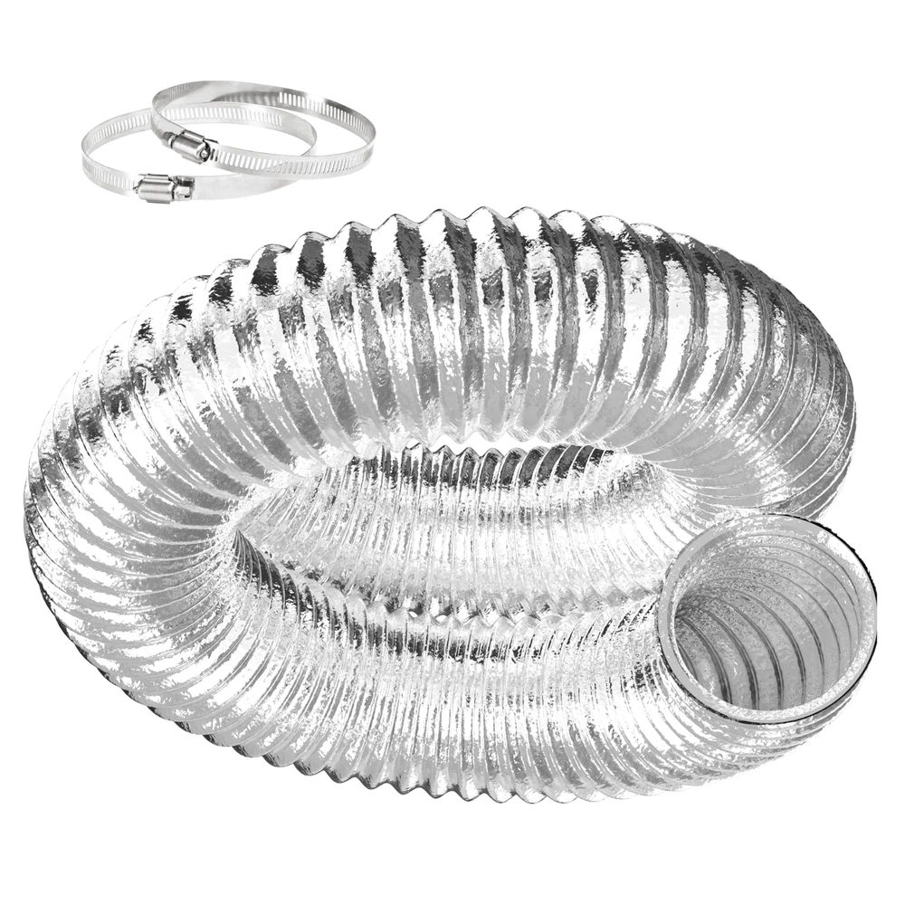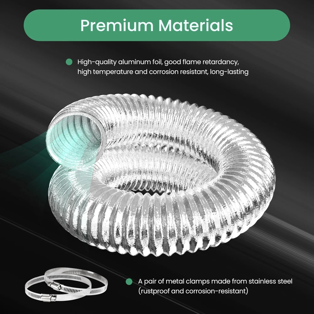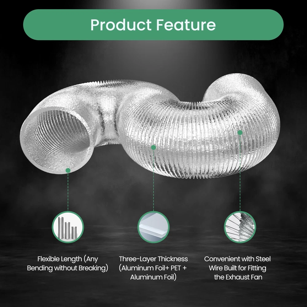 Three-Layer Design: Ducting three layer design keeps your ventilation system free of rips, our ducting is built with 3 layers of Aluminum foil with a layer of PET and steel wire helix, which makes it more durable and resistant to leaks, tears, and cuts Fire Resistant Air Duct: Dryer exhaust hose is fire resistant and no gas release in high temperature, built-in steel wire for reinforcement and long lasting performance. And the temperature range is from -30 degree to 150 degree Reduce Lower Noise: 4 inch flexible duct designed for reducing noise from fans and carbon filter systems, which can decrease the noise by up to 50% Easy to Install: Flexible dryer vent hose is easy to install, which will slide right on your duct fan, vent exhaust, carbon filter or light reflector. Although the ducting is easy installation, violent installation is prohibited Wide Applications: Aluminum ducting is suitable for HVAC system, it will move and deliver air in kitchens(cooking exhaust), greenhouses and growrooms(air circulation, intake, exhaust), bathrooms, dryer rooms, grow tents and other applications etc