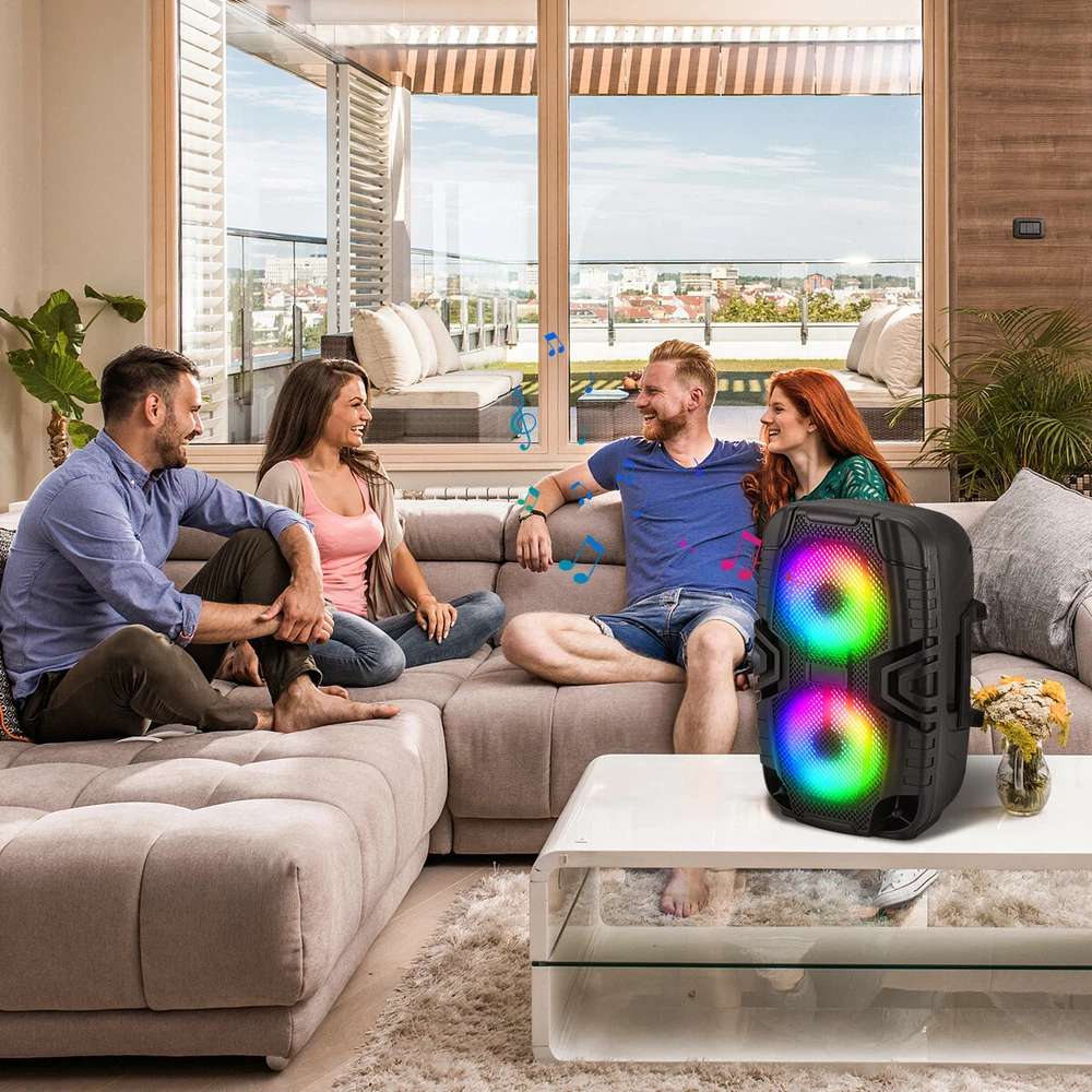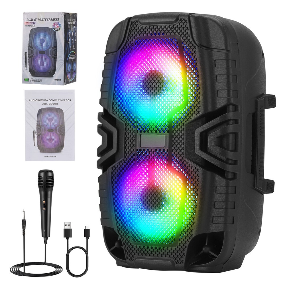 Dual 6" Bluetooth Speaker PA System Rechargeable W/ Wired Mic TWS/FM/USB/TF Features: Powerful Sound with Dual 6” Woofers : Experience deep bass and crystal-clear audio for any event. Bluetooth & Multi-Input Connectivity : Connect wirelessly via Bluetooth or use USB, TF card, FM radio, or AUX for versatile playback. WaveSync & TWS Pairing : Pair two speakers for double the sound and an enhanced stereo experience. 🎁 Cool lights/perfect gifts - Cool lights dance with you! The light bar that dances with the music allow you to participate in the singing and joyful atmosphere and dance together. The light on the bluetooth speaker can be like going to a disco party after turning off the lights! The buttons are easy to operate and look good, making it a perfect Christmas gift for your friends and children. Rechargeable Battery & USB-C Charging : Get up to 7 hours of playtime with fast USB-C charging for on-the-go entertainment. Specifications: Material: ABS Color: Black Bluetooth Model: ABX-2260R Speaker Size: 6 inch *2 Output: 8w Function: Bluetooth, USB, TF card, FM mode, AUX, TWS Battery Capacity: 3.7V 1800mah Package Includes: Dual 6-inch Bluetooth Speaker*1 Wired Microphone*1 Mirco USB Charging Cable*1 English Manual*1 Payment Delivery details Terms of sales Feedback Contact us Payment Immediate payment is required. Shipping will be arranged within 1 business day once payment is cleared. To uphold a shipping speed, your order will be processed almost immediately. If you change your mind after your payment is confirmed, we will do our best to cancel the order, however, we CANNOT guarantee the cancellation. Delivery details FREE SAME BUSINESS DAY MONDAY- FRIDAY SHIPPING FROM USA. No shipping on Weekends or US Public Holidays. No responsibility for any custom duty. We will ship your order to your Ebay Verified address provided. Please verify your address and make sure that it is your current address before making your payment. Any address change requests after your payment CANNOT be guaranteed. Shipping information will be updated when available. All of our products can be shipped internationally. To confirm the shipping rates to your country please refer to eBay's Shipping Tab above. Any brokerage, customs, and duty fees associated with international shipments are the customer's responsibility and are not included in our shipping fee. A phone number is required for the customs documents. Failure to provide one will result in delays. We do not include an invoice or any advertising materials with our shipments. Terms of sales We stand behind our items and offer 60 days warranty. All items are in new and working condition unless specified otherwise elsewhere in the description. All Returns - defective or otherwise - MUST BE PREAUTHORIZED to guarantee refund or exchange. Please contact us to get an authorization and return address. Buyer agrees to pay for the cost of re-shipment for undeliverable or wrong addresses. Buyer is responsible for Return Postage if return/replacement is not a result of our mistake such as wrong item. Replacement or Refund will be made upon receipt of the returned item. Please include tracking number so we can process ASAP. If you do not wish to wait for a replacement, please repurchase the item. Feedback We strive to provide the best products and services. Your positive feedback 5 stars DSR help us do better. If anything about your transaction did not meet expectations, please CONTACT US and give us the opportunity to make things right. We are always here to help. Contact us Please do not hesitate to CONTACT US . You can message 24/7 on eBay for all questions and inquiries. We will get back to you within one business days at the latest from Monday- Friday.