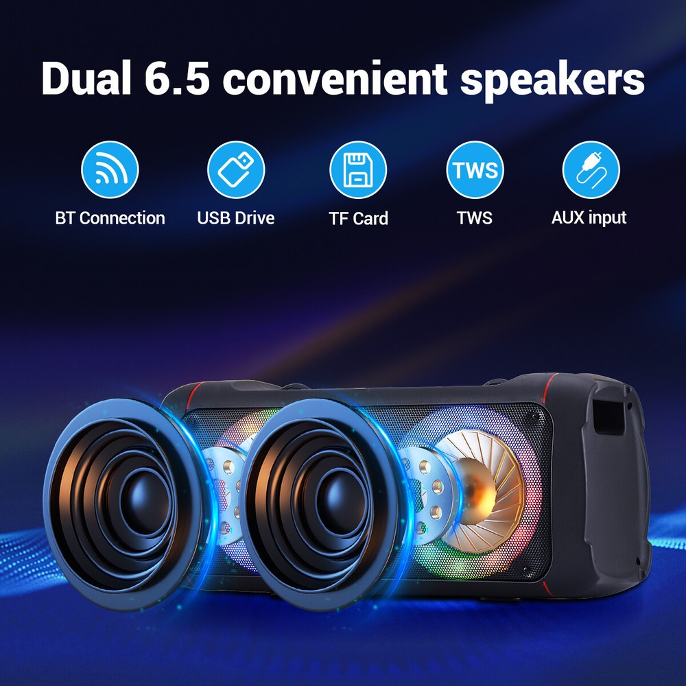Dual 6.5 Inch Portable Bluetooth Speaker Wireless Rechargeable Loud Boombox TWS Feature: đ”ăPowerful Bass & Clear Trebleă: The bluetooth speaker for beach is a professional audio system with dual 6.5 inch subwoofer drivers, delivering crisp highs without distortion. You can get 360° real surround sound, providing a feast for the ears of any music lover. It is ideal for indoor and outdoor gatherings in a variety of scenarios. đ”ăBluetooth & Wide Compatibilityă: The loud bluetooth speaker built with the latest Bluetooth chip to connect to any device within minutes, perfect for outdoor picnics and camping. This outdoor speaker supports Micro TF cards, Flash USB, and AUX-in connectivity. It is widely compatible with most android mobile phones, iPhones, TVs, iPads, tablets, and PCs. đ”ăTWS Featuresă: The bass speaker supports True Wireless Stereo (TWS) technology, you can pair two of our Bluetooth speakers together for an even more immersive listening experience. With TWS, you can create a left-right stereo sound system that will fill any room with crystal-clear audio. Specification: Product size: 56cm*26cm*22cm Material: ABS Color: black body Bluetooth model: BT-620 Number of speakers: 6.5 inch *2 Function: Bluetooth connection, TF card, TWS, USB, AUX mode Full charge: about 5h Maximum volume playback duration: 1.5h Input voltage: DC5v 1A Package: 1 x Dual 6.5 Portable Speakers Delivery details Payment Terms of sales Feedback Contact us Delivery details 1. BUSINESS DAY MONDAY- FRIDAY FAST SHIPPING FROM USA. 2. All orders and payments received before 4PM EST (1PM PST) will be shipped the same business day. 3. No shipping on Saturday,Sunday or USA Public Holidays 4. No responsibility for any custom duty Payment We accept payment by PayPal only. Terms of sales 1. We offer a 60 day money back guarantee or exchange. 2. Buyer pays return shipping and we pay replacement shipping. 3. If you want to initiate a return,please contact us to get a returning address before sending the item back. Feedback 1. We strive to provide the best products and services. 2. Your positive feedback 5 stars DSR help us do better. 3. If anything about your transaction did not meet expectations, please CONTACT US and give us the opportunity to make things right. We are always here to help. Contact us Please do not hesitate to CONTACT US . You can message 24/7 on eBay for all questions and inquiries. We will get back to you within one business days at the latest from Monday- Friday.