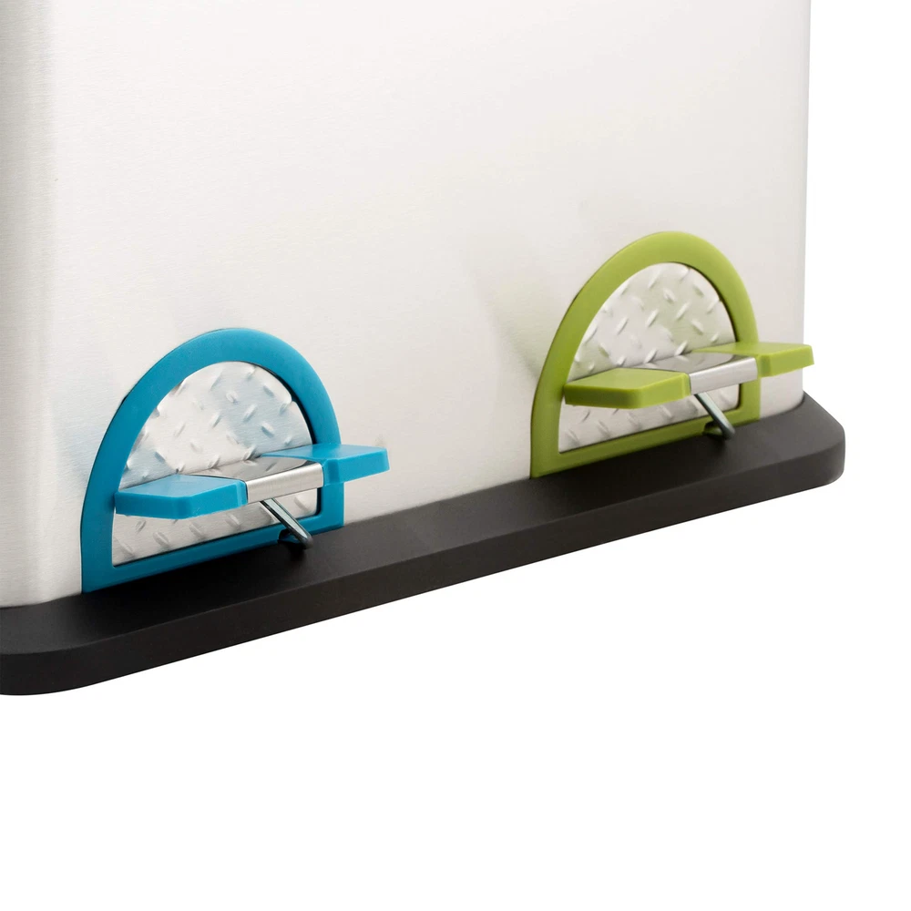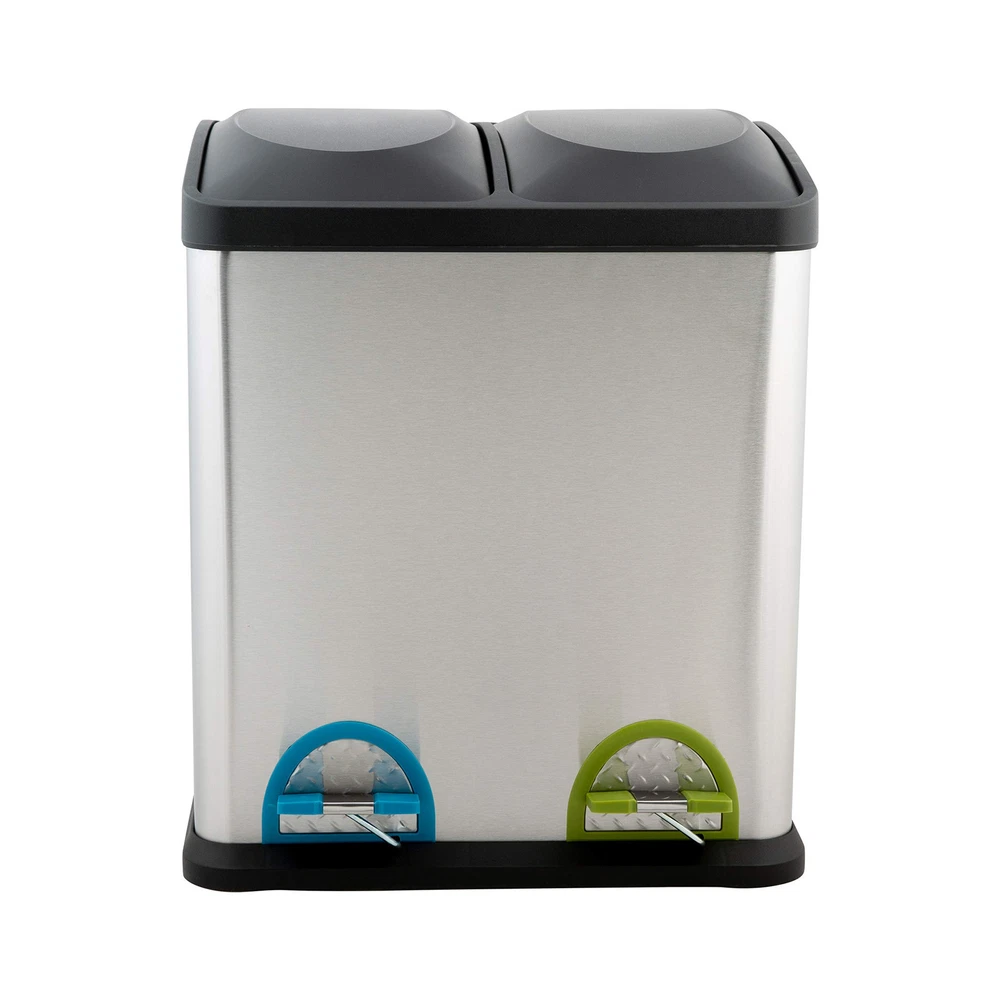 The perfect addition to your kitchen the Stainless Steel Recycle Bin. Designed with 2 compartments to help separate your recycles in one place. The easy step pedal opens and closes the garbage can lid, concealing smells and odors. Holds up to 30 Liters, making it large enough to get you through several days without having to take out the recycles. The sleek stainless steel design blends in with most kitchen decor! Dimensions: 18.4" x 17" x 24" Removable bins Dual Compartments Step Pedals